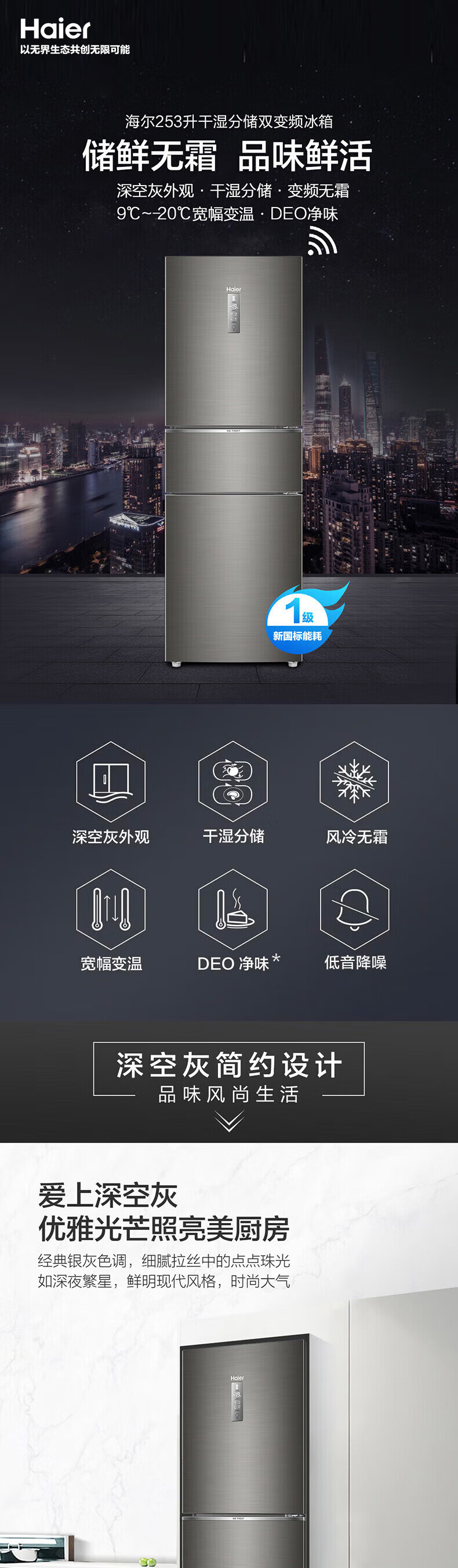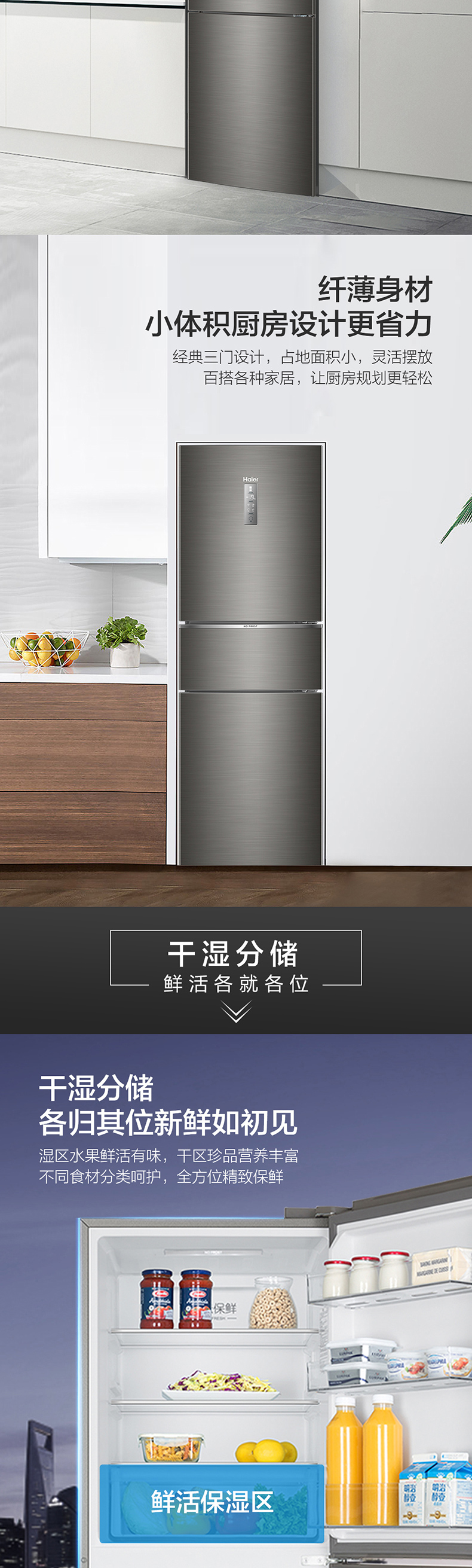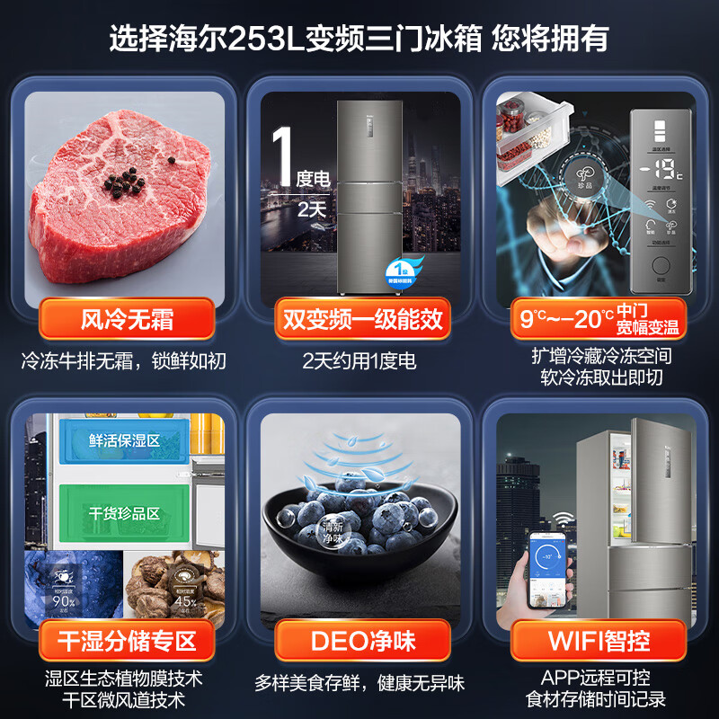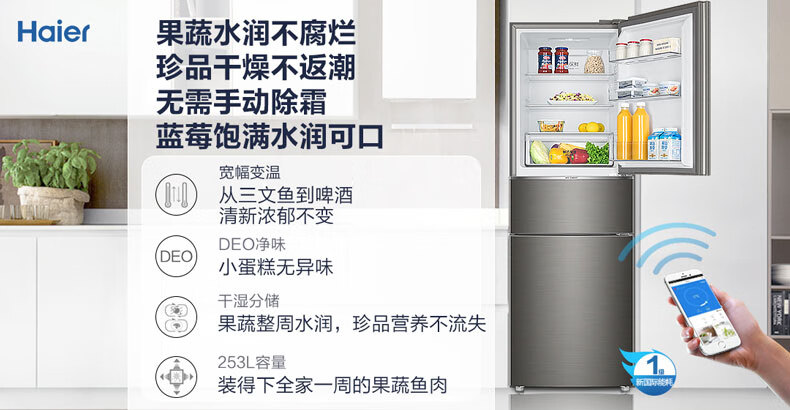 Haier/海尔冰箱三开门253升变频风冷无霜家用电冰箱BCD-253WDPDU1干湿分储/一级能效 匠心工艺 深空灰拉丝外观