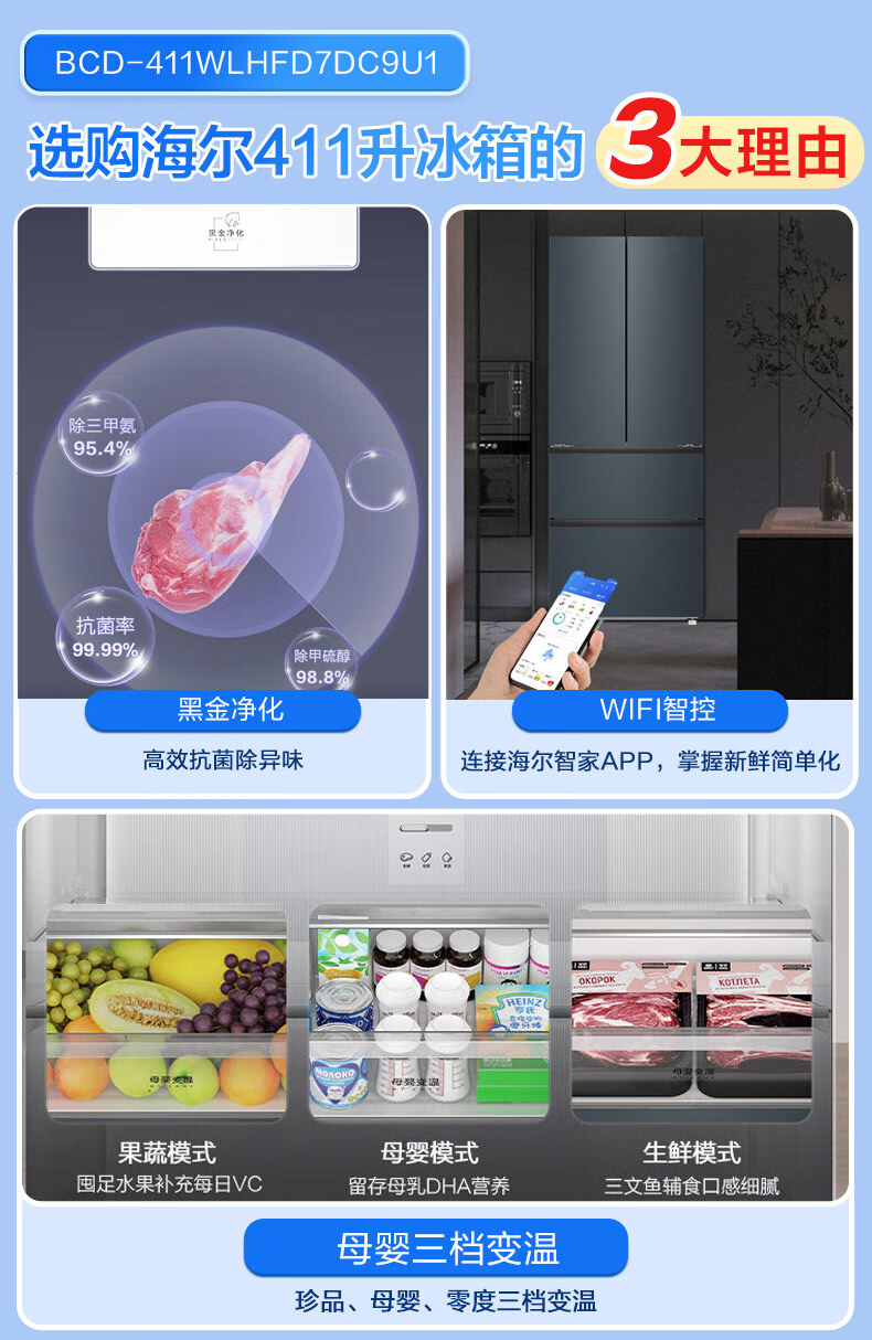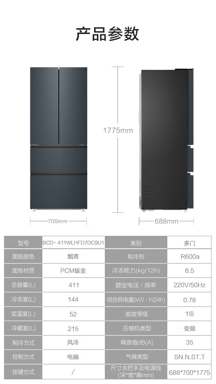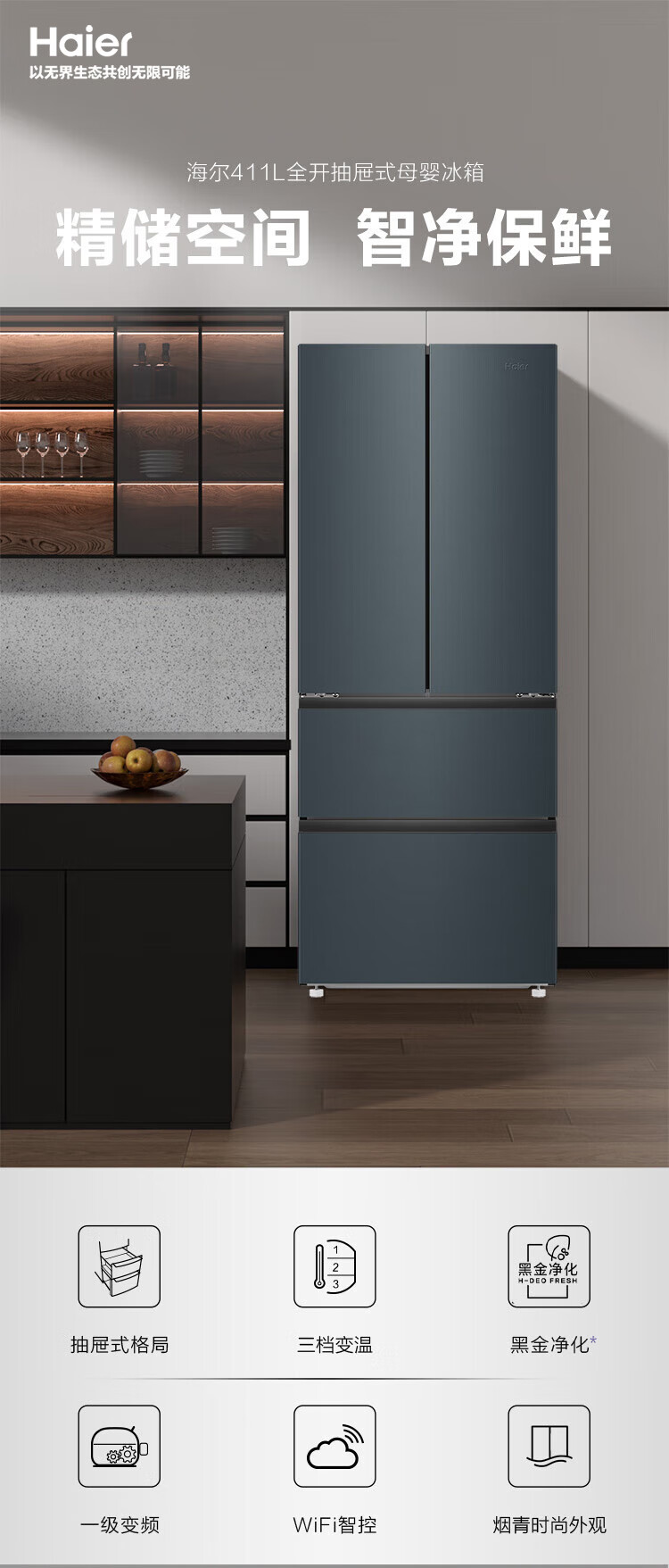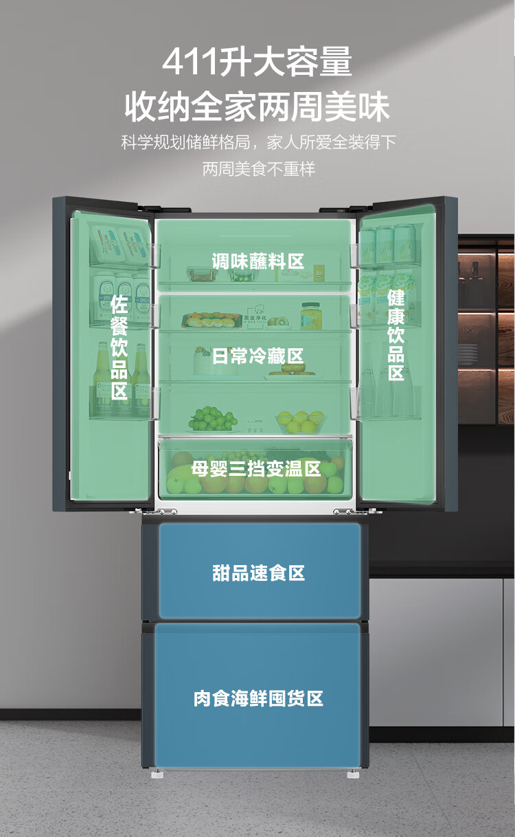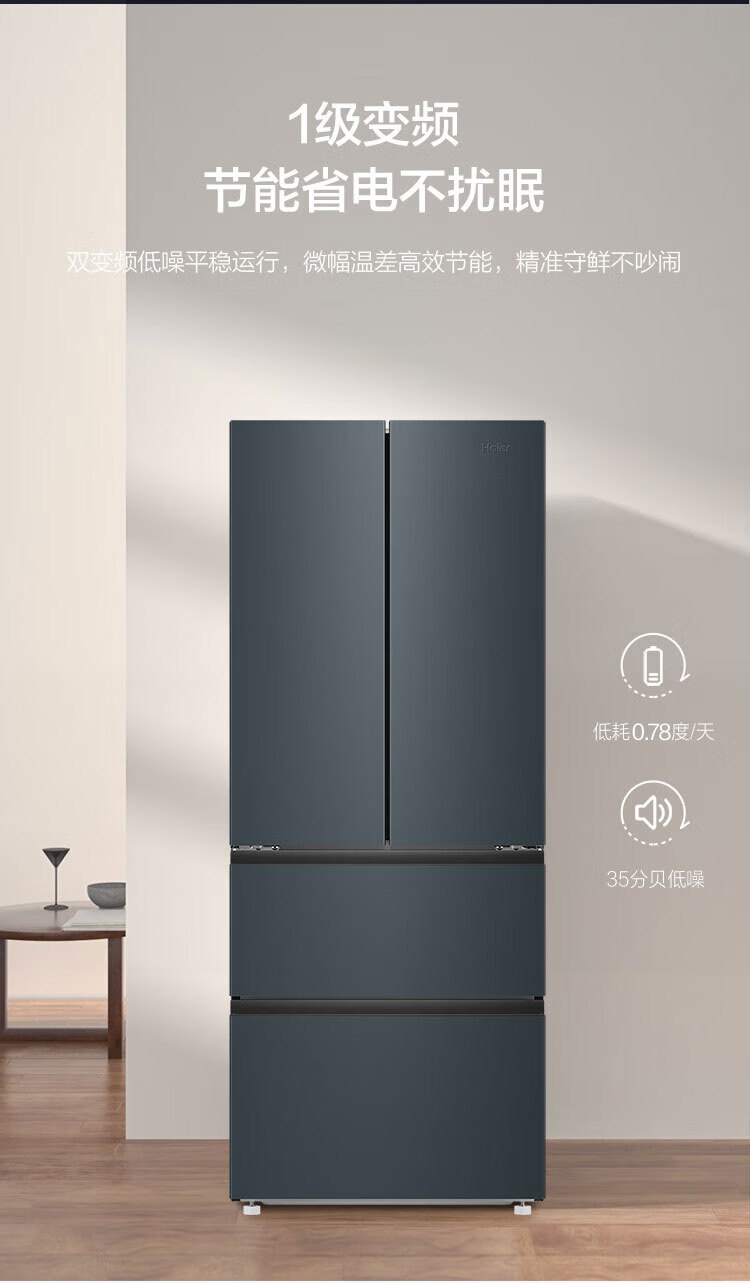 海尔(Haier)海尔冰箱411升法式多门冰箱大容量四开门一级变频风冷无霜家用电冰箱超薄嵌入冰箱 BCD-411WLHFD7DC9U1