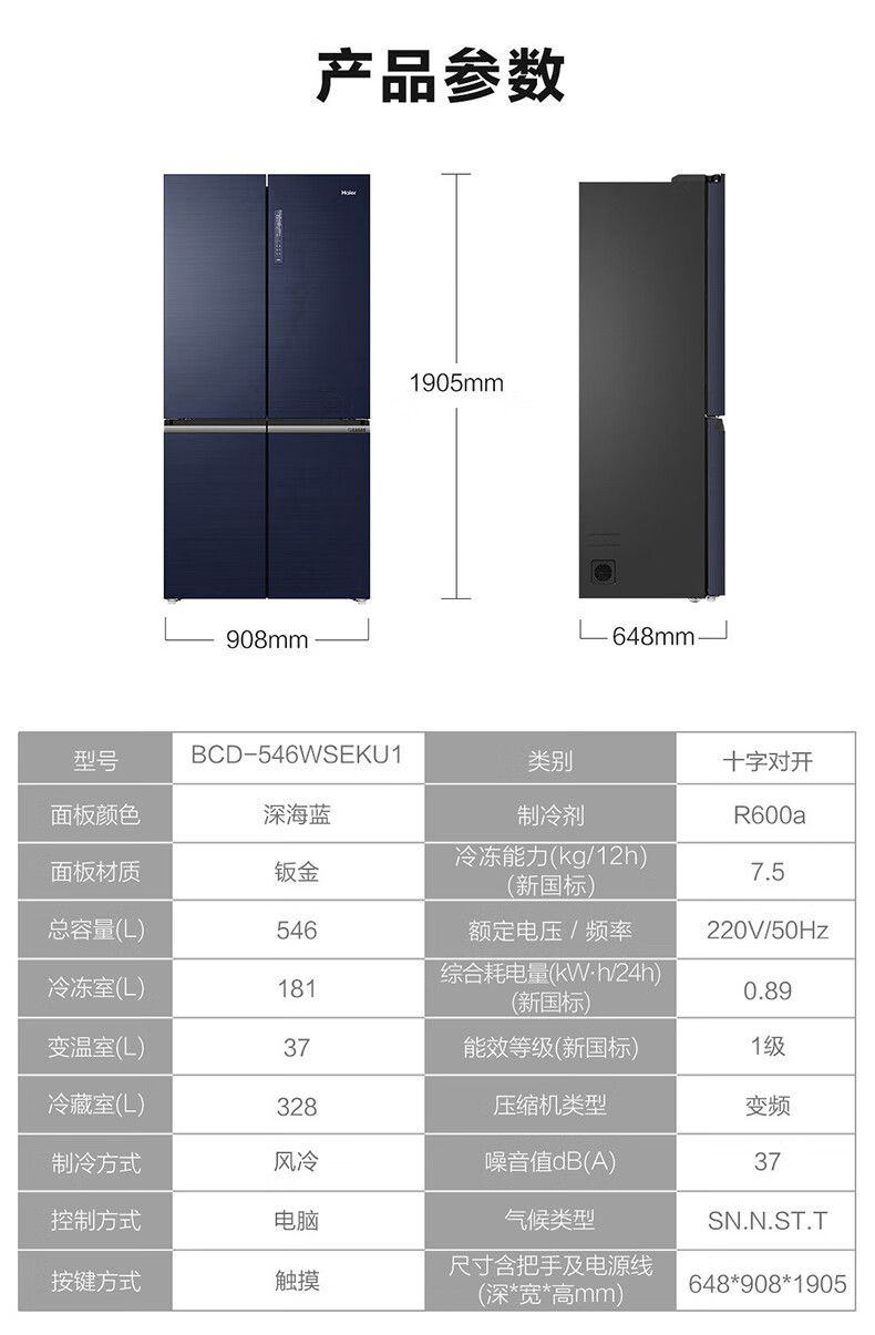 海尔(Haier)全空间保鲜科技海尔Haier冰箱546L十字对开双开门四开门超薄嵌入一级能效干湿分储大容量家用冰箱 BCD-546WSEKU1