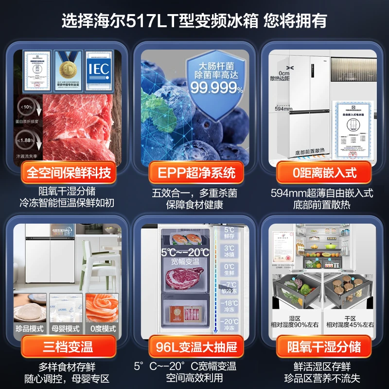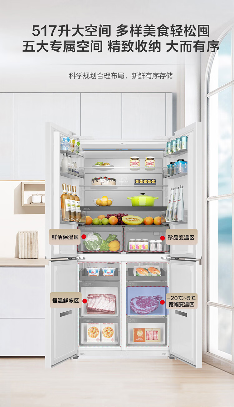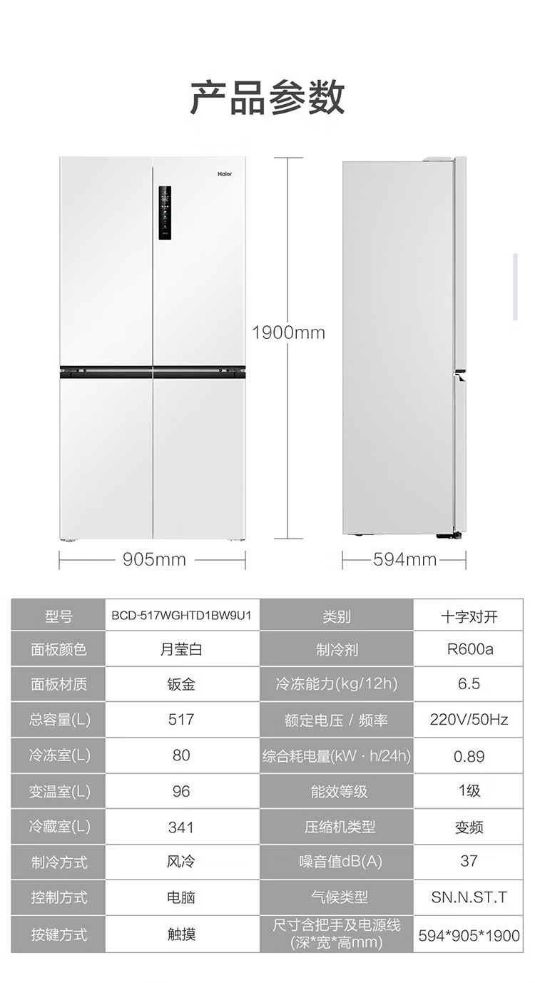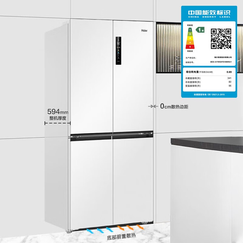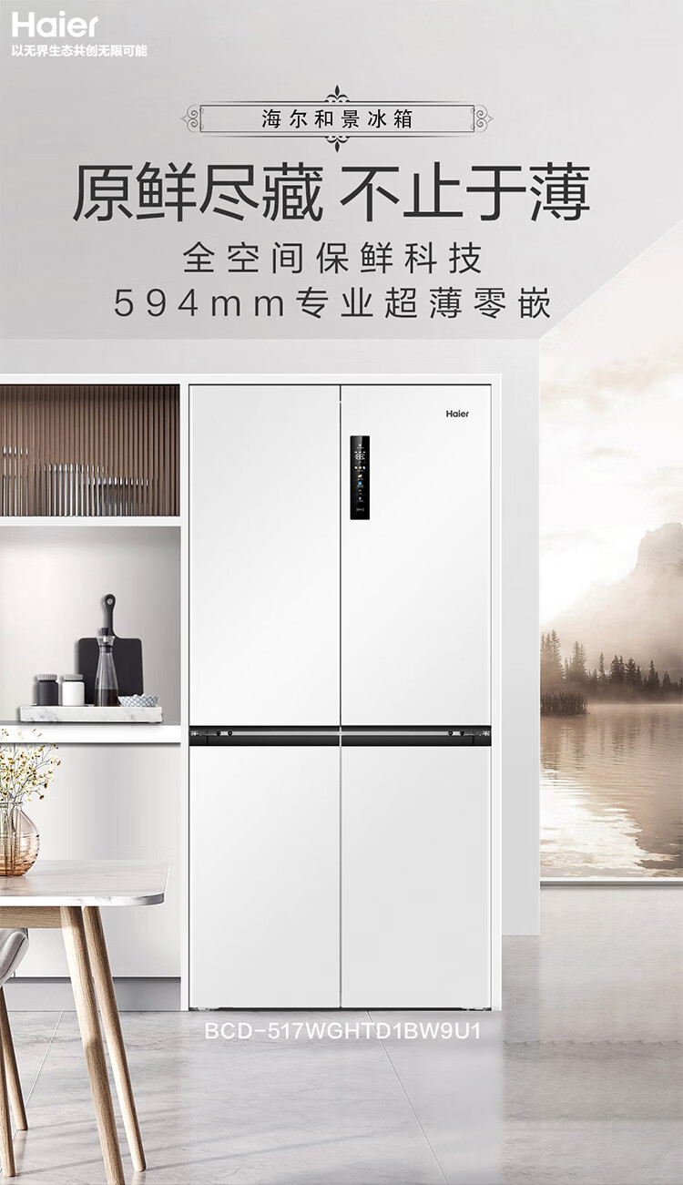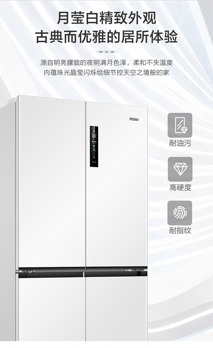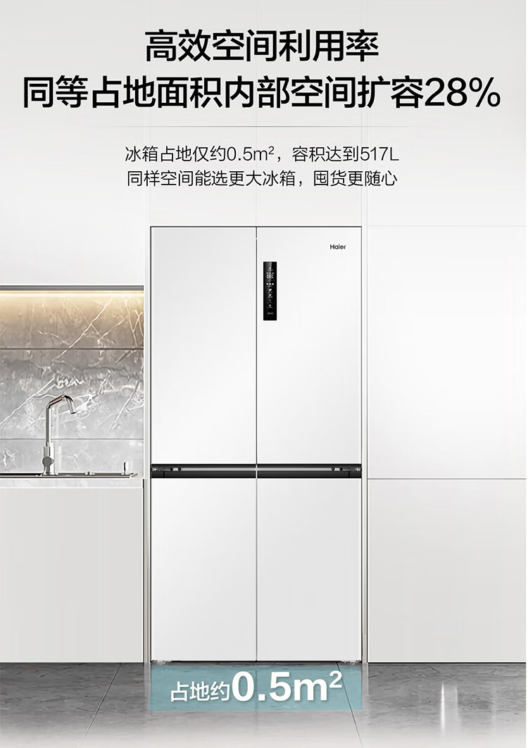 海尔(Haier)0cm边距海尔和景冰箱517升十字门超薄零距离自由嵌入式冰箱全空间保鲜EPP超净干湿分储区月莹白