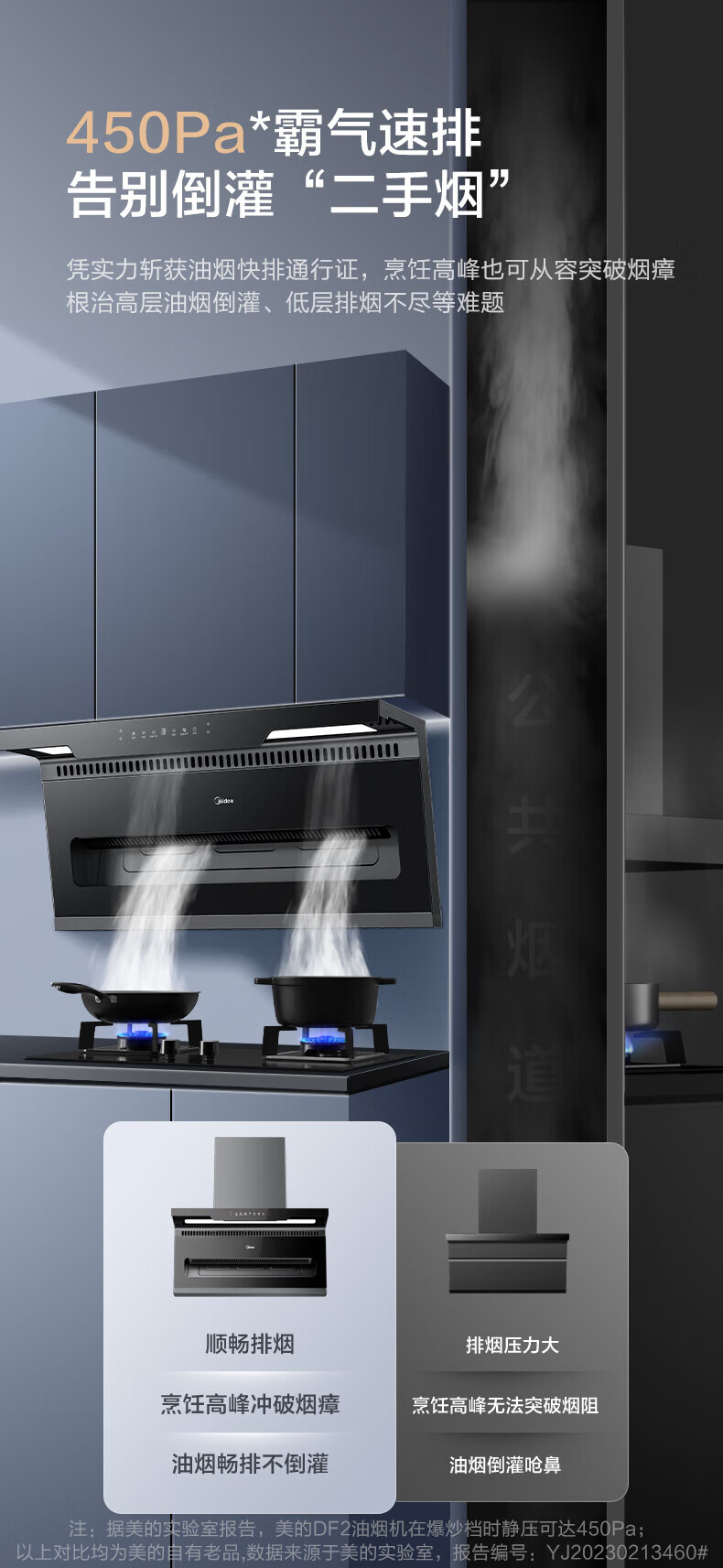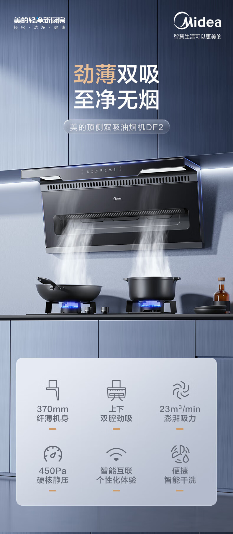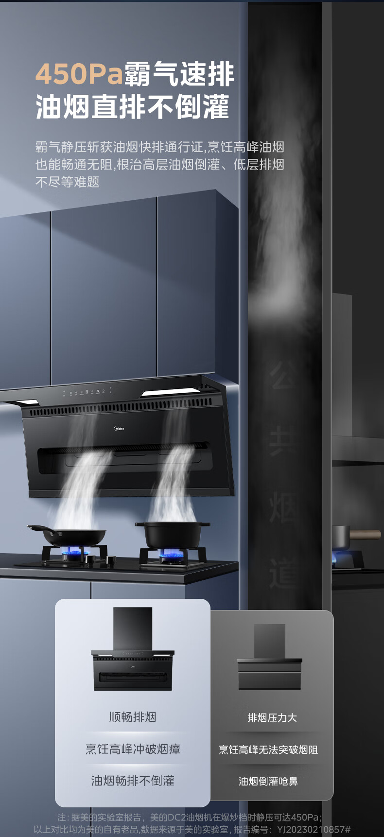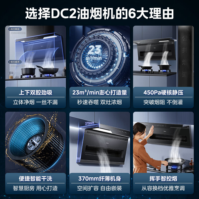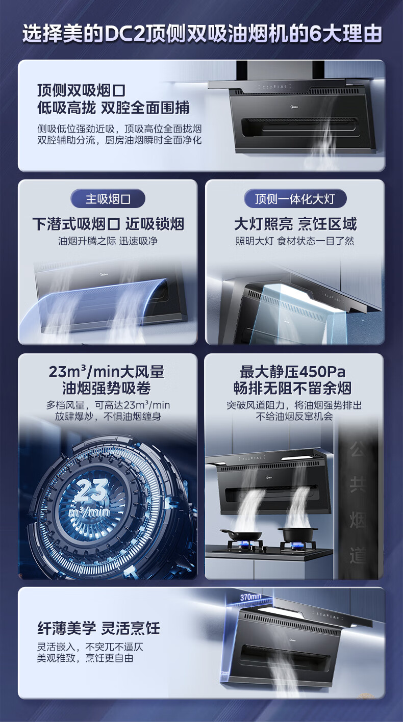 美的(Midea)顶侧双吸纤薄双腔抽油烟机23立方大吸力自清洗厨房家用吸油烟机7字型DC2大风量排烟机烟灶套装 【单烟机】大风力自清洁油烟机DC2