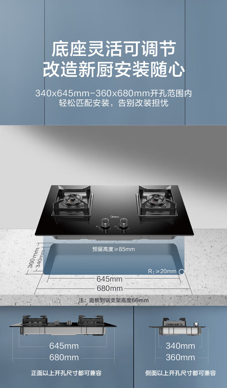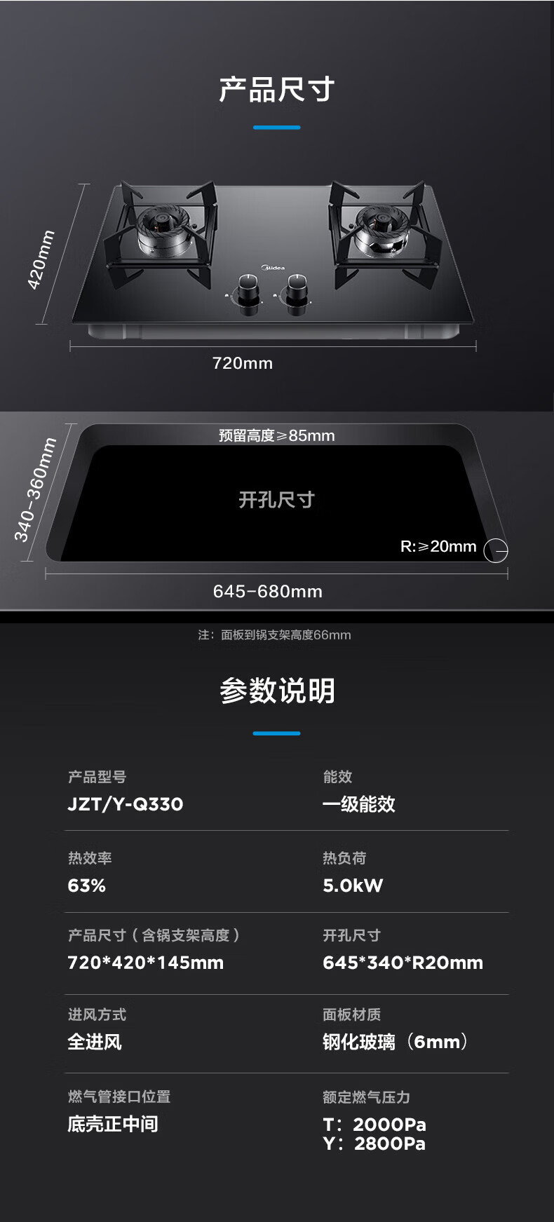 • 灶具开孔尺寸: 长642mm;宽340mm;高20mm