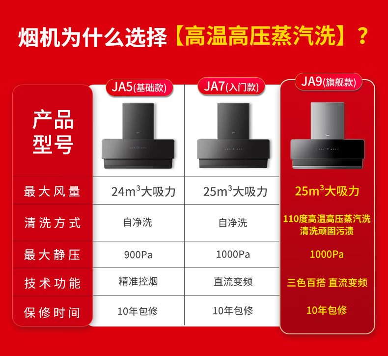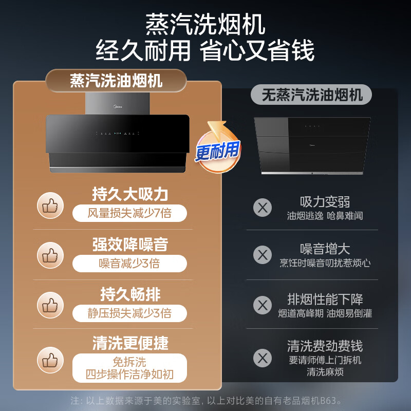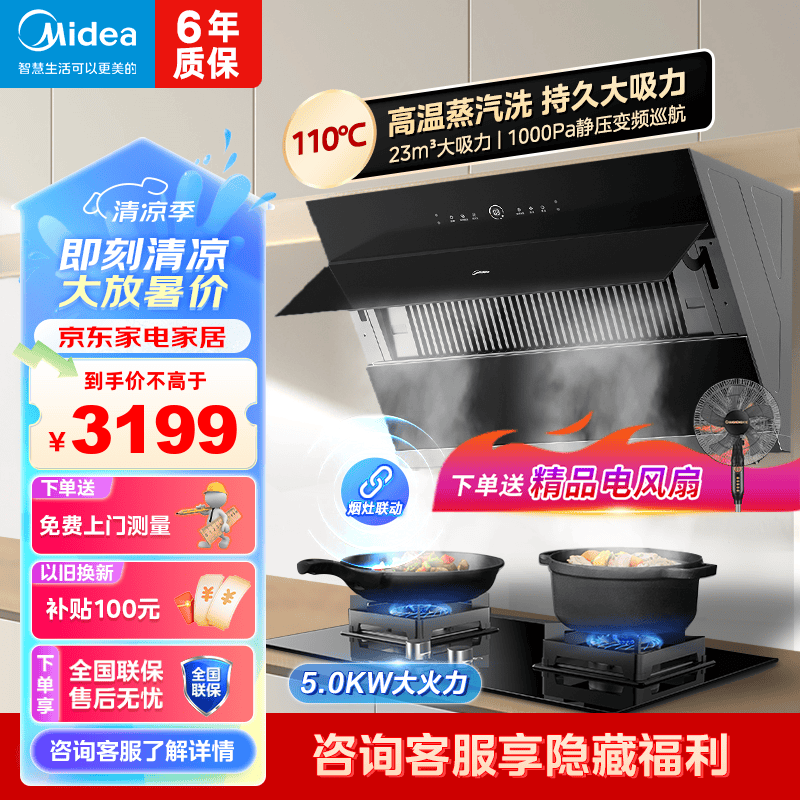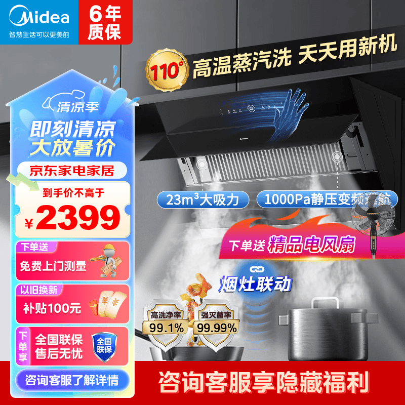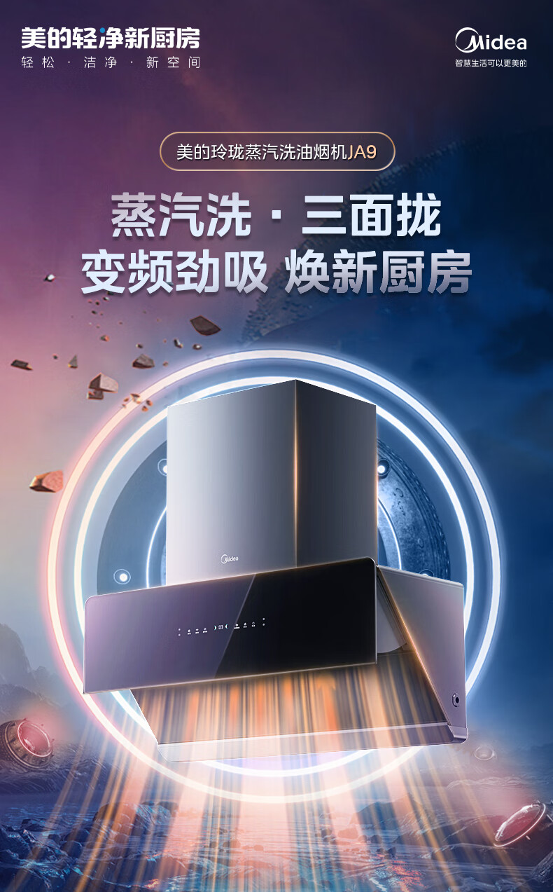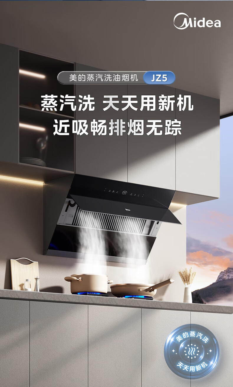 美的(Midea)高温蒸汽洗平嵌橱柜变频1000pa家用侧吸式抽油烟机23/25大吸力自清洗吸油烟机 厨房脱排油烟机 25m³大风力排烟机JA9