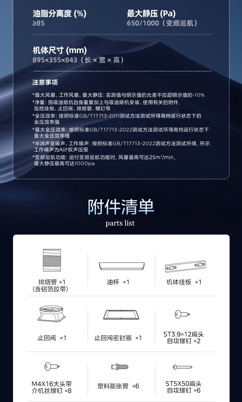 • 烟机外机尺寸: 长895mm;宽355mm;高843mm