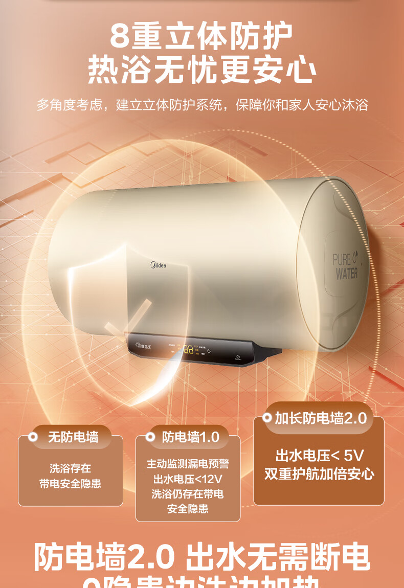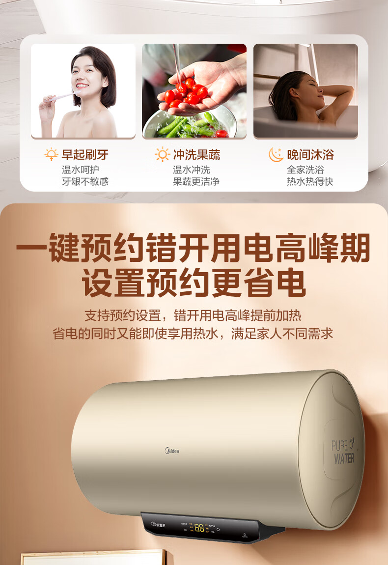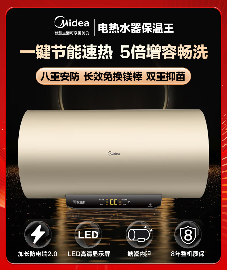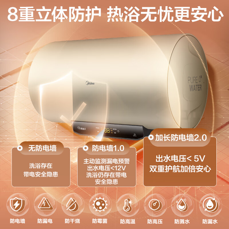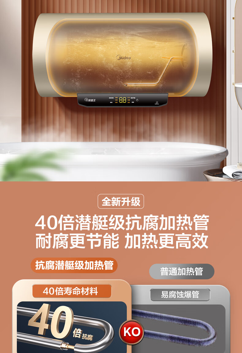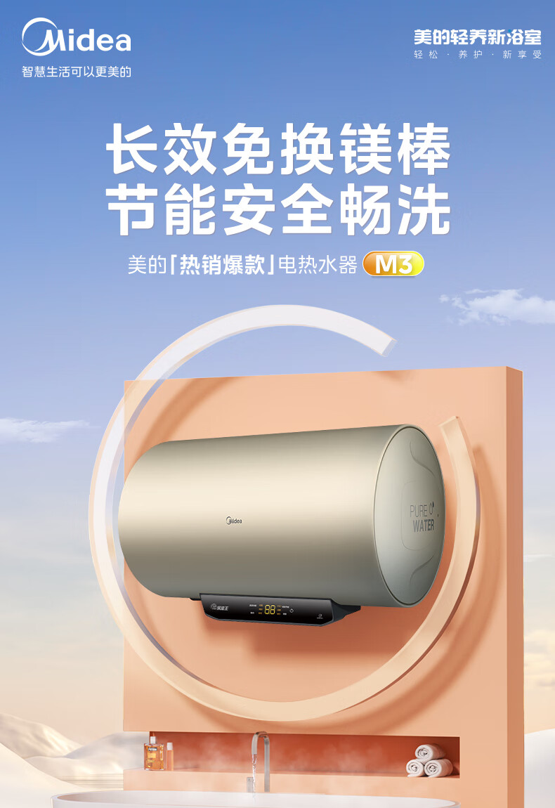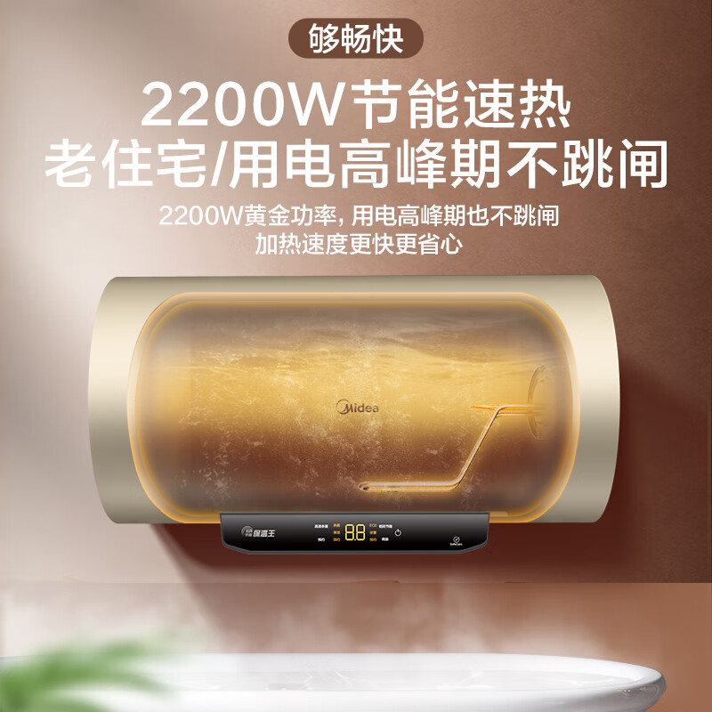美的(Midea)2200W节能省电大水量家用长效免换镁棒储水式速热安全洗澡加长防电墙保温6重安防 M3 50L 2200W 【性价比TOP款】