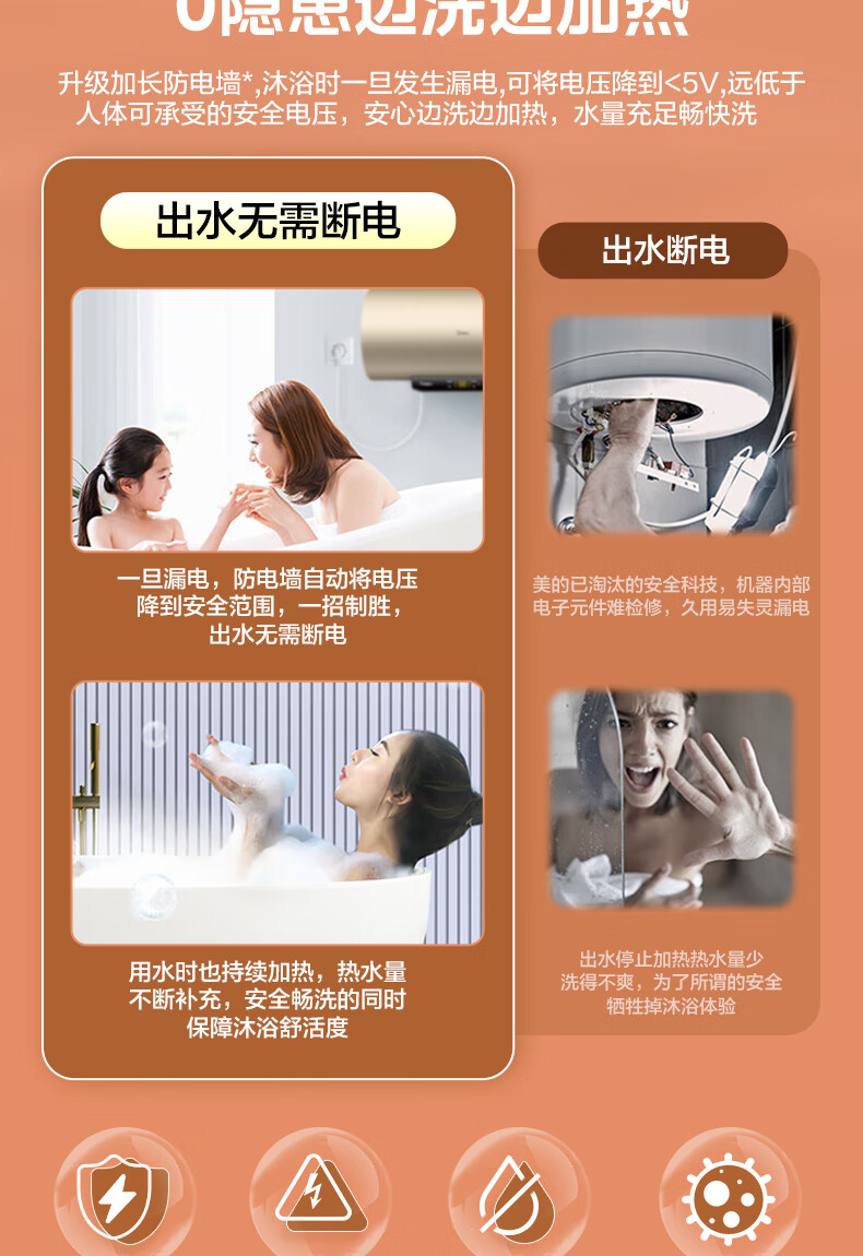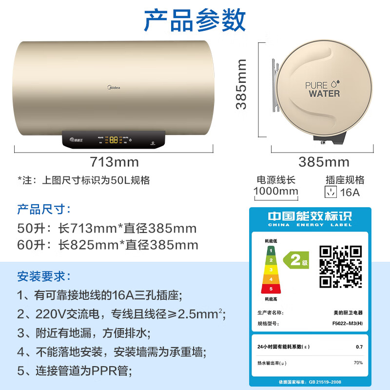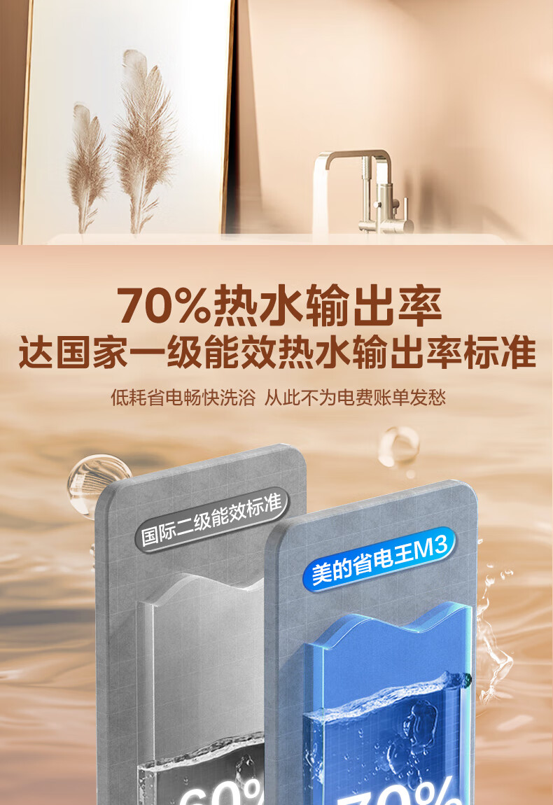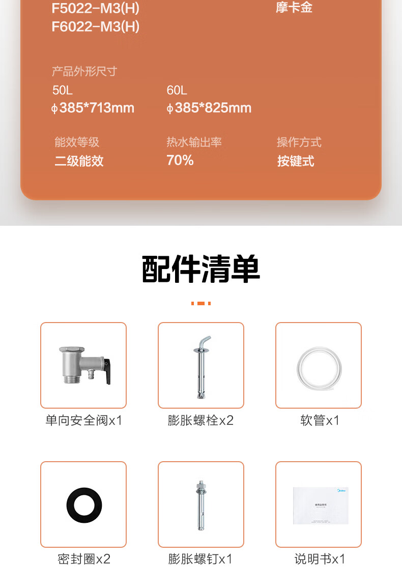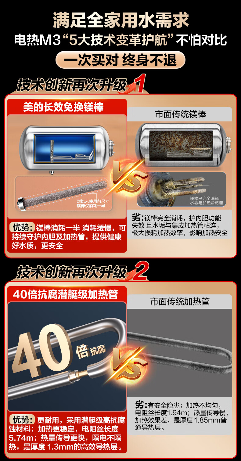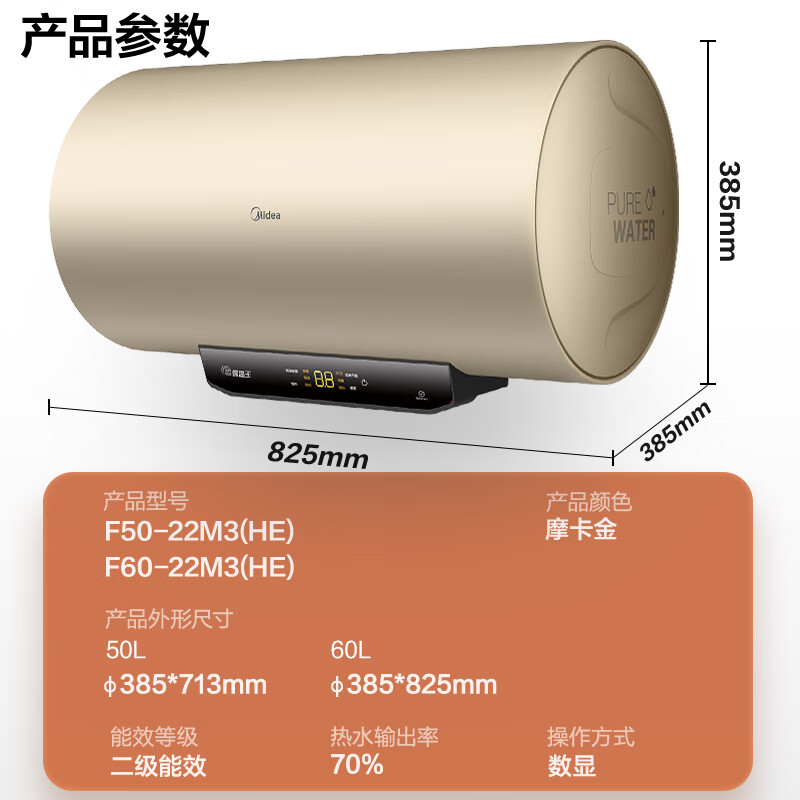 美的(Midea)2200W节能省电大水量家用长效免换镁棒储水式速热安全洗澡加长防电墙保温6重安防 M3 50L 2200W 【性价比TOP款】