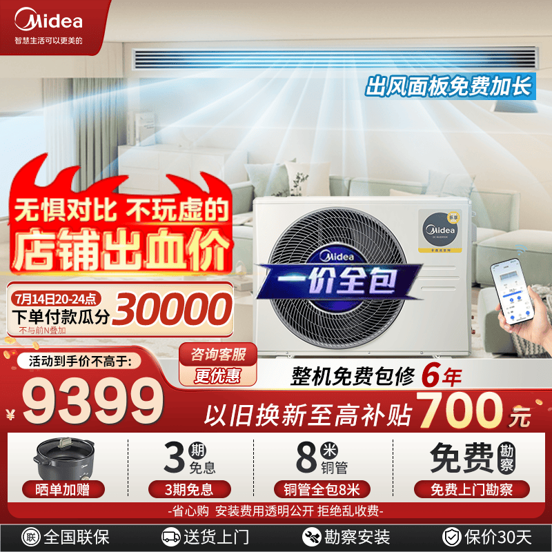 美的乐享三代3匹风管机一级能效3代85风管机4匹72中央空调一拖一变频嵌入式智能空调 节能省电 3匹 一级能效