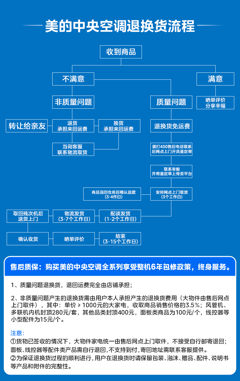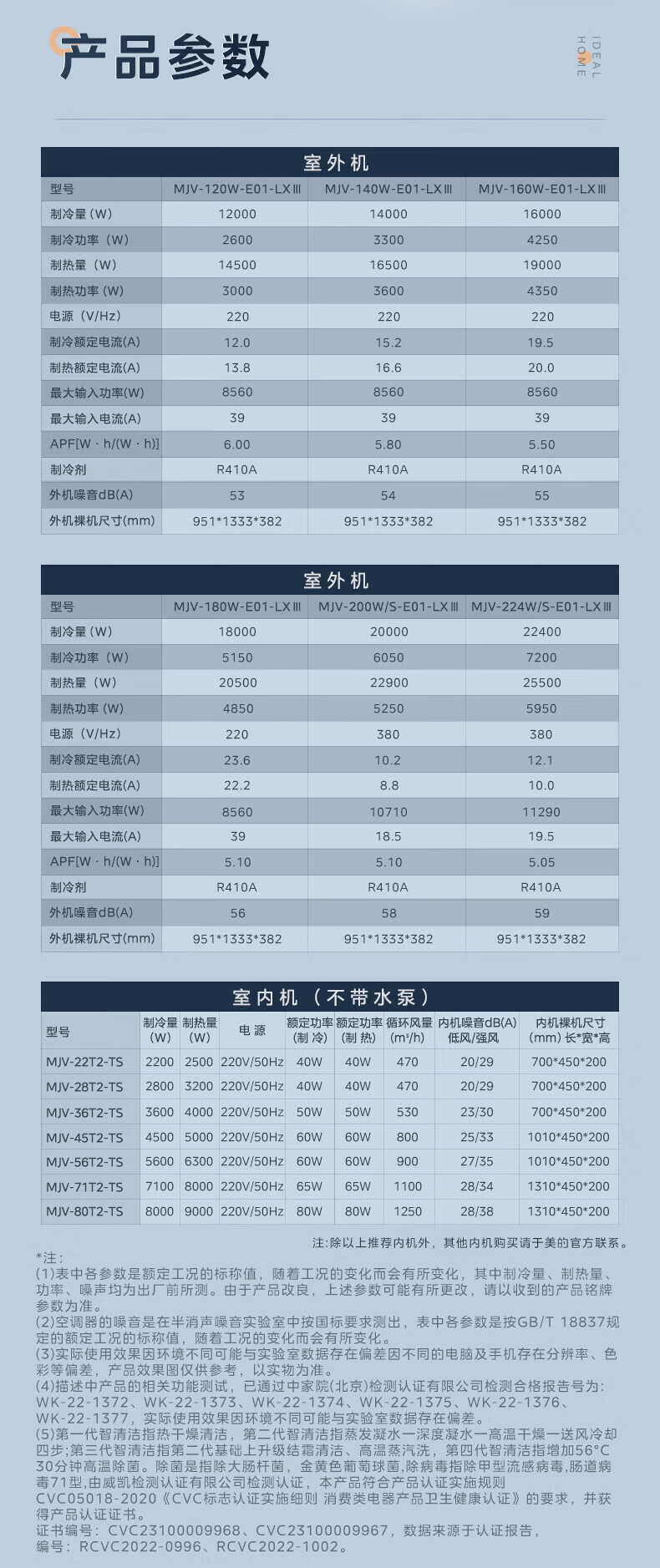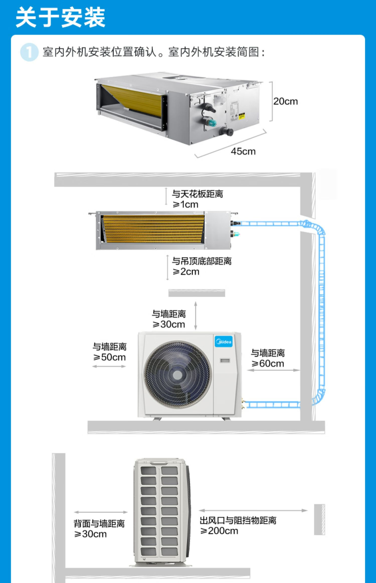 • 包装清单: 室外机安装说明书*1,室外机使用说明书*1,室内使用说明书*1,中央空调服务指南*1,美的家庭中央空调安装竣工报告书*1,出水管接管*1,网络匹配线组*2,过胶线圈*2,密封圈*1,L型管*1,连接1