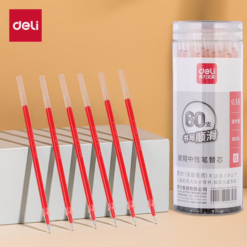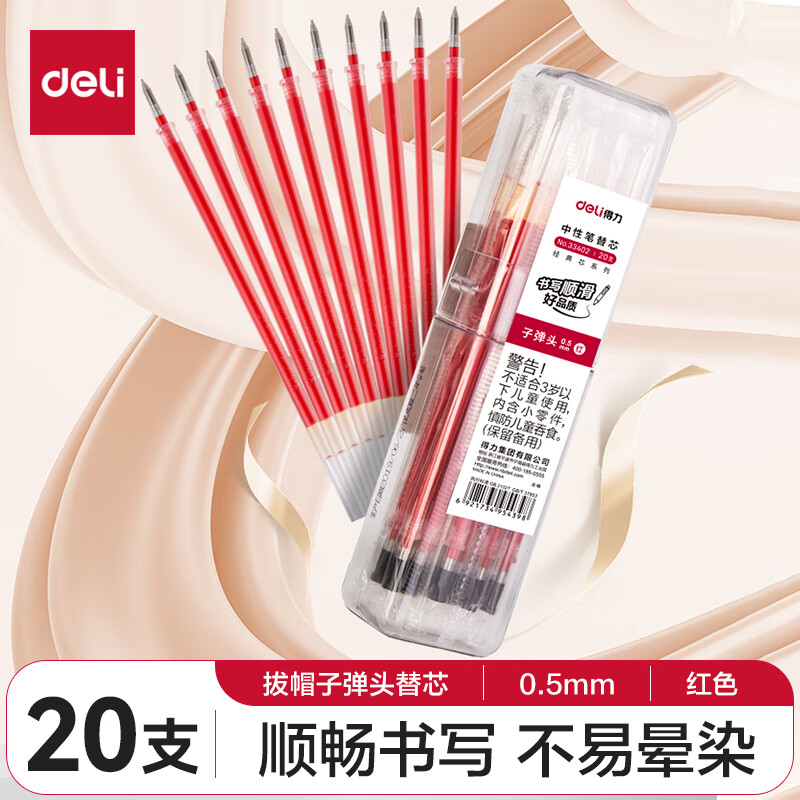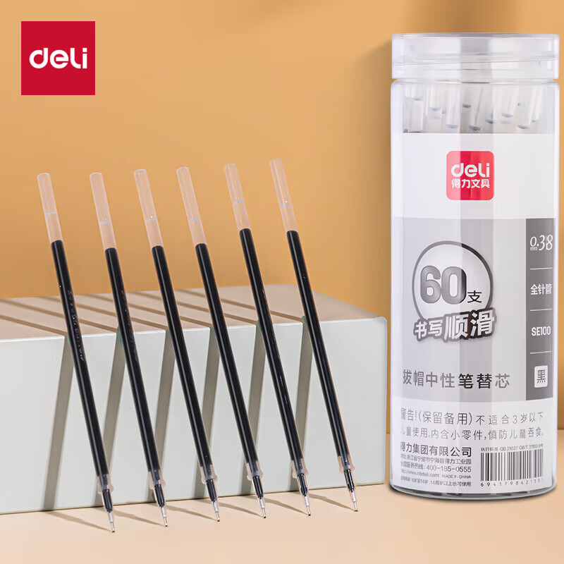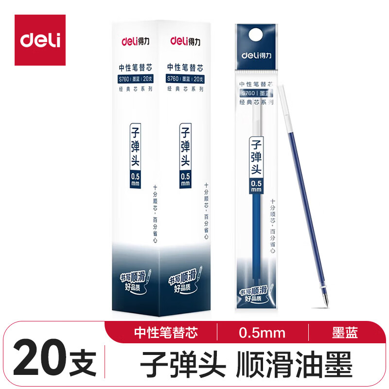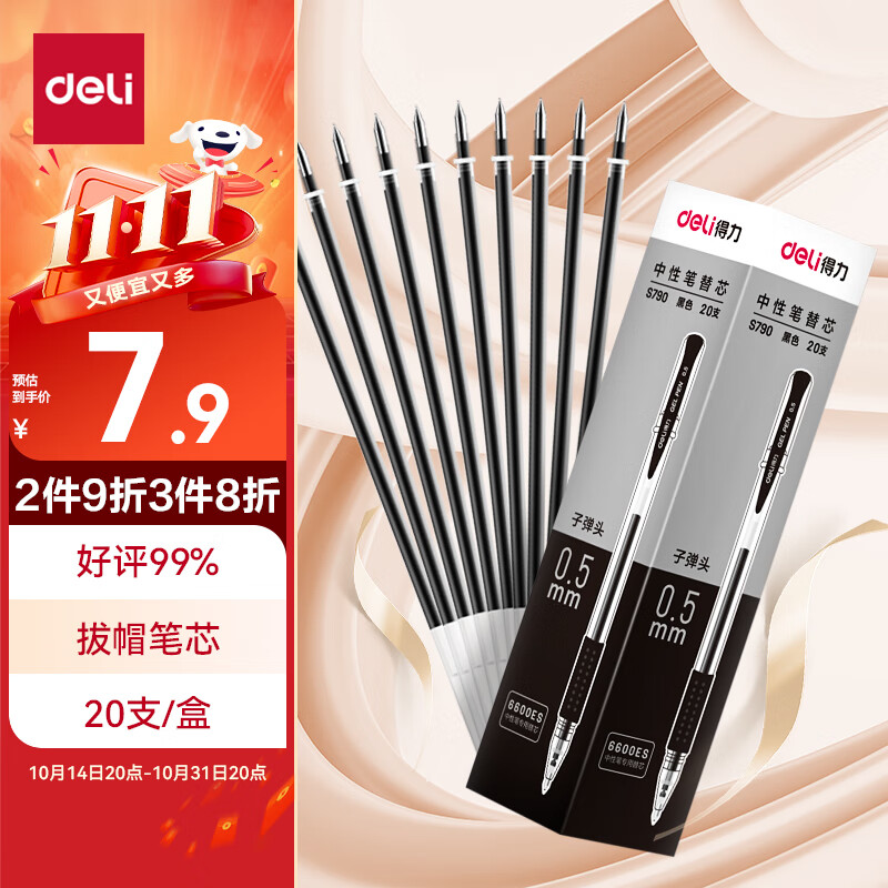 得力(deli)0.5mm中性笔芯签字笔水笔替芯 6600/33109/Q7适用 办公用品 子弹头黑色20支/桶33402