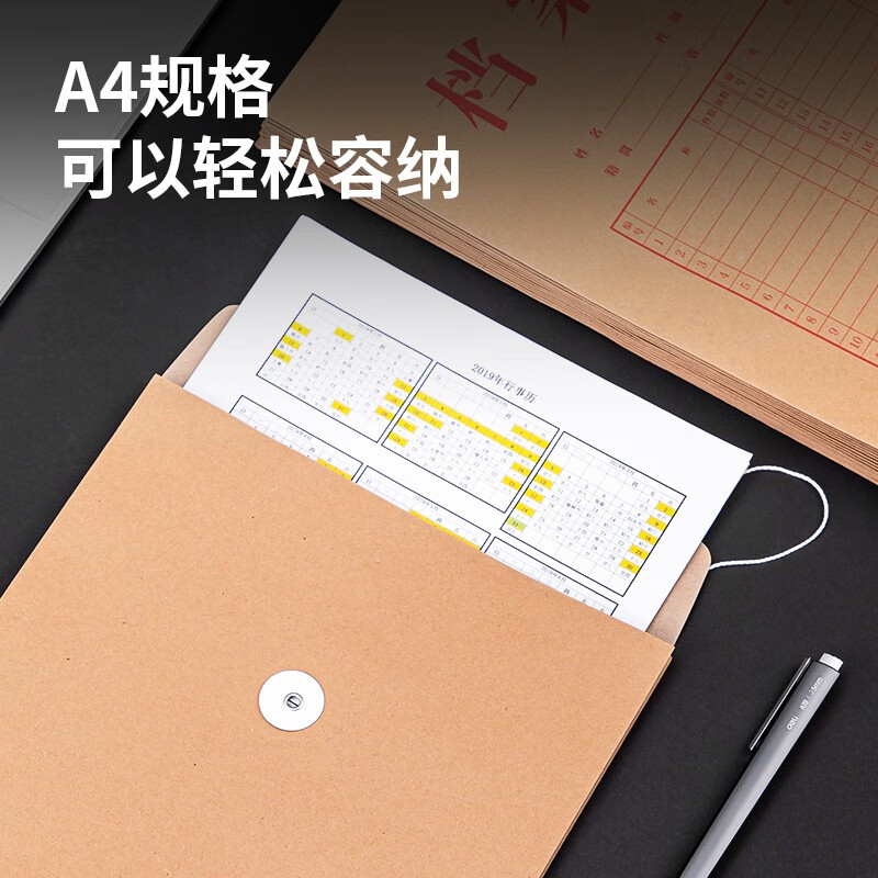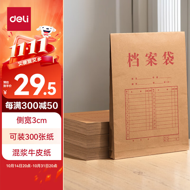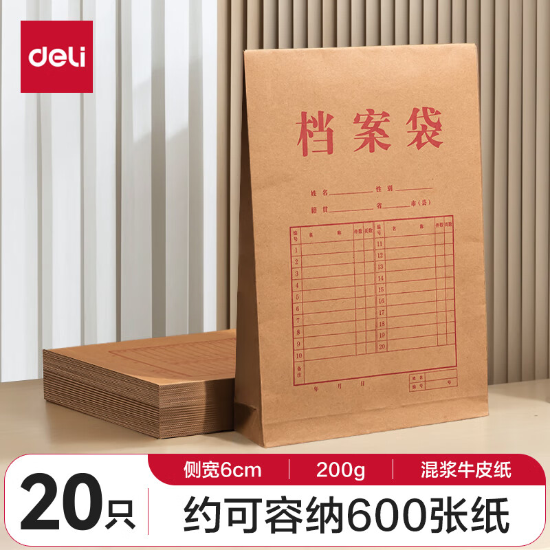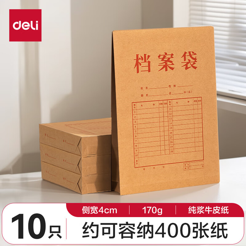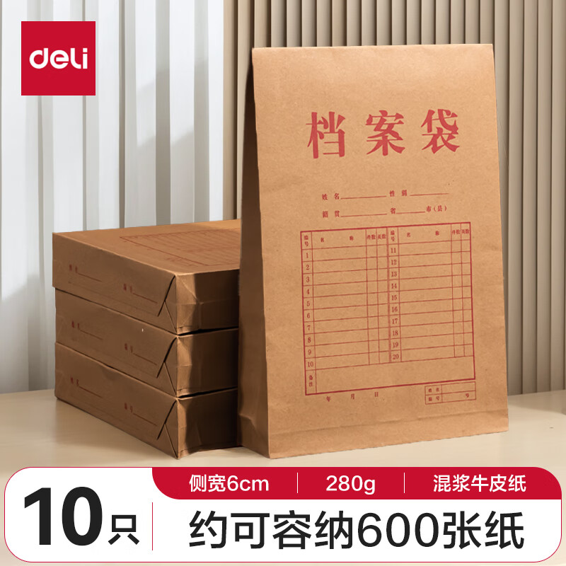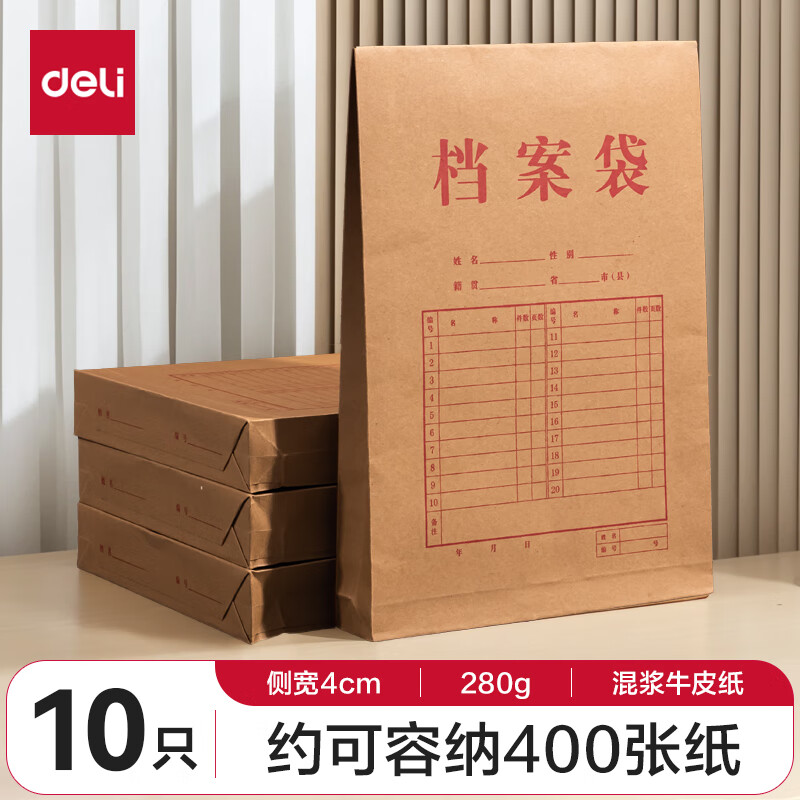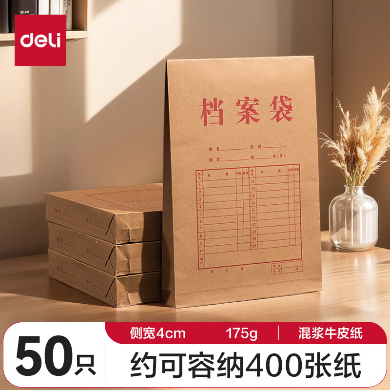 【超级爆款】得力(deli)50只A4混浆175g牛皮纸档案袋礼品袋 侧宽4cm 标书合同文件资料袋 33474
