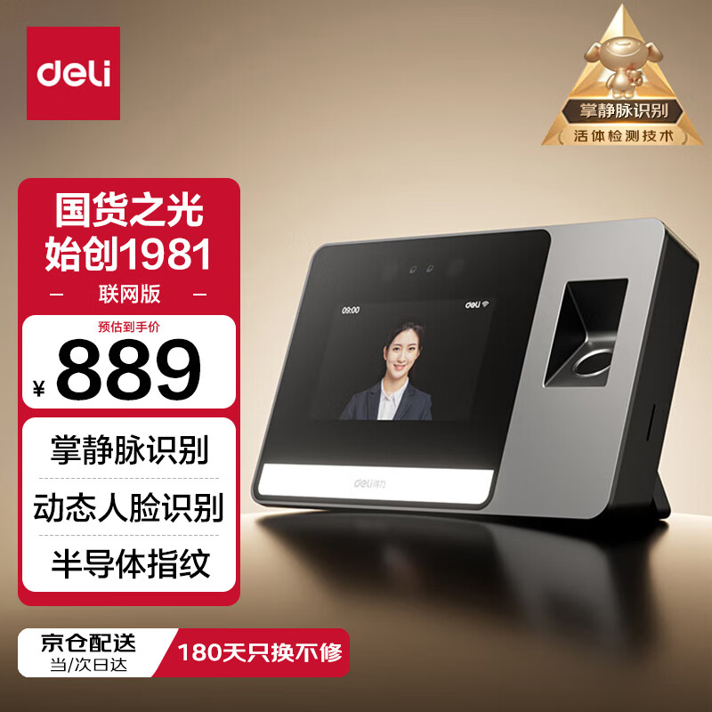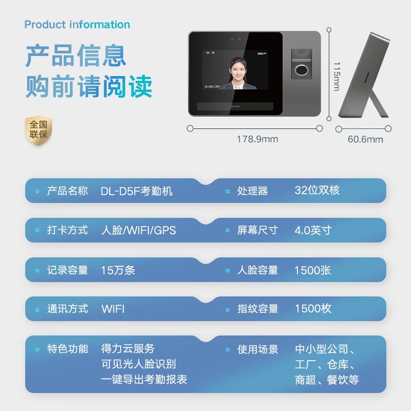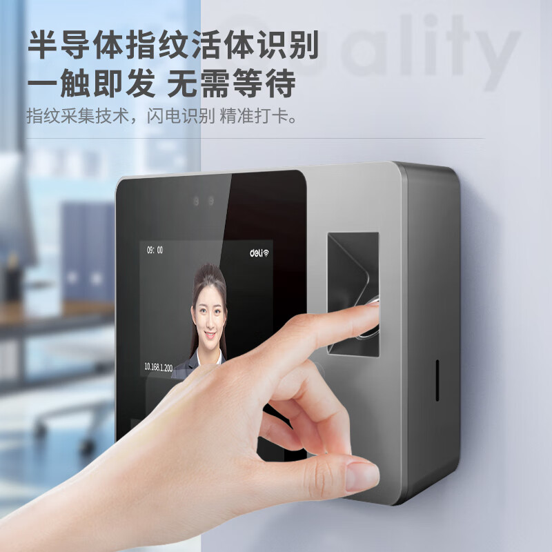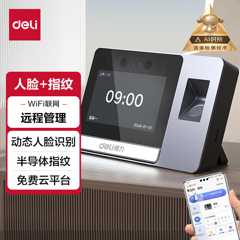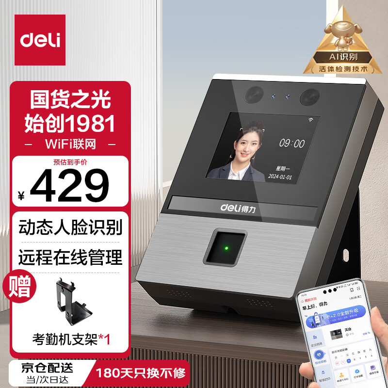 得力智能云考勤机 可见光动态人脸 打卡机人脸+指纹识别 4英寸大屏 wifi联网 远程在线管理 DL-D5F