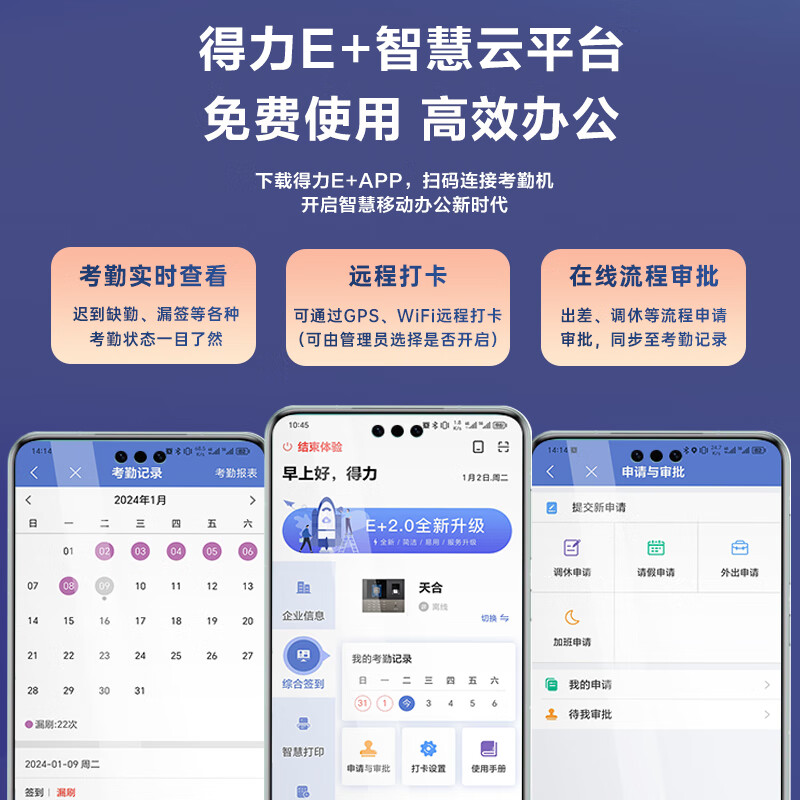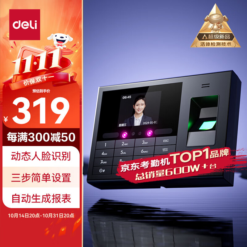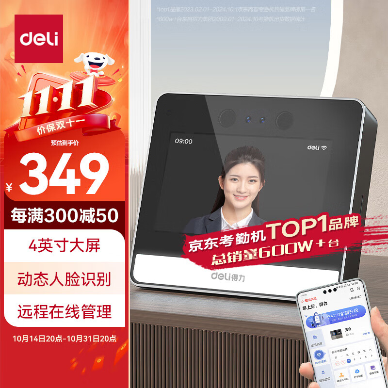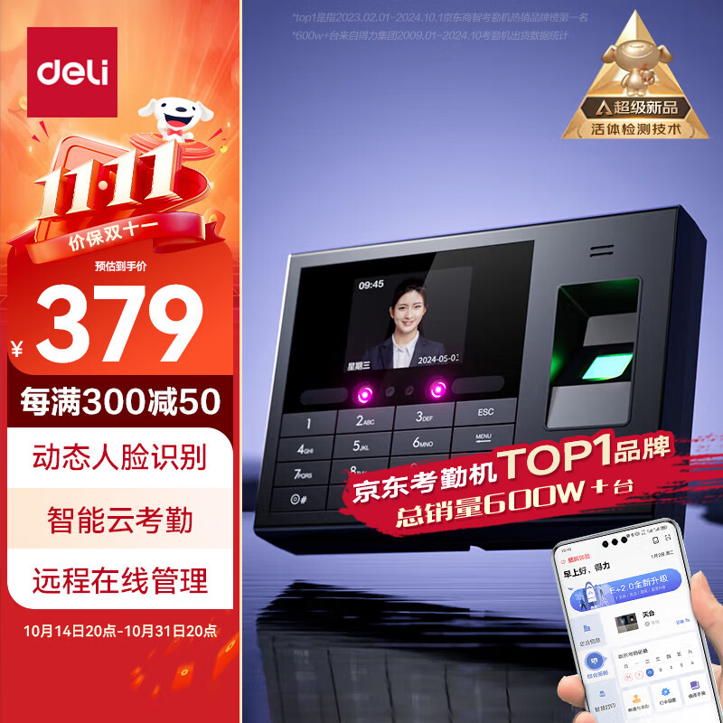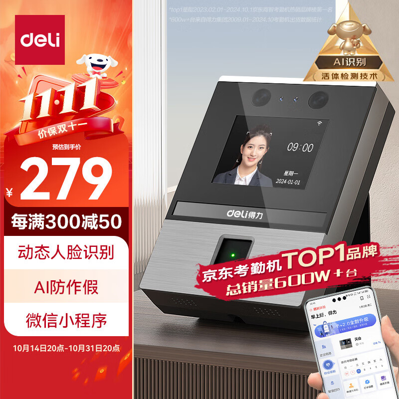 得力智能云考勤机 可见光动态人脸 打卡机人脸+指纹识别 4英寸大屏 wifi联网 远程在线管理 DL-D5F