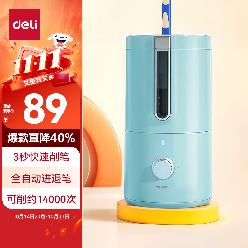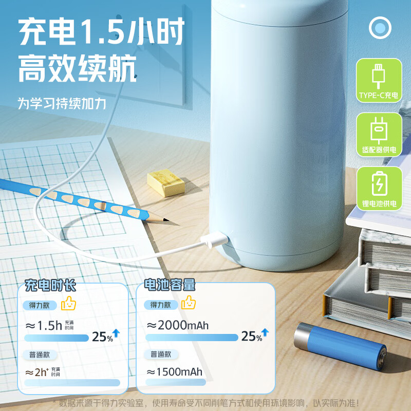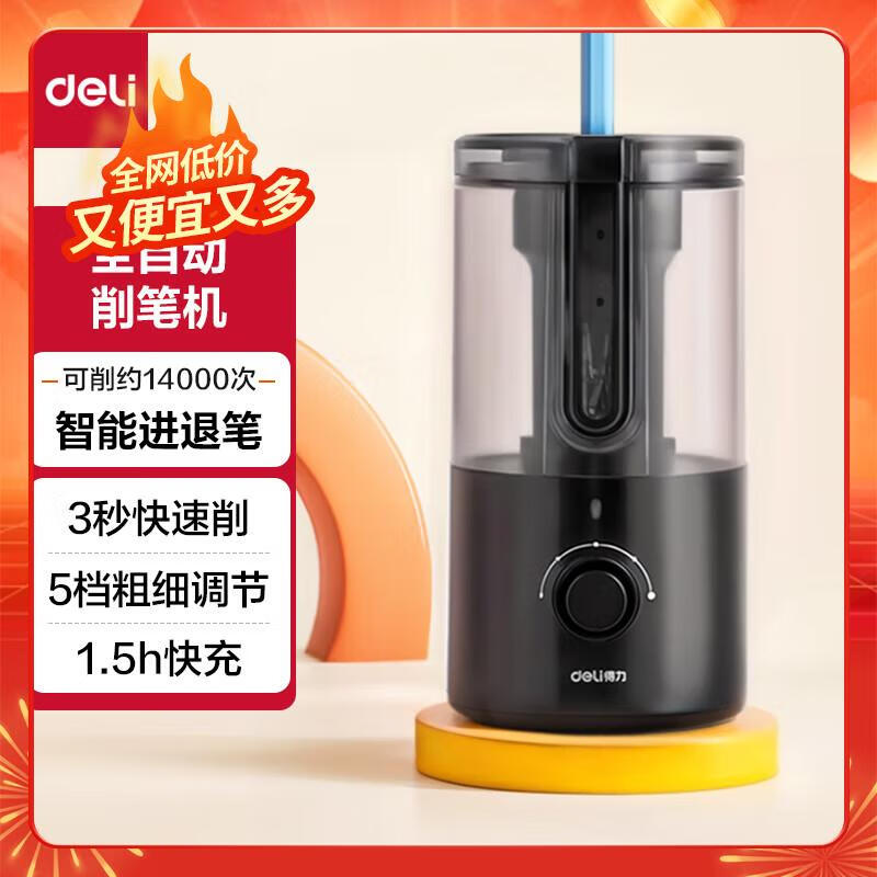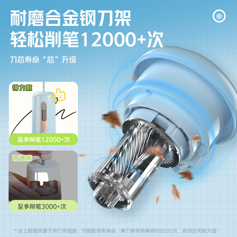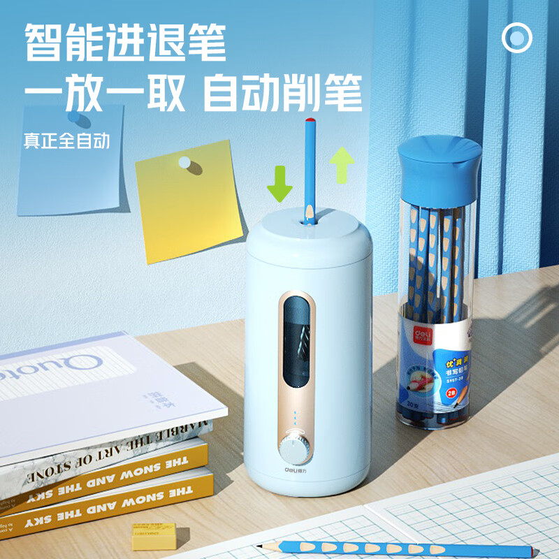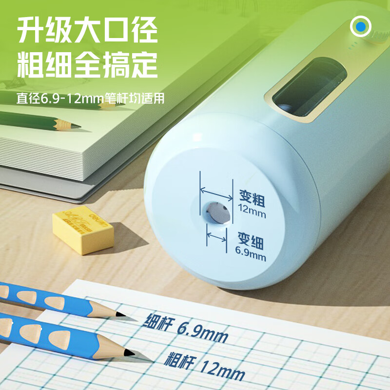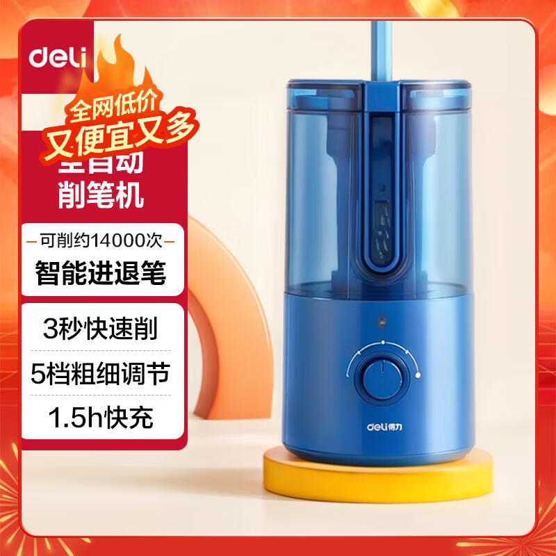得力大口径全自动削笔器小学生开学文具电动削笔机12mm粗杆大三角铅笔儿童转笔刀卷笔刀蓝色