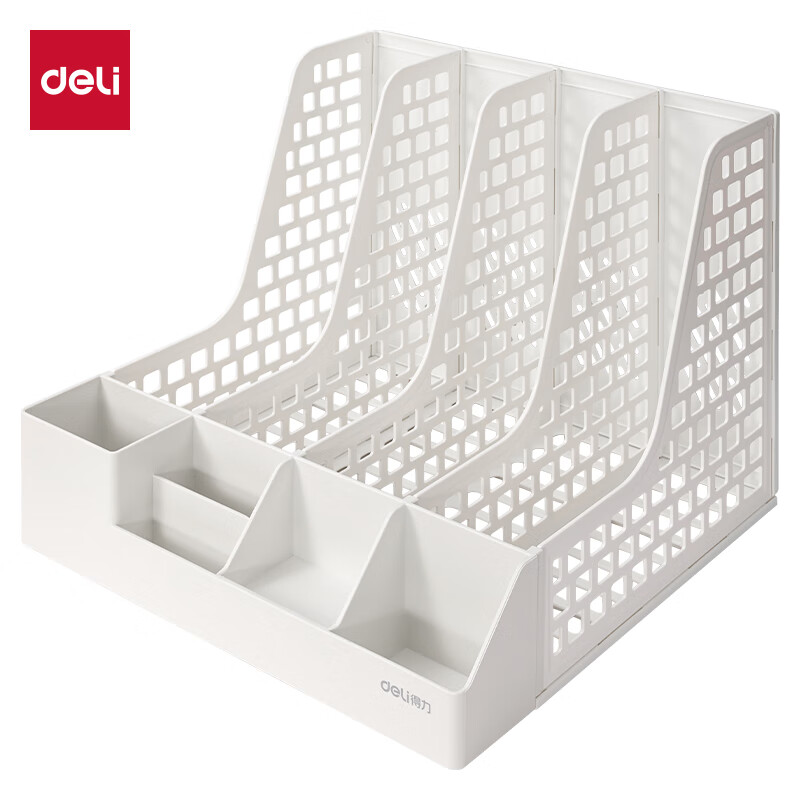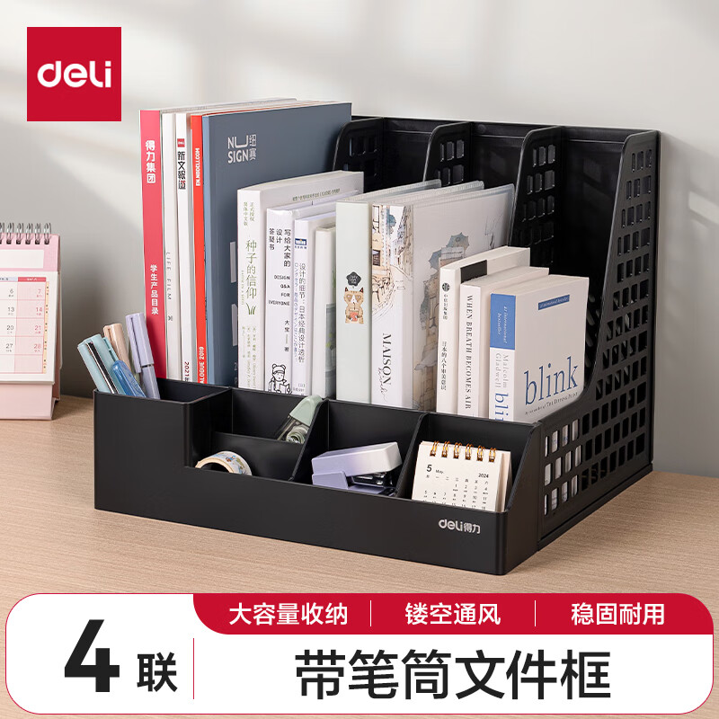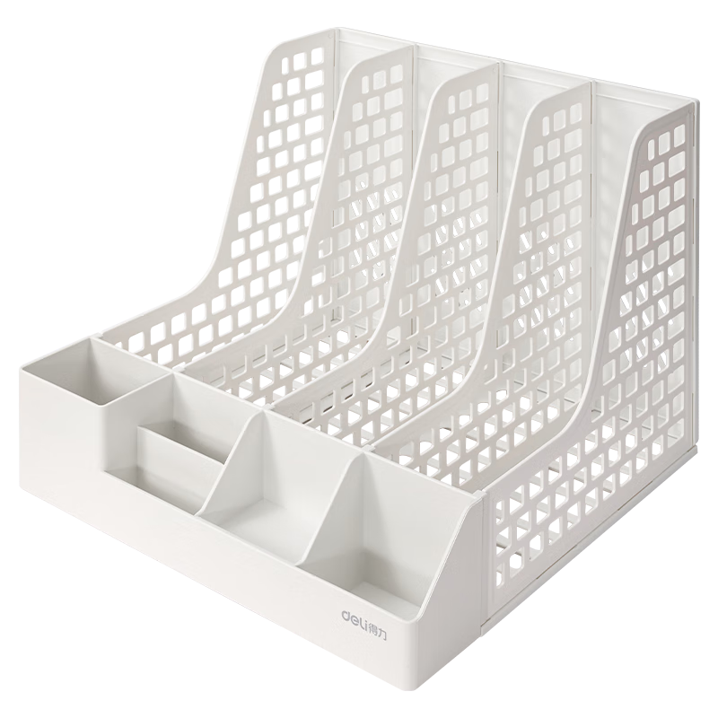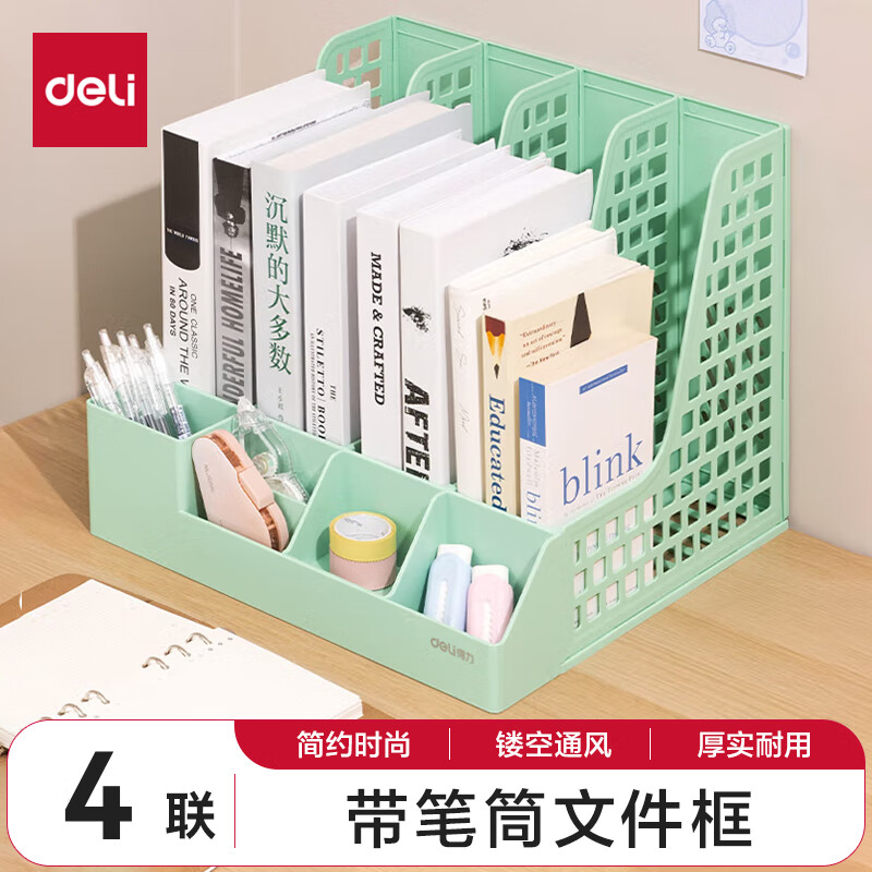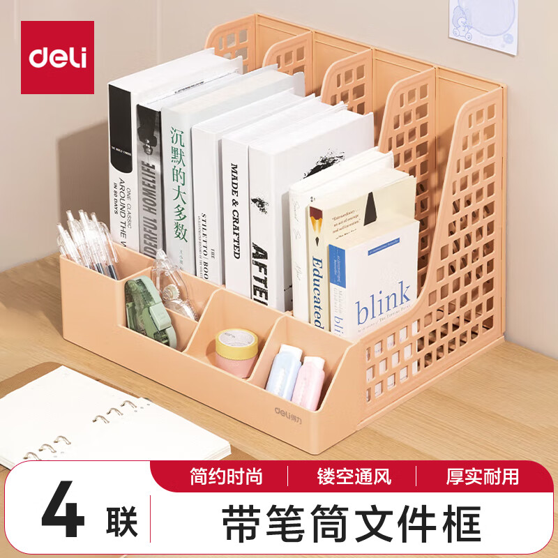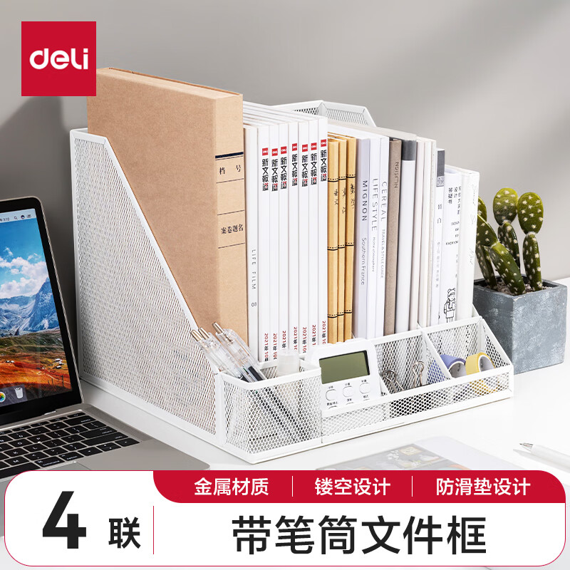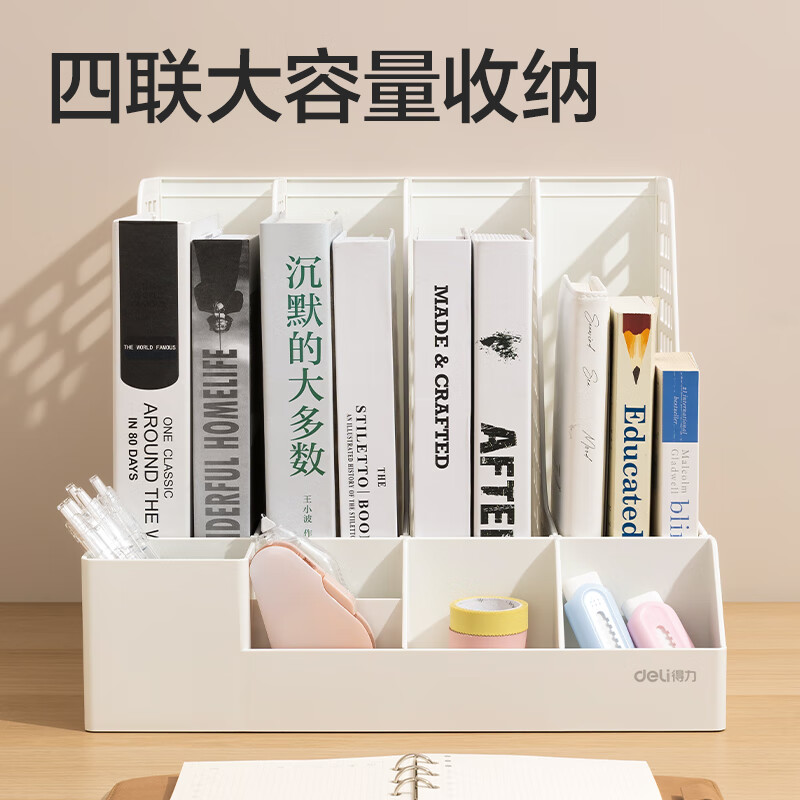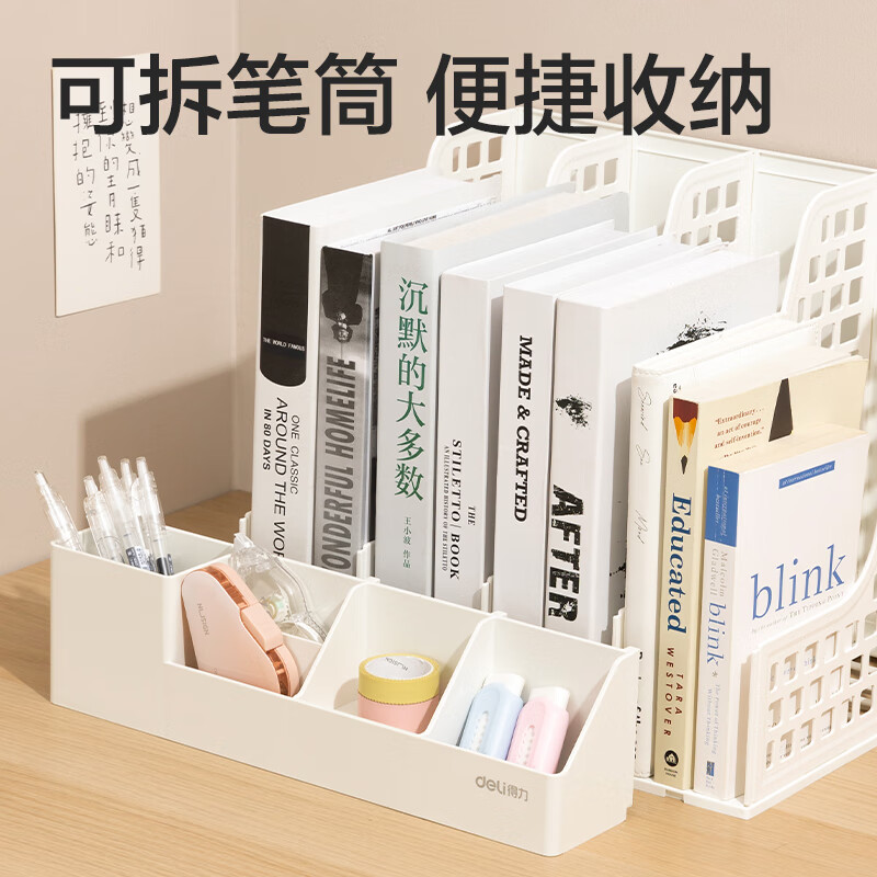 得力文件框栏莫兰迪桌面档案收纳盒办公室报告书籍学生书立架文件篮筐置物整理架自带笔筒 白色PB106