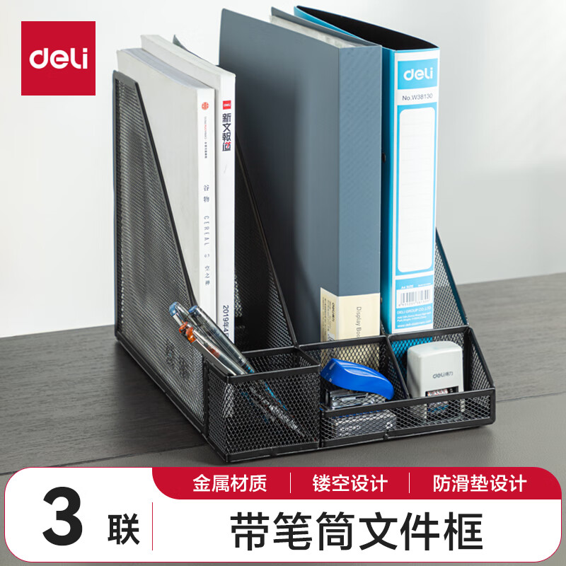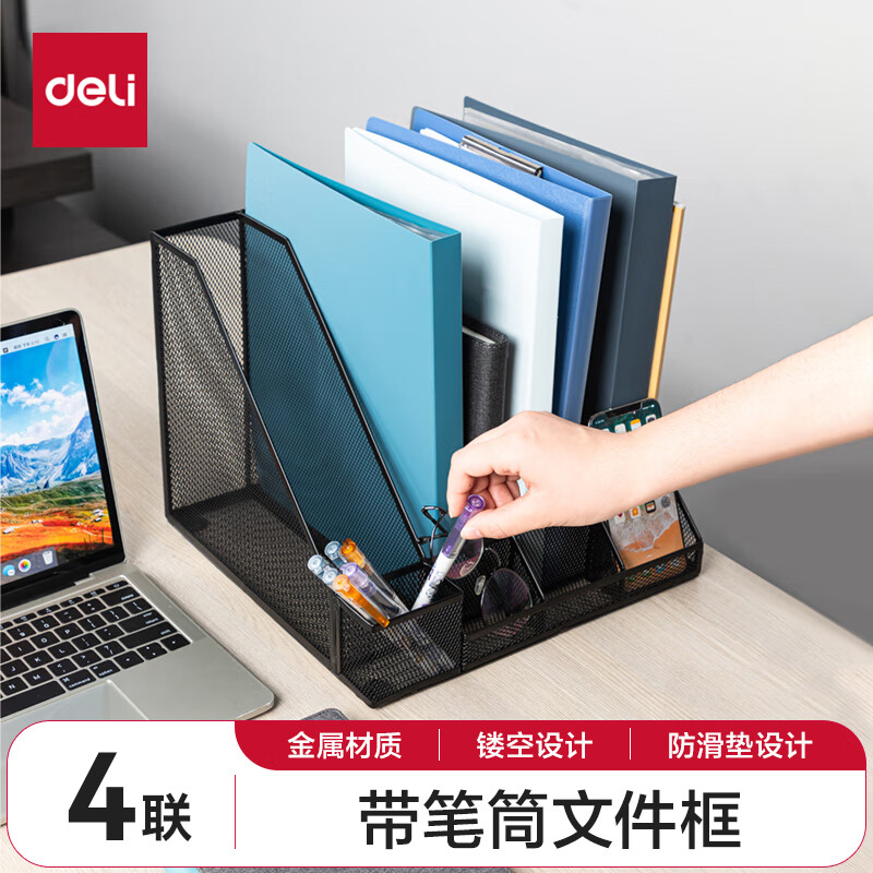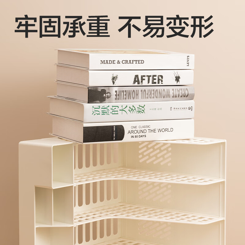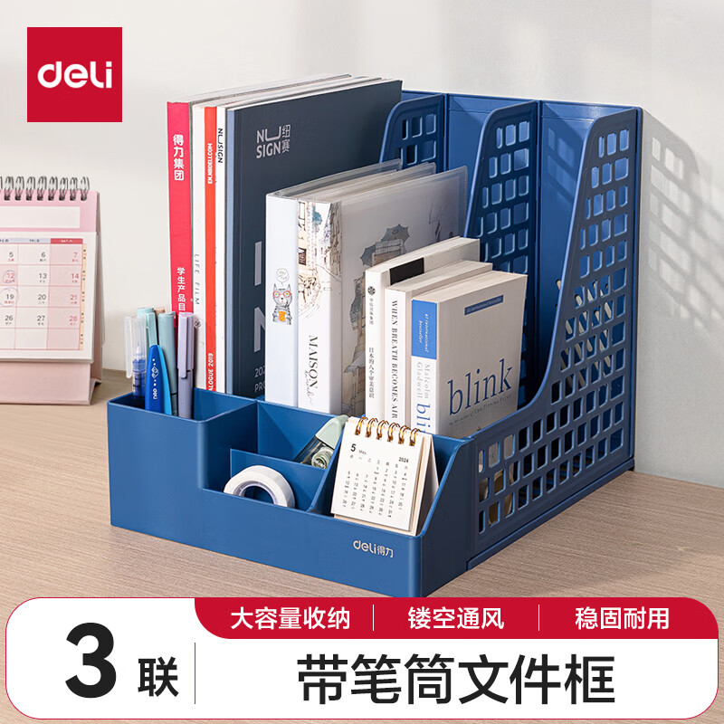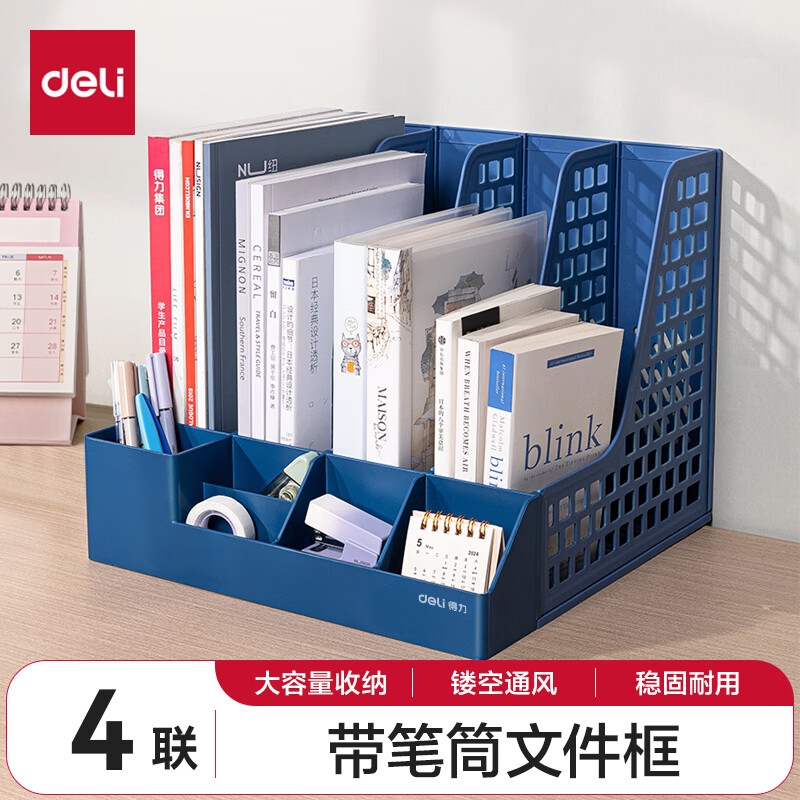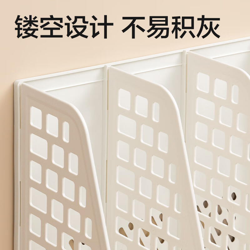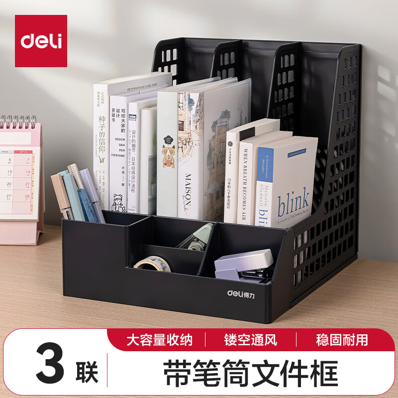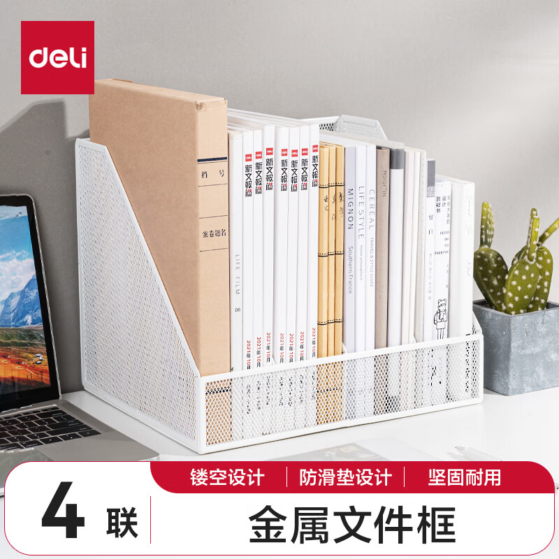得力文件框栏莫兰迪桌面档案收纳盒办公室报告书籍学生书立架文件篮筐置物整理架自带笔筒 白色PB106