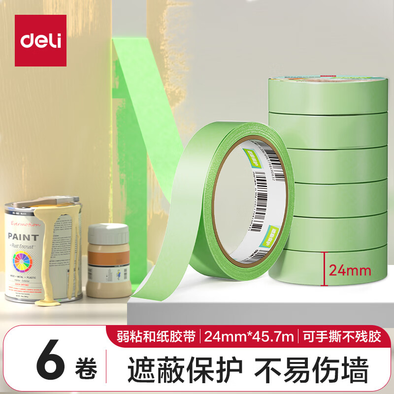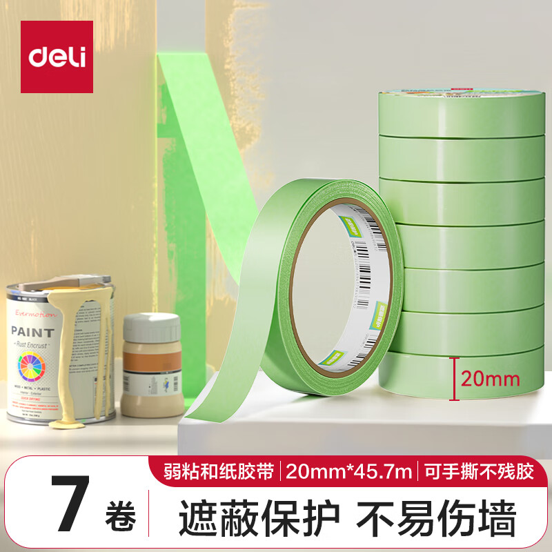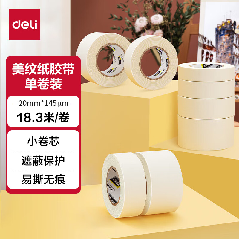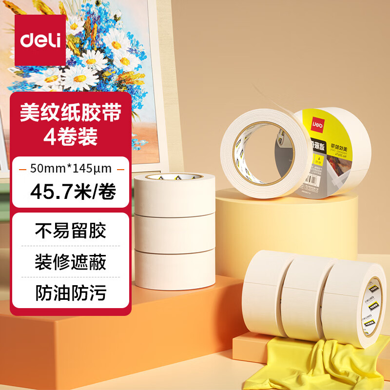 【全网低价】得力(deli)美纹纸胶带 50mm*50y*145μm 美术美工分色 装修遮蔽美缝贴膜刷漆保护 4卷 30674