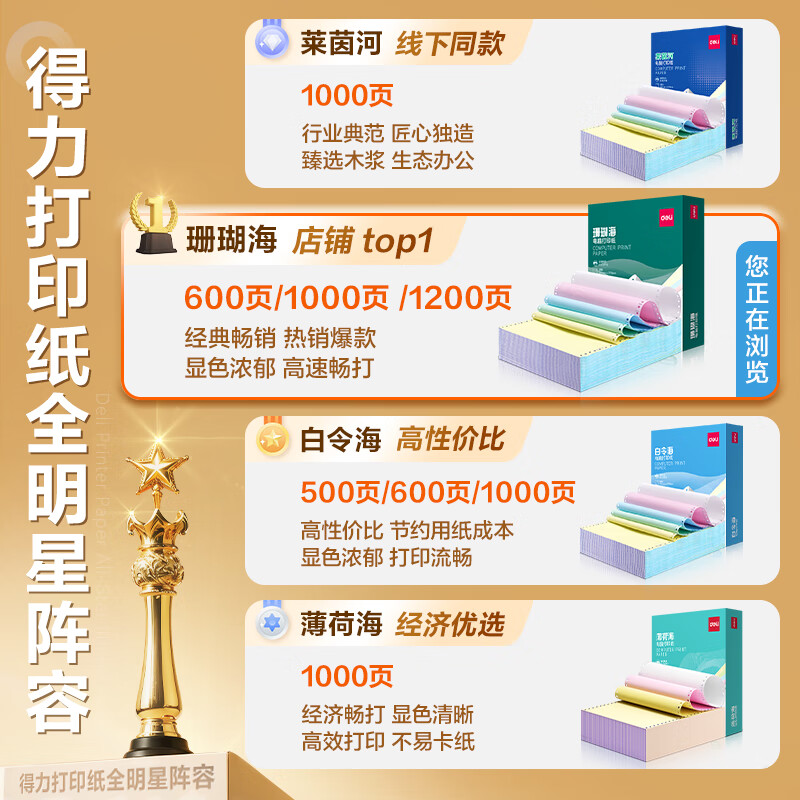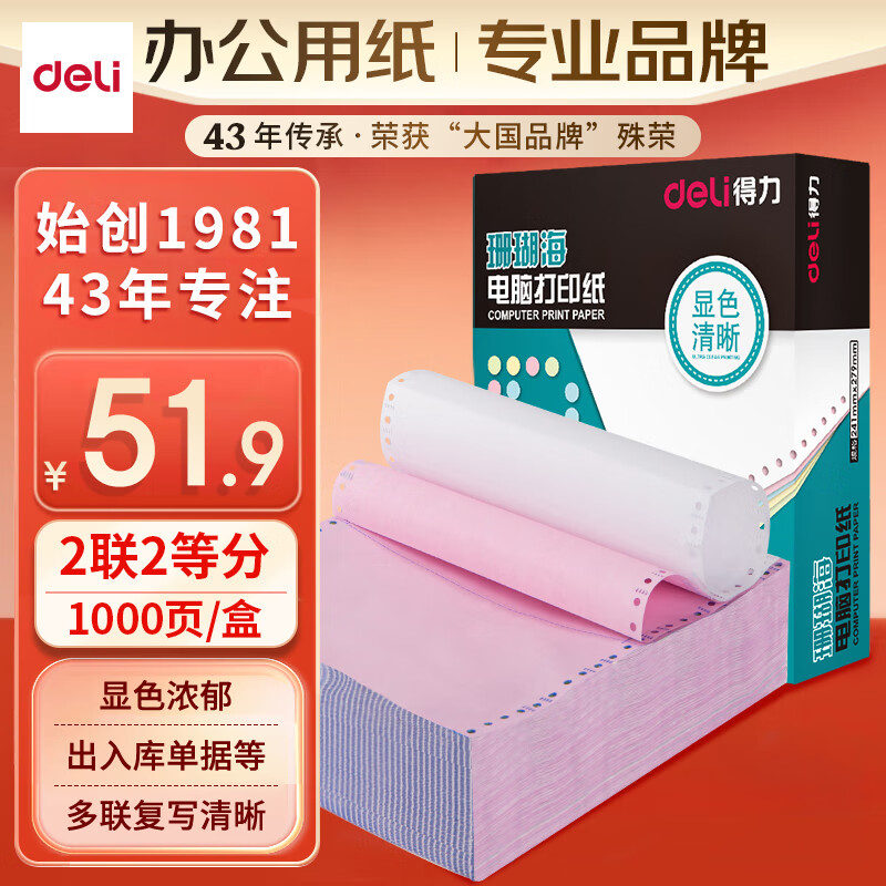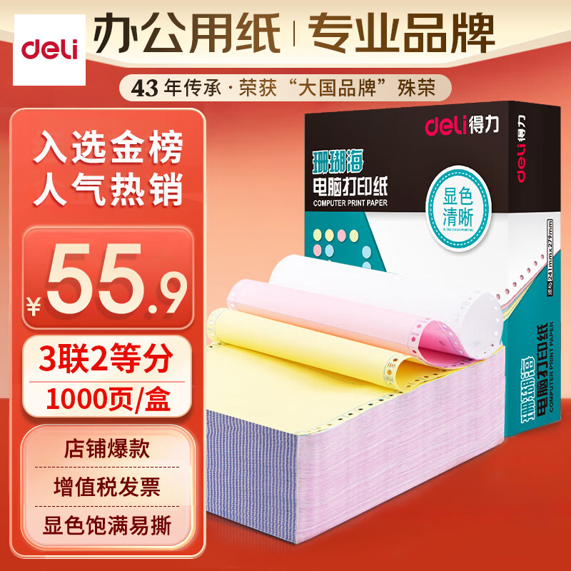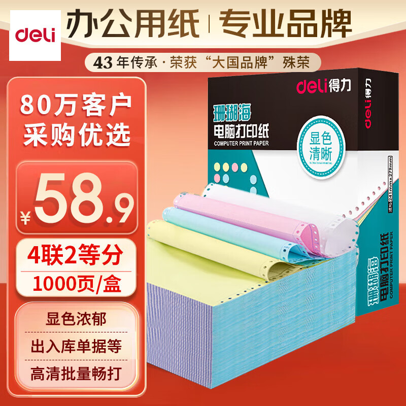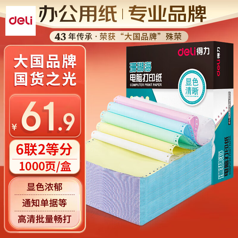得力(deli)珊瑚海打印纸 五联二等分针式打印纸 可撕边电脑打印纸 彩色(白红蓝绿黄)1000页/箱241-5-1/2CS