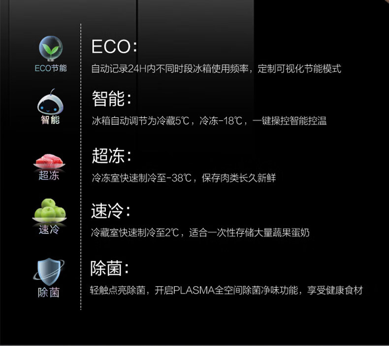 • 特色保鲜功能: -38℃超冻,轻氧水润焕鲜,全空间除菌净味