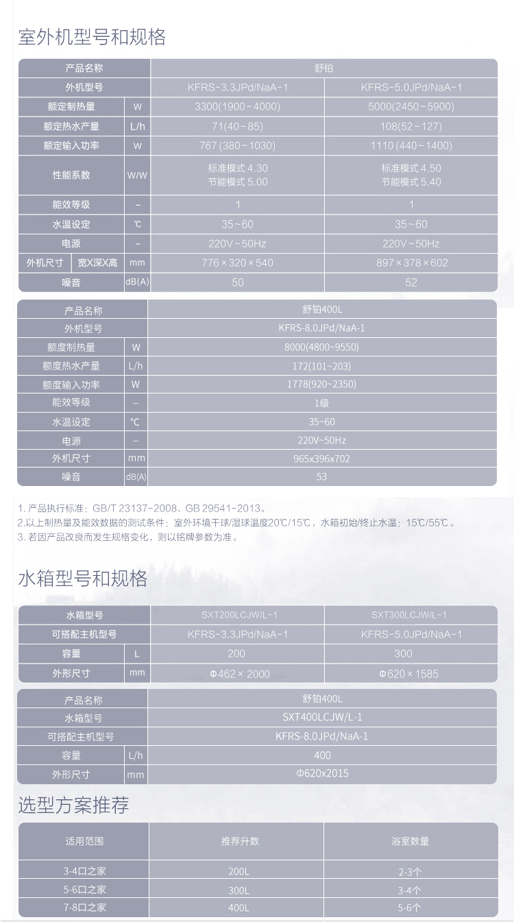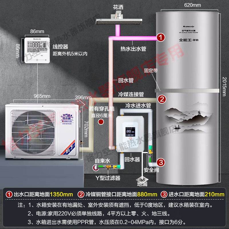 • 包装清单: 水箱,室外机,排水管,管箍,安全阀,三通接头,密封垫,螺母,PPR水管接头,固定带组件,固定板组件,膨胀螺丝,螺钉组合件,连接管部件,排水接头,显示板,电源线