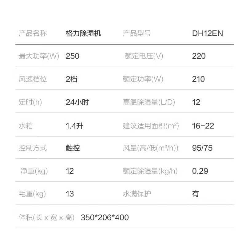 格力(GREE)除湿机/抽湿机 除湿量12升/天 家用轻音卧室客厅宿舍地下室低噪除湿器小型可定时 (DH12EN)