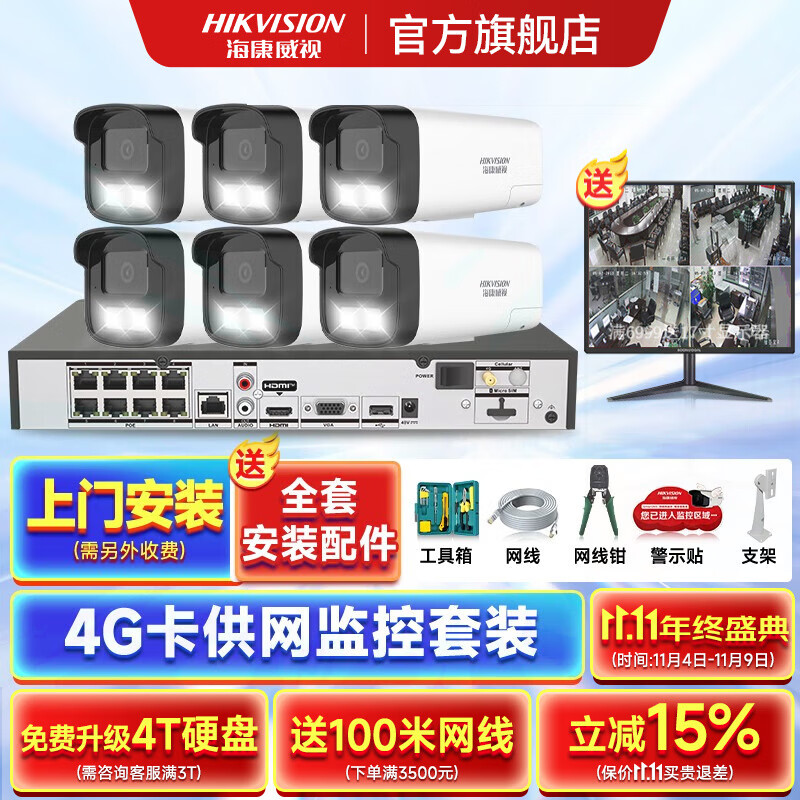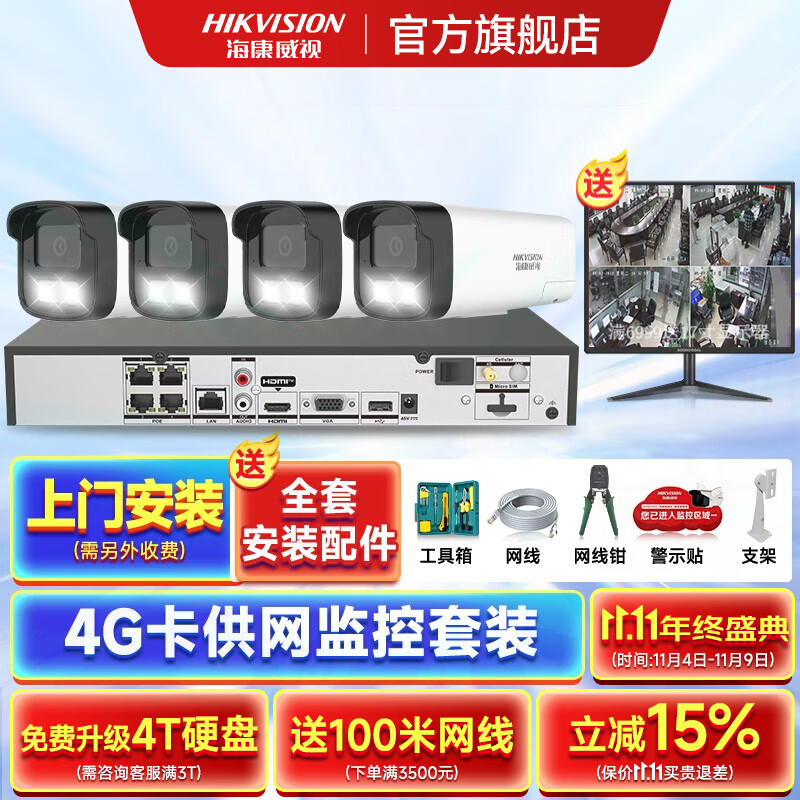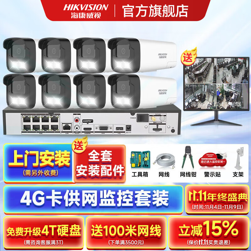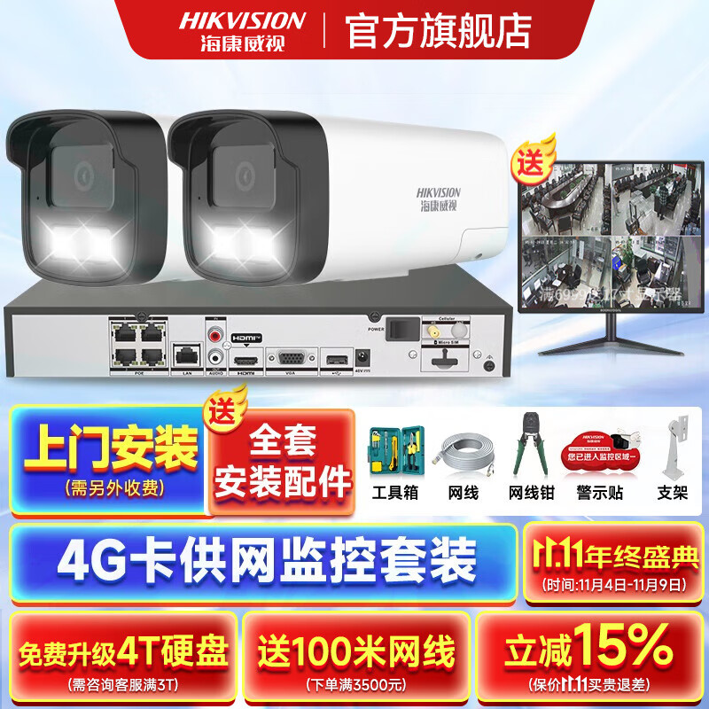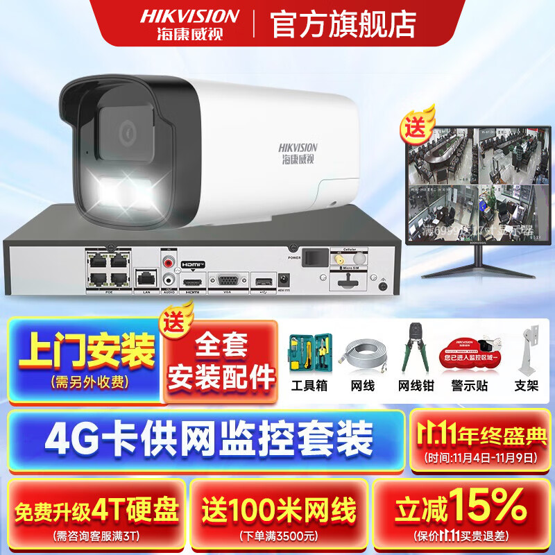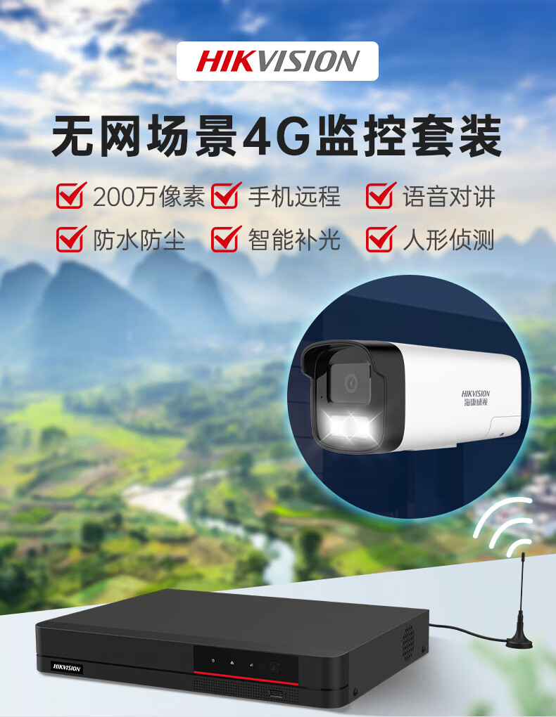 海康威视4G录像机供网摄像头套装适合无网环境监控器全套设备摄像头全彩室内外高清手机远程POE