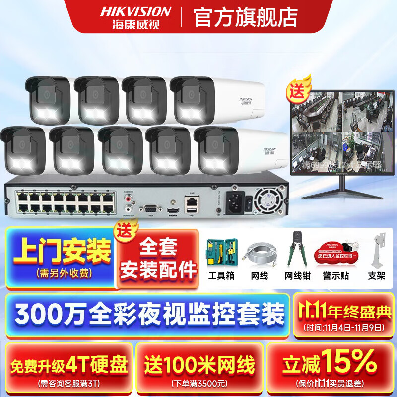【11台摄像头套装300万全彩夜视】可付费上门安装