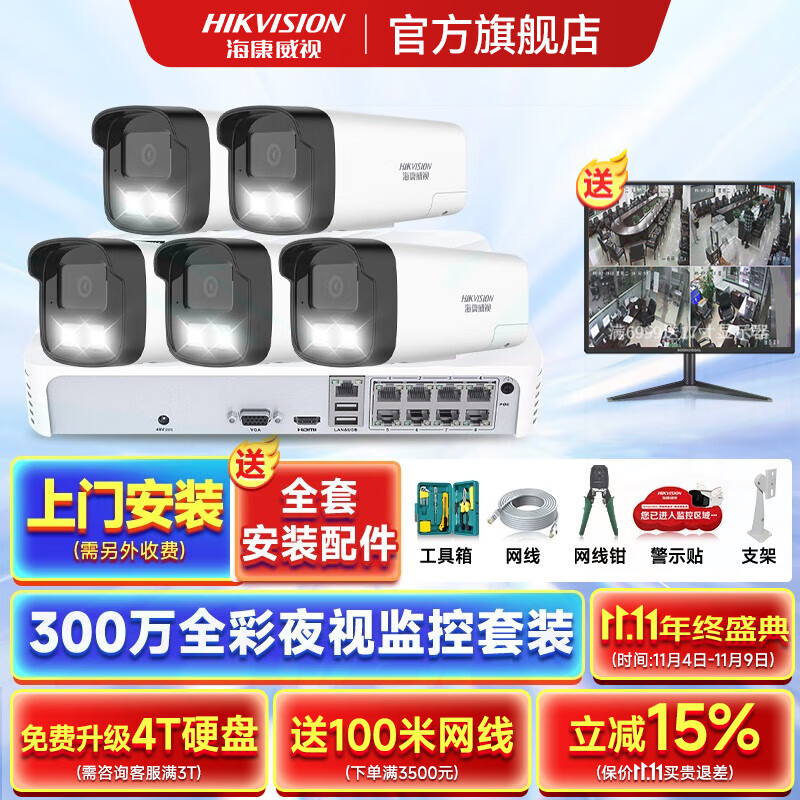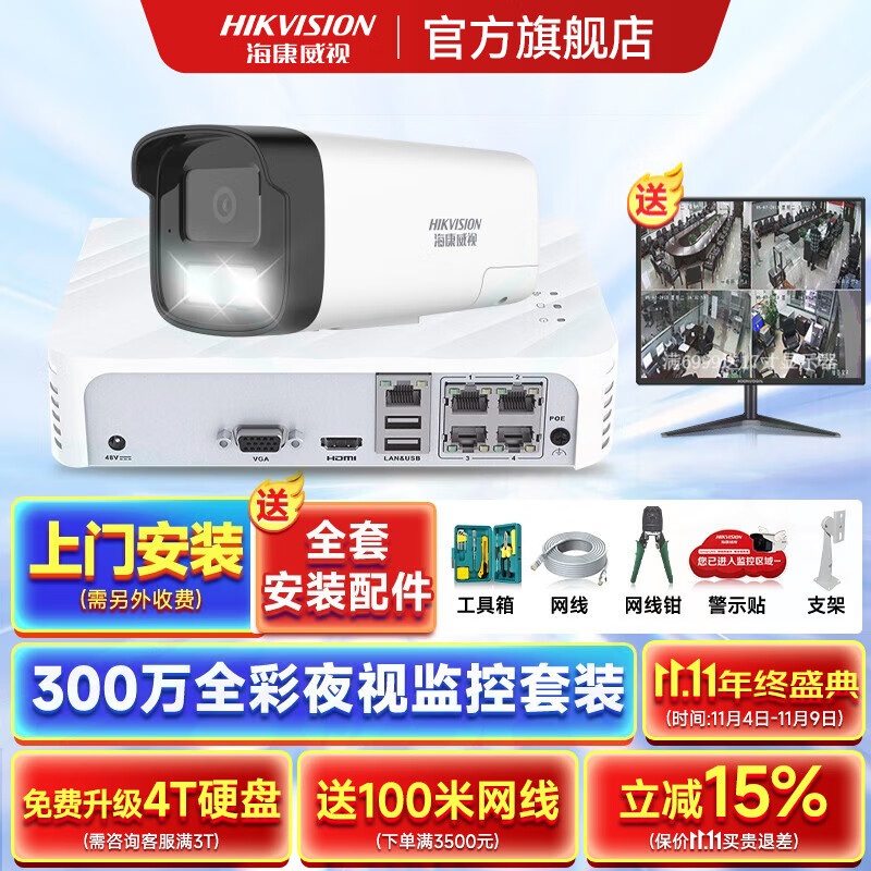 【4台摄像头套装300万全彩夜视】可付费上门安装