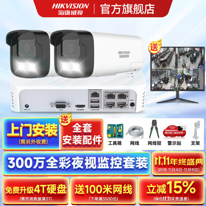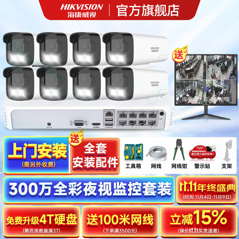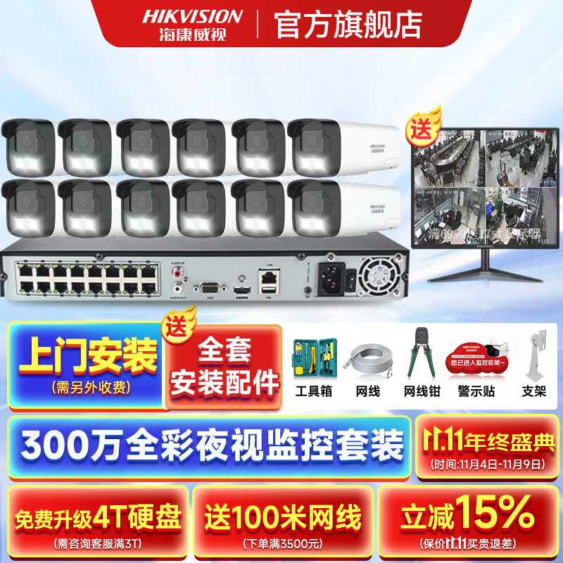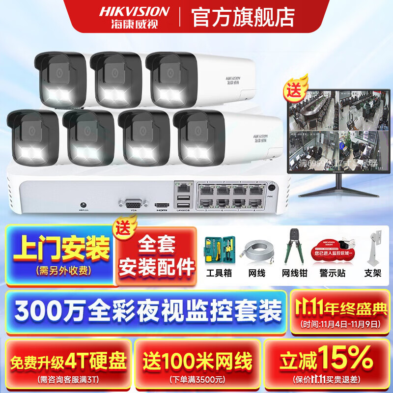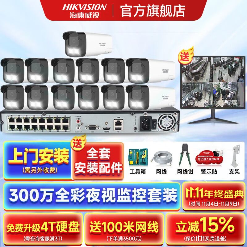 【15台摄像头套装300万全彩夜视】可付费上门安装