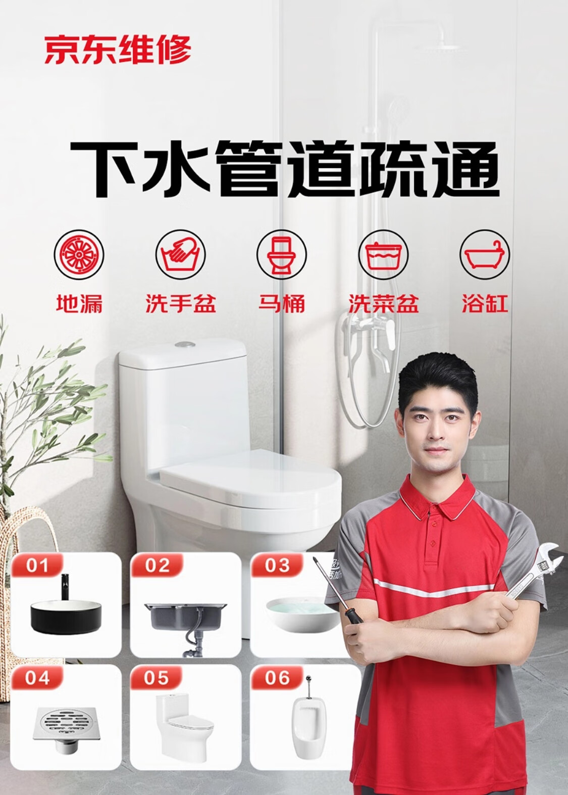 京东 管道疏通服务 上门马桶疏通下水管道/地漏维修(可抵30维修费)