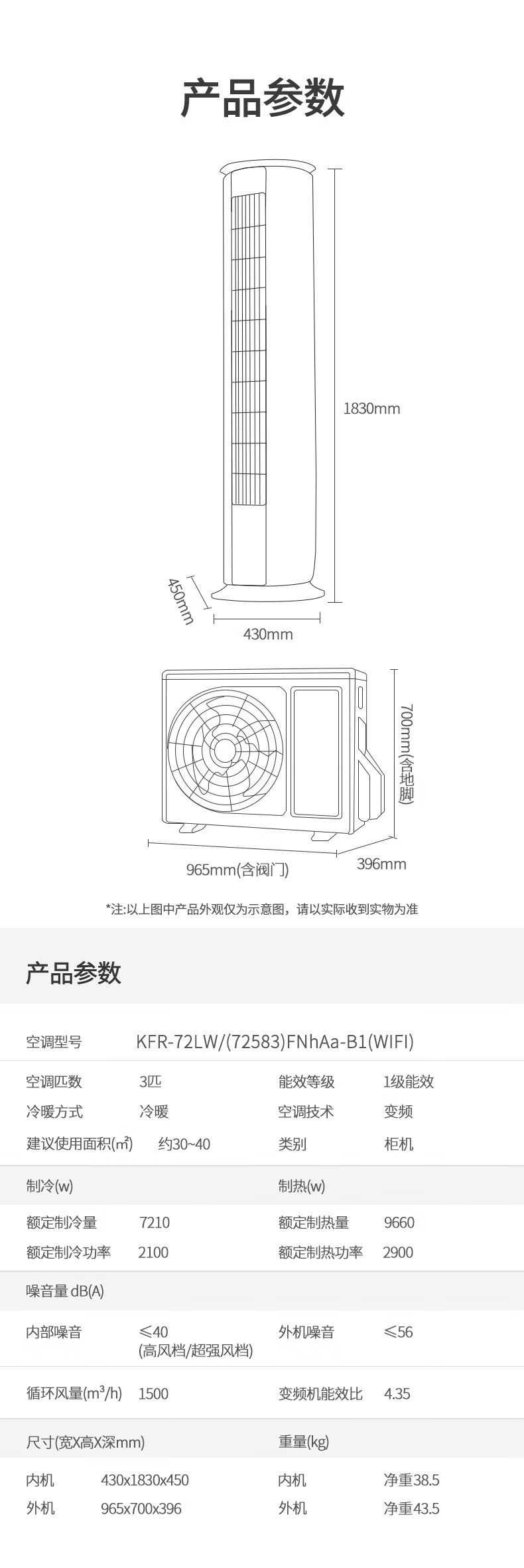 • 内机机身尺寸: 宽430mm;高1830mm;深450mm