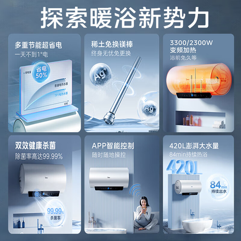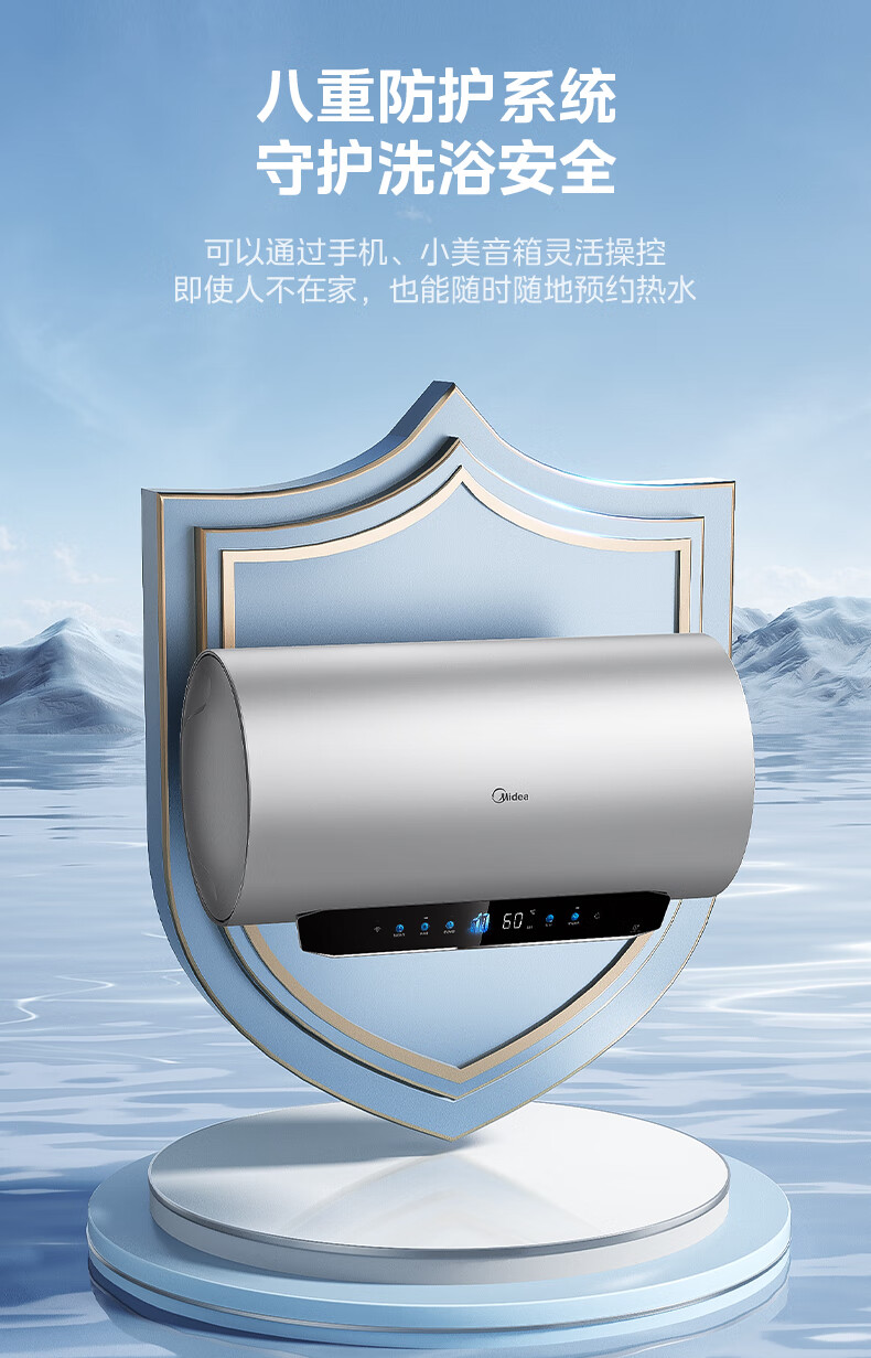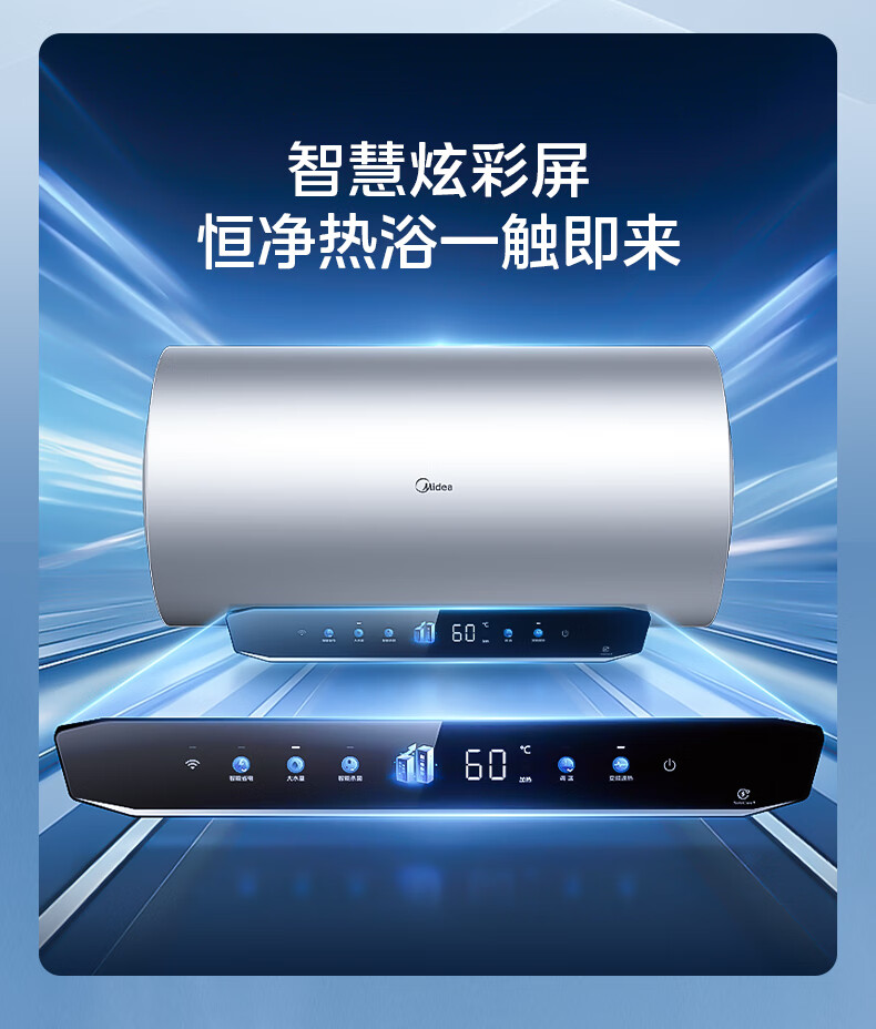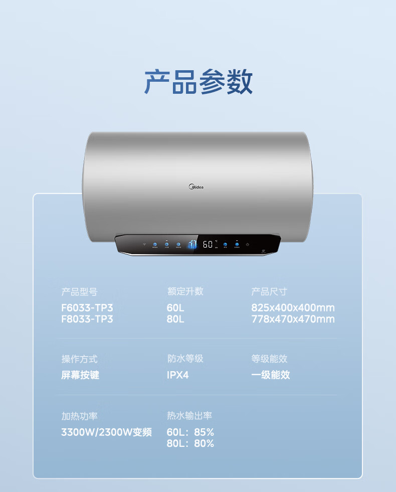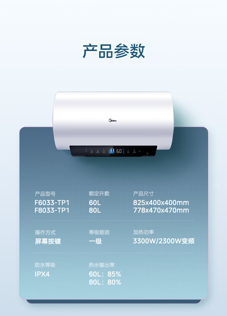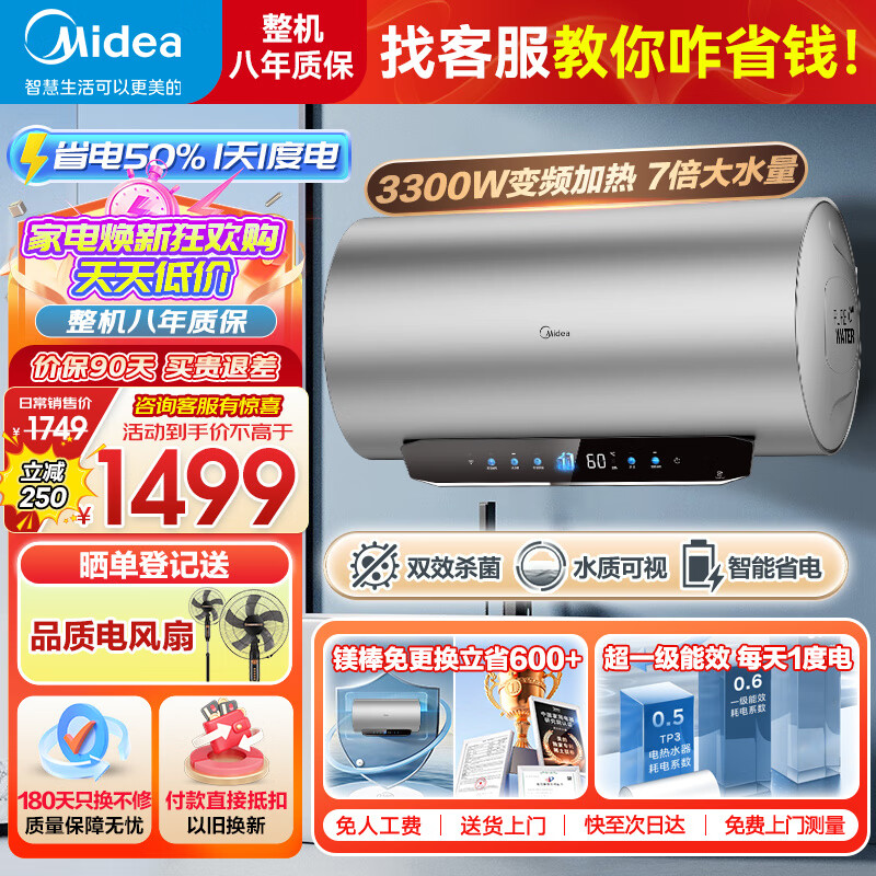 美的(Midea)超一级能效电热水器家用节能酷省电3300W变频速热60升80升镁棒免换APP控制杀菌净水防电墙多重防护 60L 3300W 超一级能效