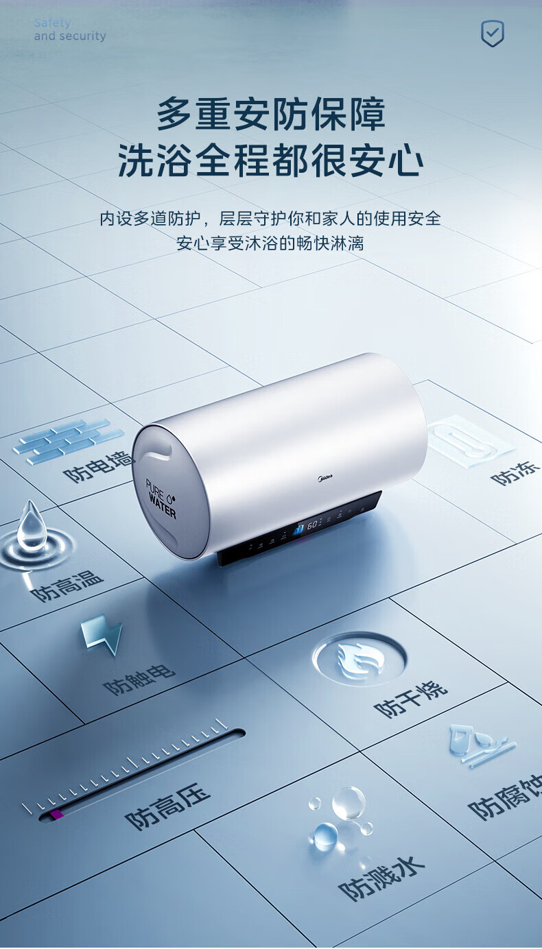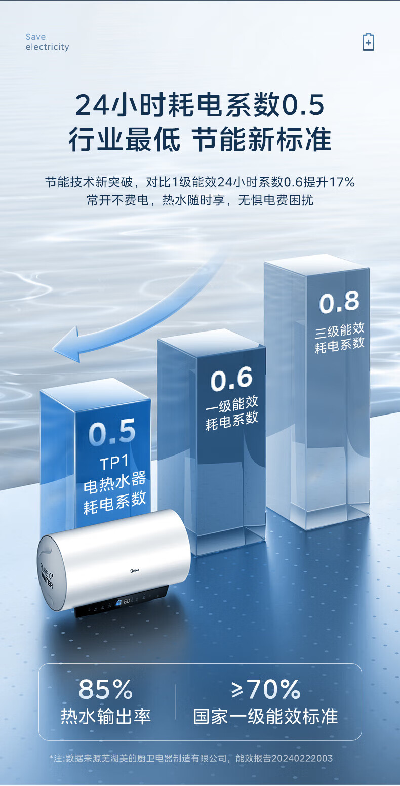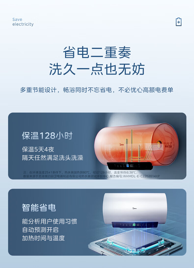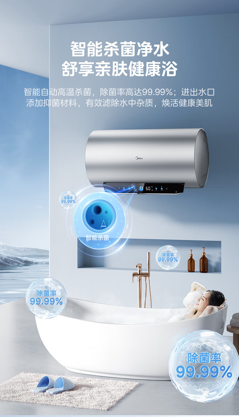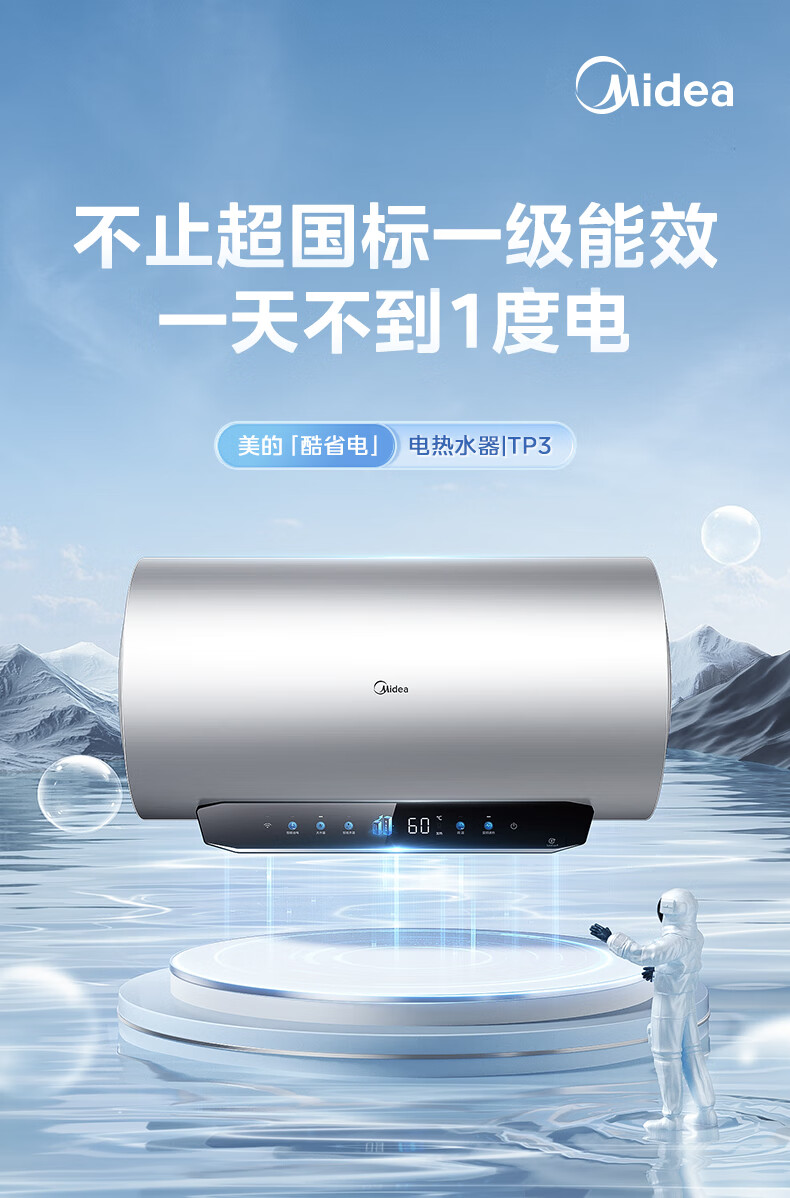 美的(Midea)超一级能效电热水器家用节能酷省电3300W变频速热60升80升镁棒免换APP控制杀菌净水防电墙多重防护 60L 3300W 超一级能效