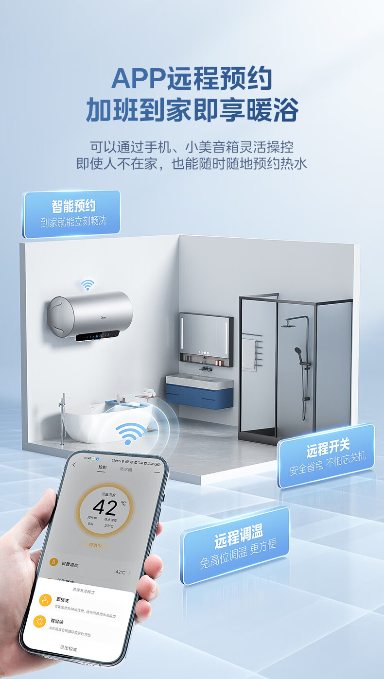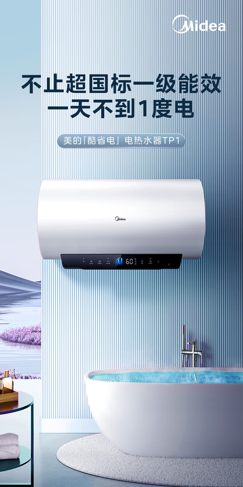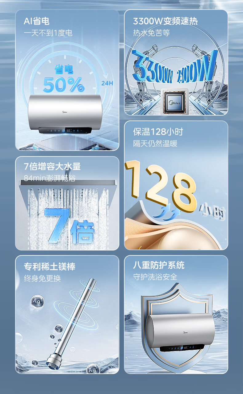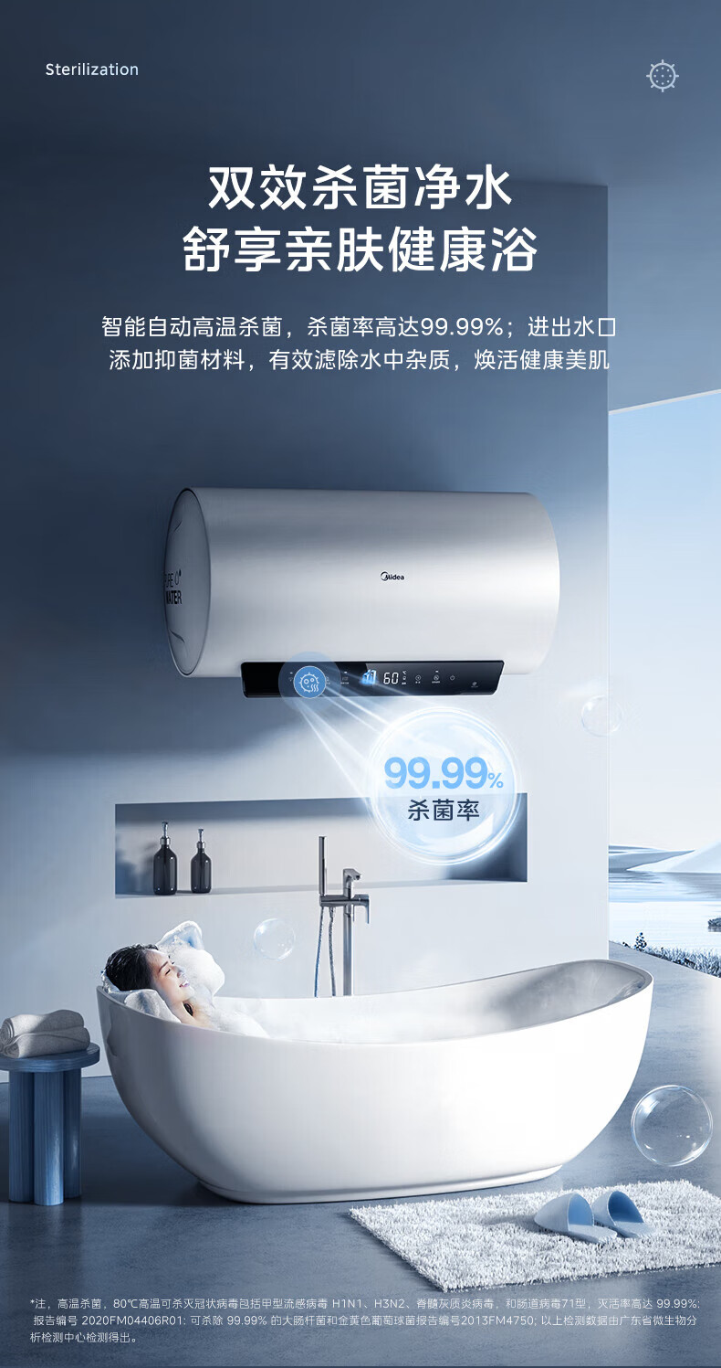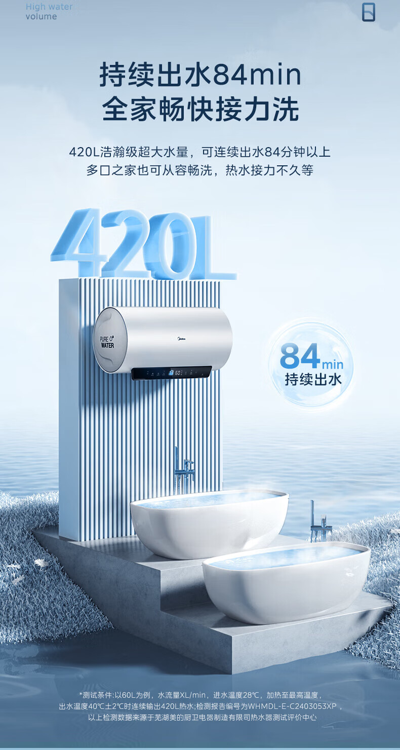 美的(Midea)超一级能效电热水器家用节能酷省电3300W变频速热60升80升镁棒免换APP控制杀菌净水防电墙多重防护 60L 3300W 超一级能效