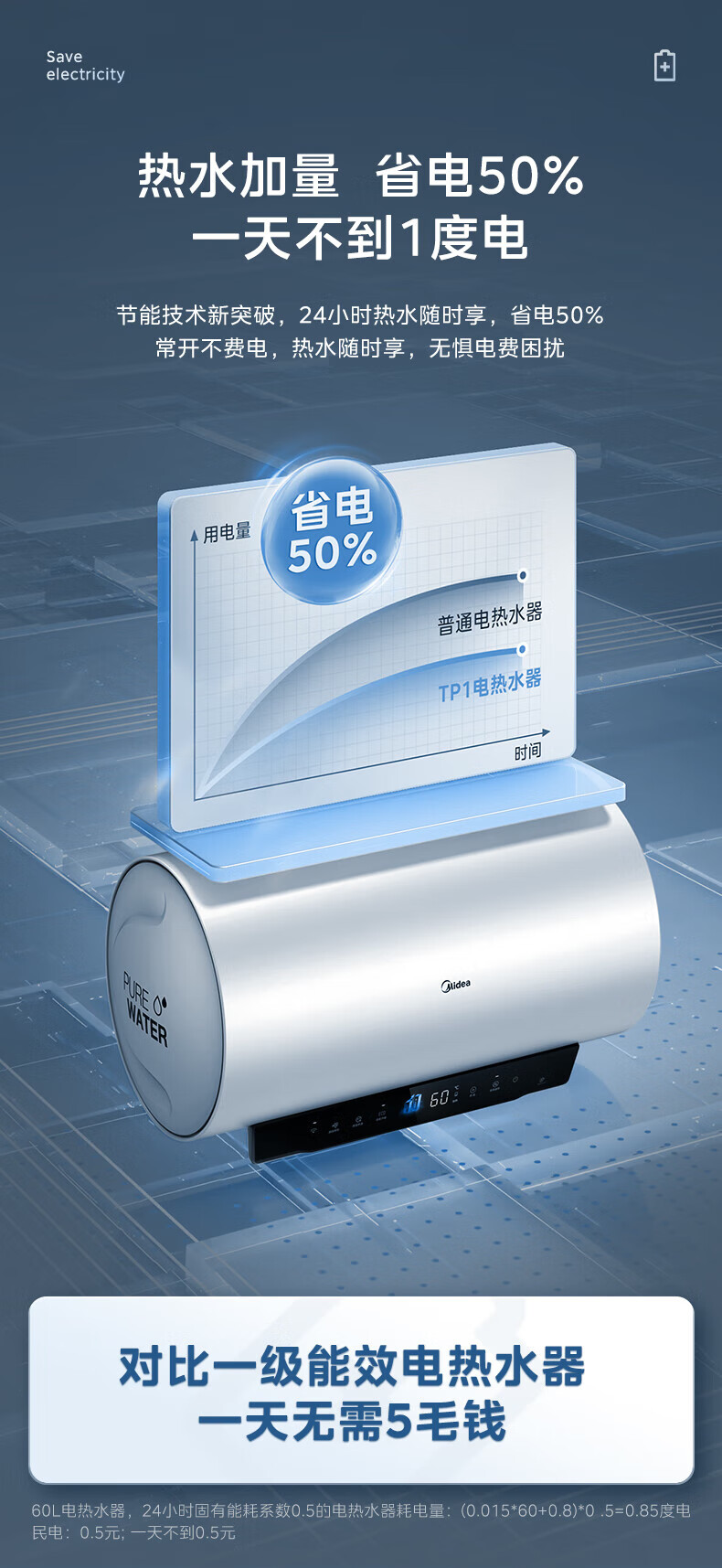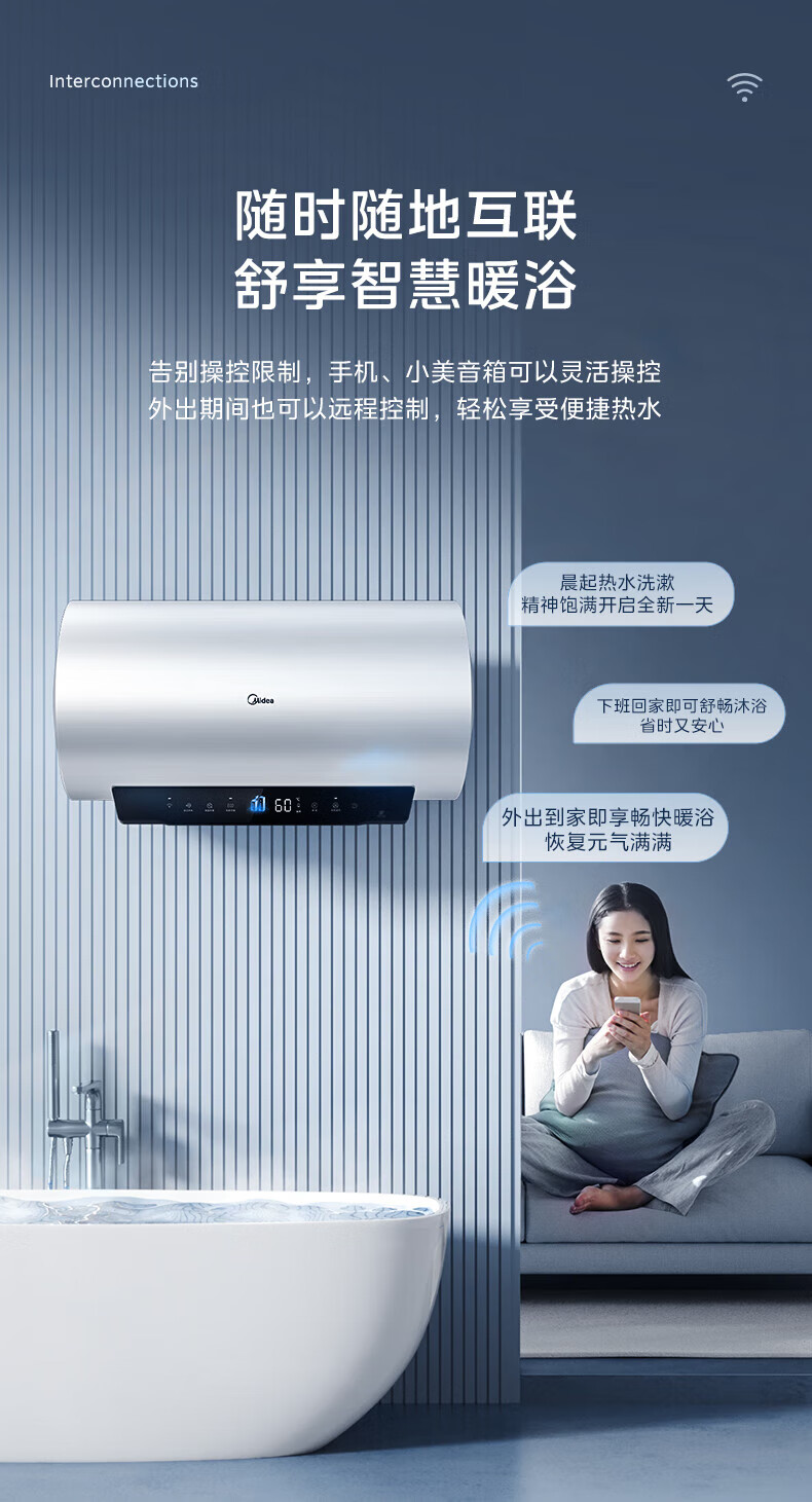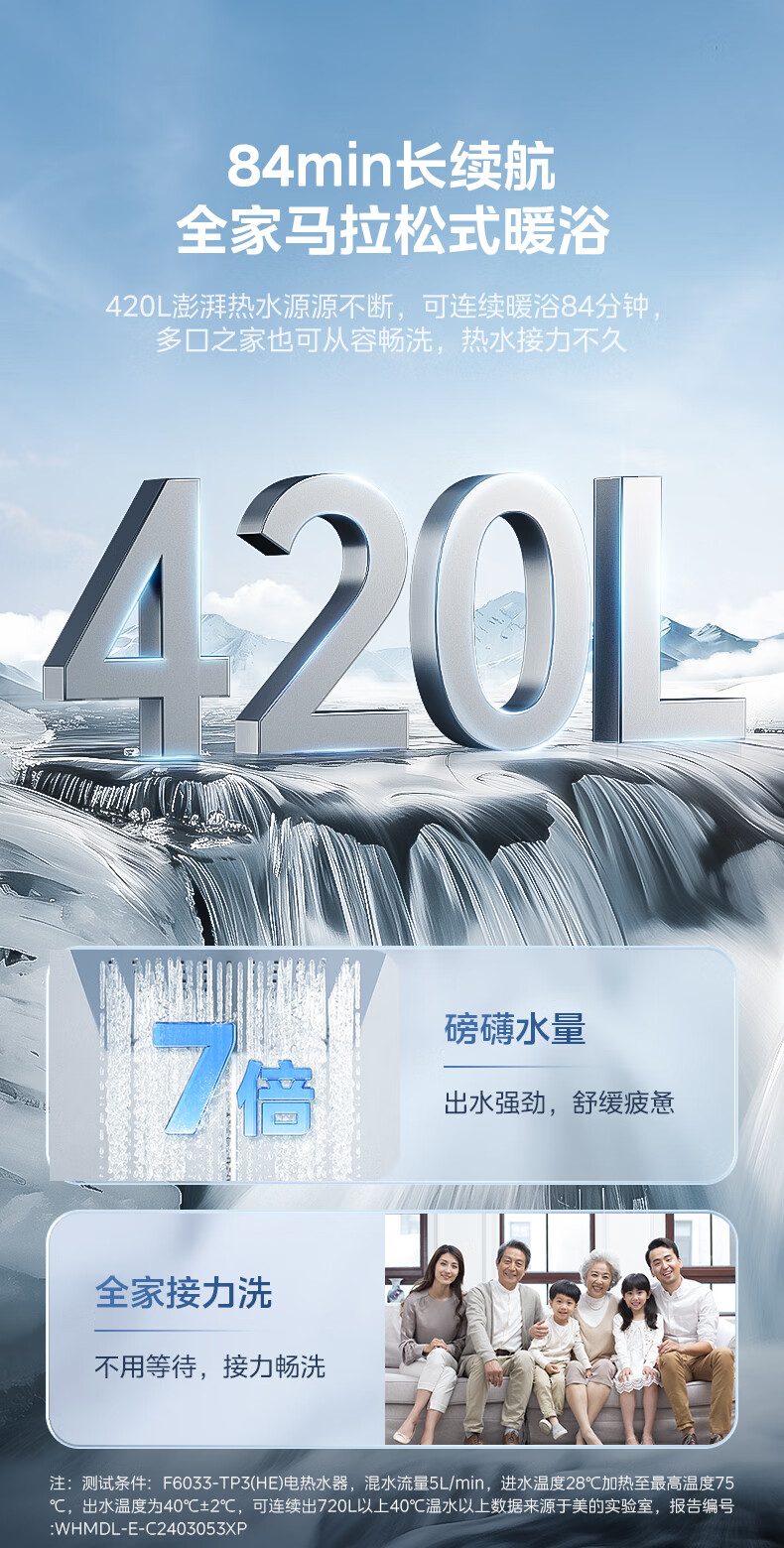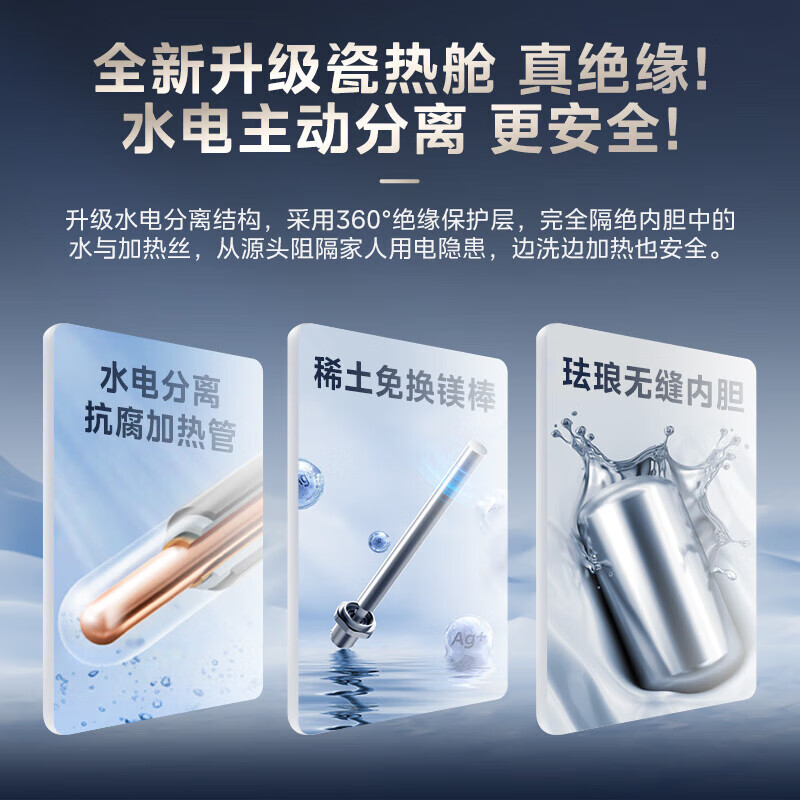 美的(Midea)超一级能效电热水器家用节能酷省电3300W变频速热60升80升镁棒免换APP控制杀菌净水防电墙多重防护 60L 3300W 超一级能效