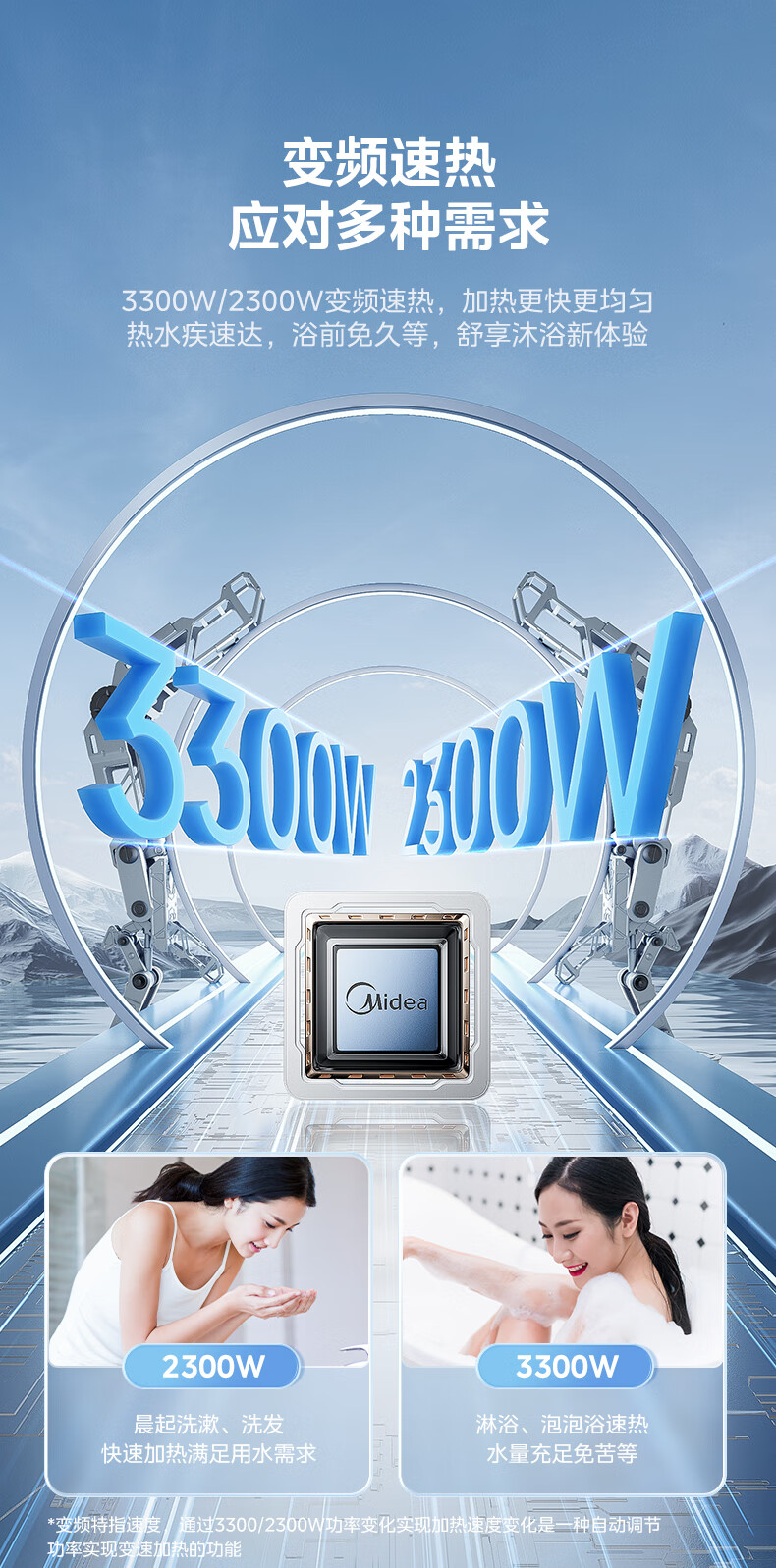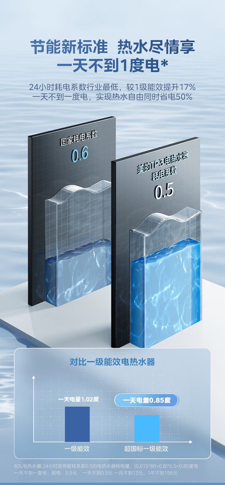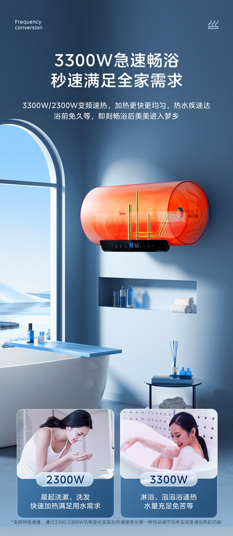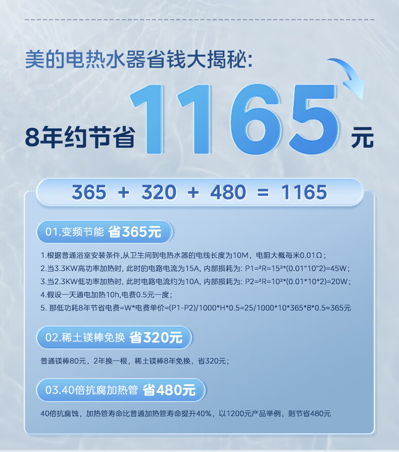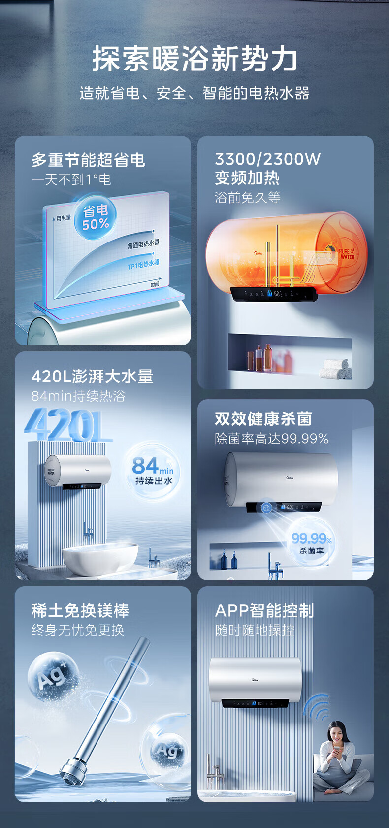 美的(Midea)超一级能效电热水器家用节能酷省电3300W变频速热60升80升镁棒免换APP控制杀菌净水防电墙多重防护 60L 3300W 超一级能效