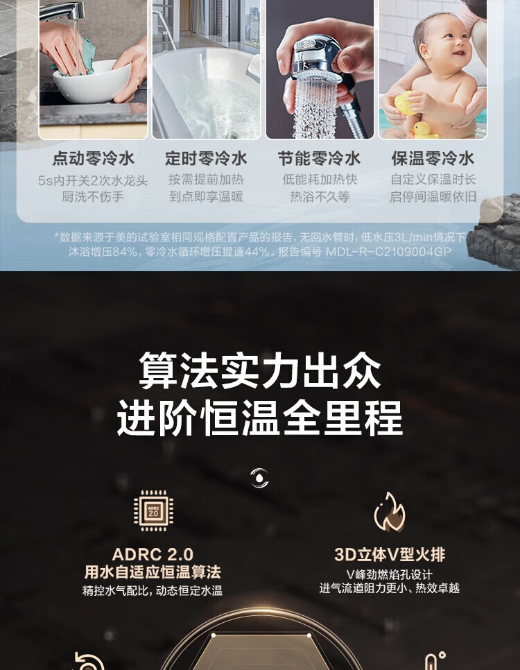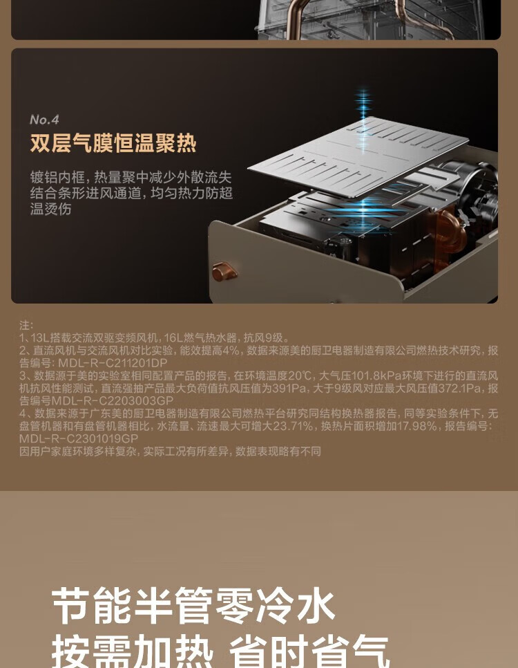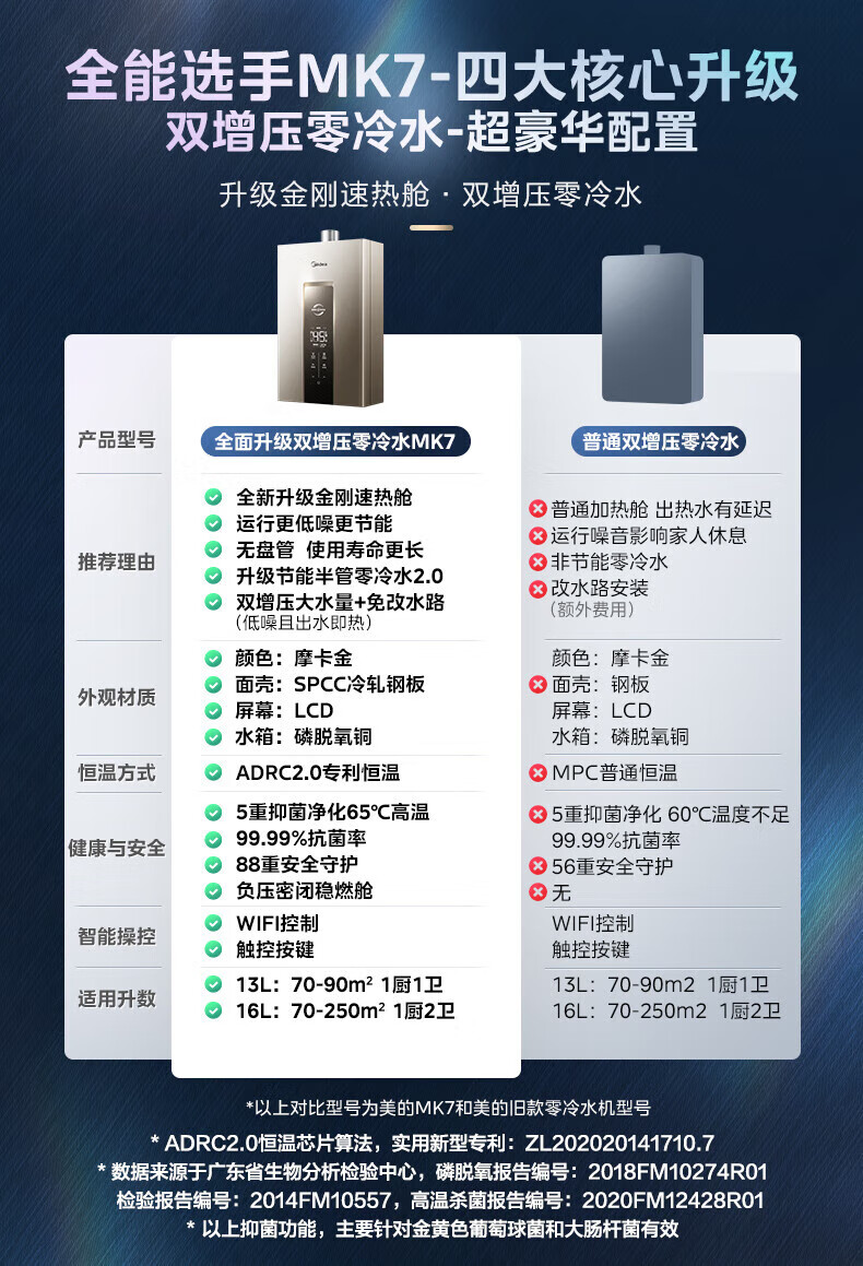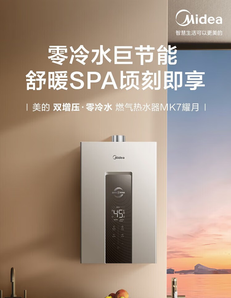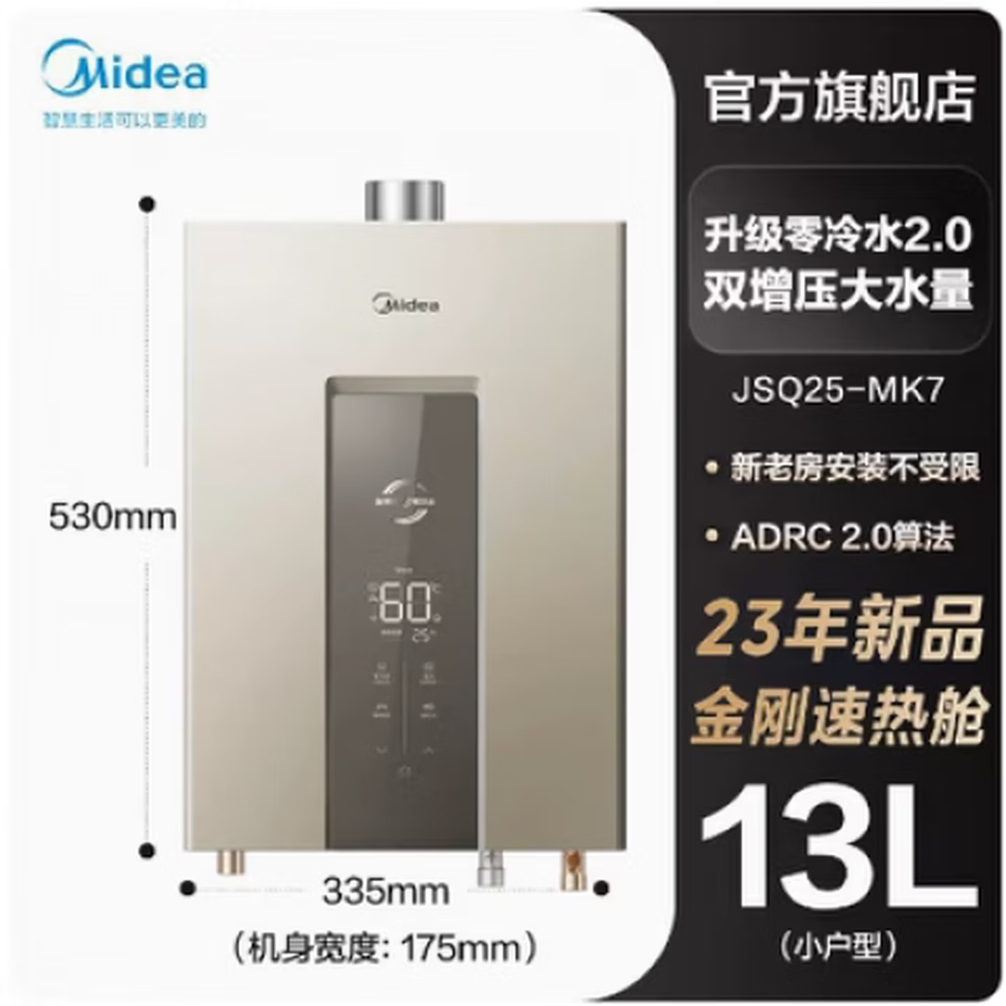 美的燃气热水器家用天然气13升/16升即热式强排式恒温升级双增压零冷水恒温速热低噪节能半管零冷水MK7 13L