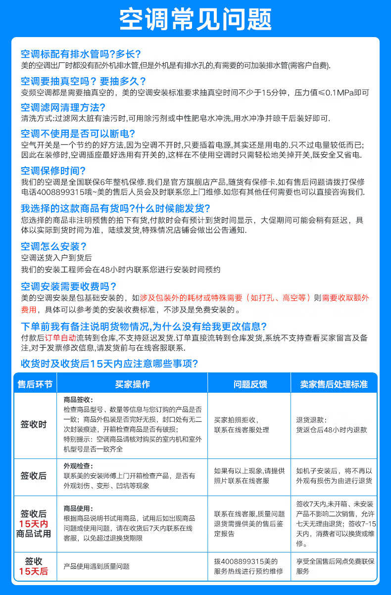 • 包装清单: 遥控器*1,7号电池*2,连接管*1,包扎带*2,密封胶泥*300克,排水管*1,墙孔挡板*1,电缆线*1,隔热材料*1,窗帘支架*3,排水接头*1,排水接头密封圈*1,使用安装说明书*1,连接管防拆帽*2,开关*1,室外机1台,室内机1台