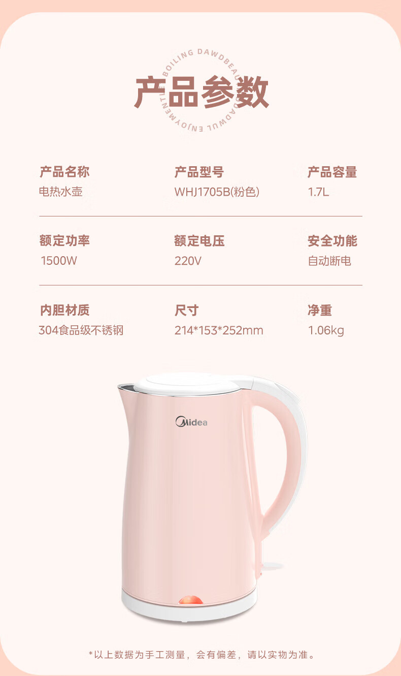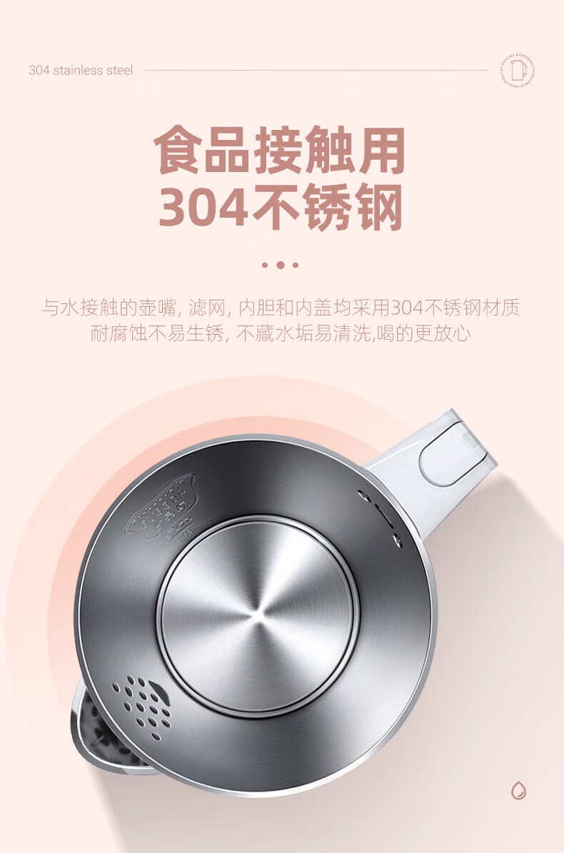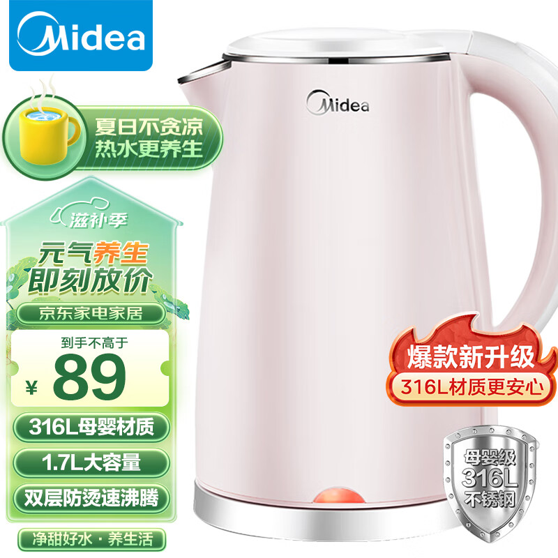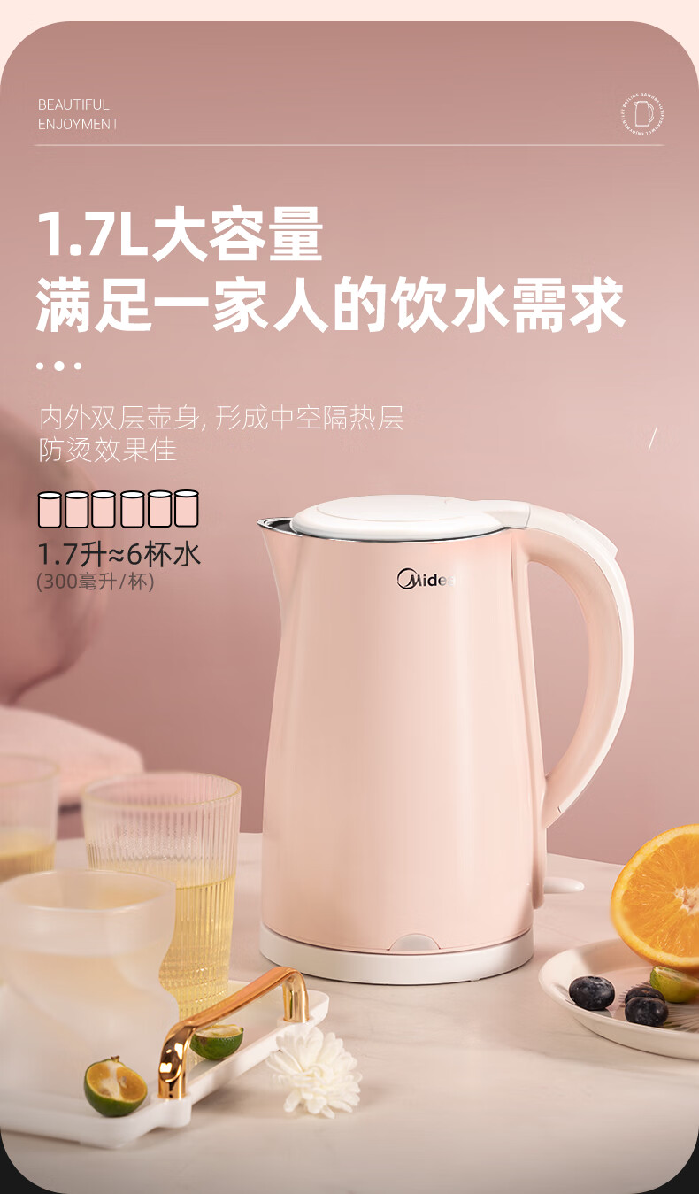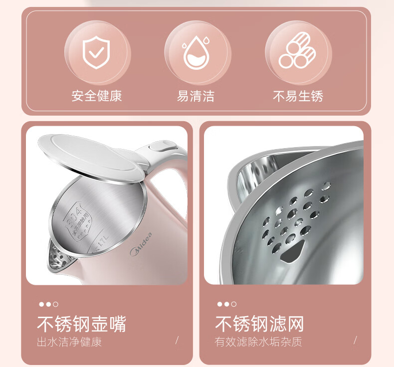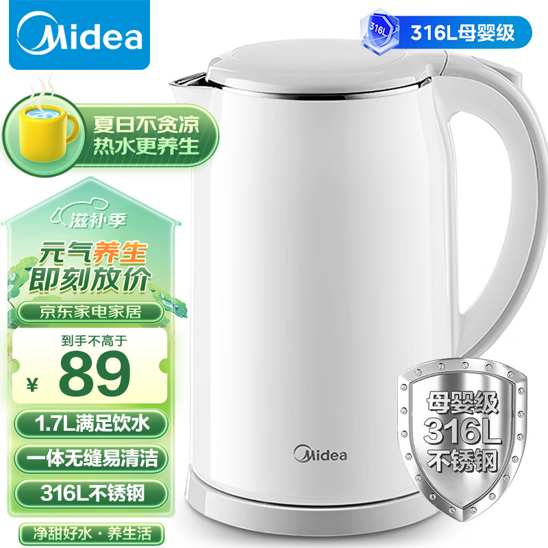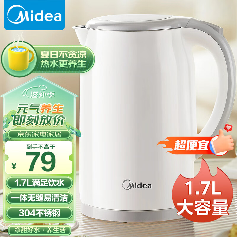 美的(Midea)电水壶热水壶电热水壶304不锈钢1.7L容量暖水壶烧水壶净甜家用大容量开水壶智能自动断电MK-HJ1705
