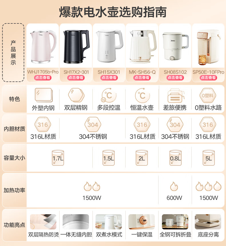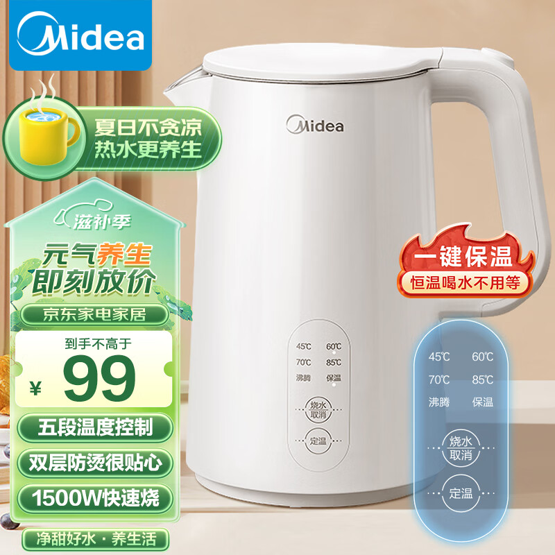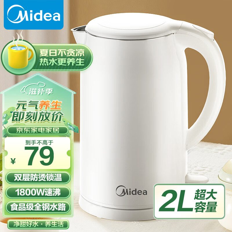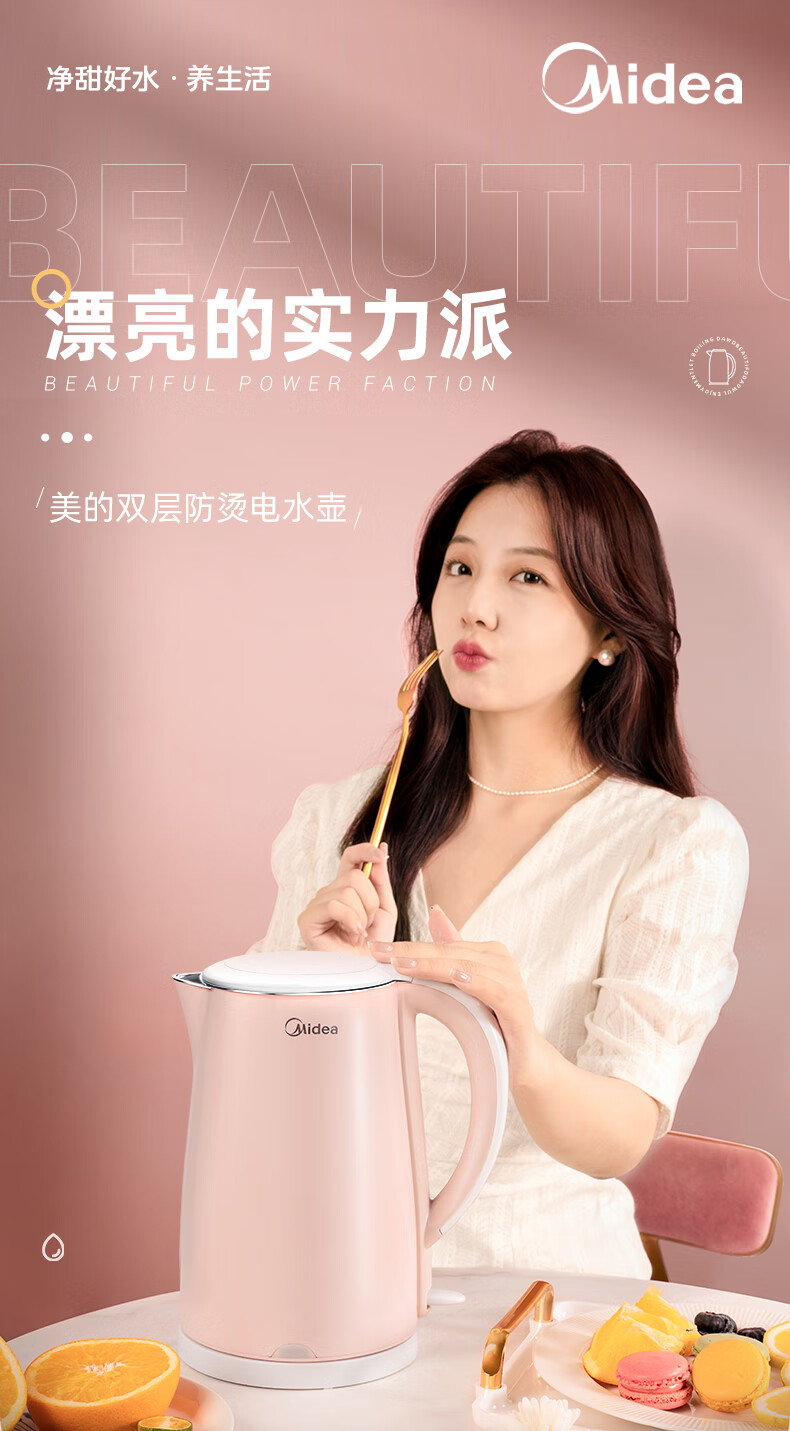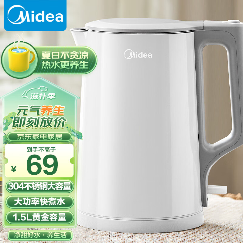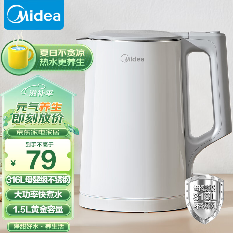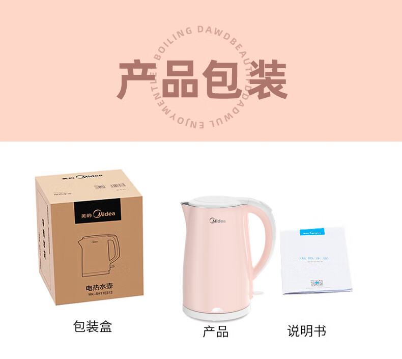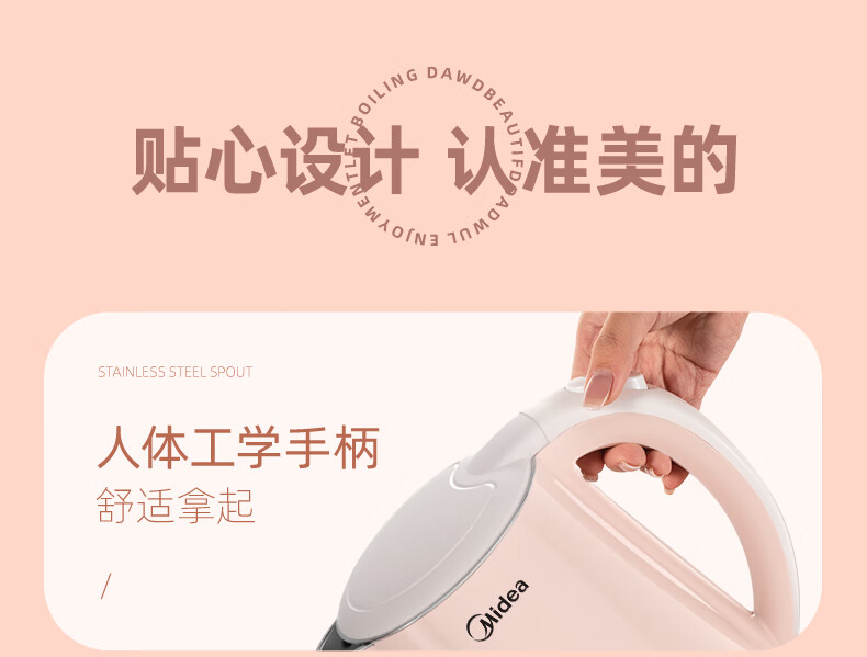 美的(Midea)电水壶热水壶电热水壶304不锈钢1.7L容量暖水壶烧水壶净甜家用大容量开水壶智能自动断电MK-HJ1705