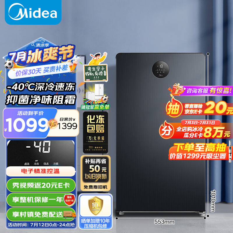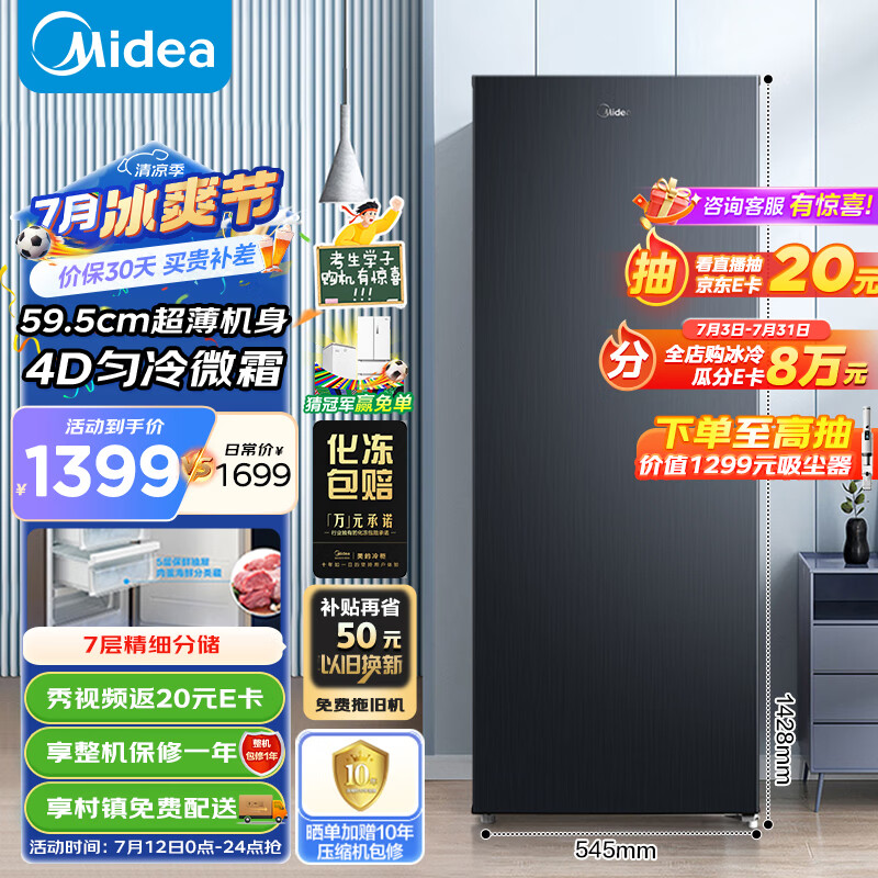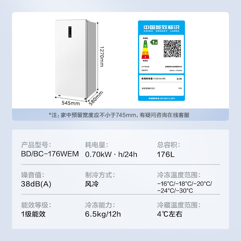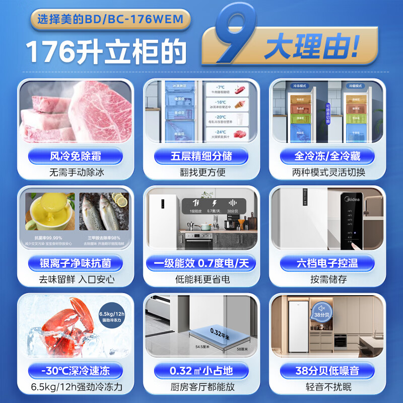 美的176升风冷无霜家用立式冰柜母乳冷藏柜冷冻柜转换抽屉式冷柜-30℃囤货小型全冷冻冰箱BD/BC-176WEM
