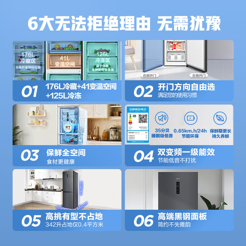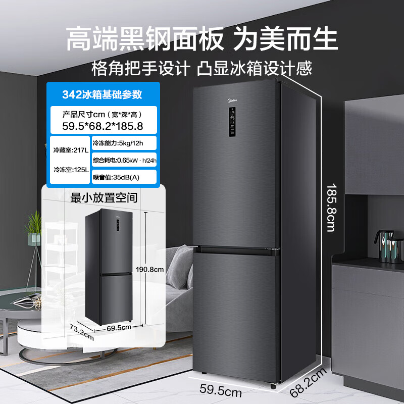 美的(Midea)一级能效变频两门二门双门左右开门风冷无霜小型家用租房宿舍电冰箱大容量BCD-342WPZM(E)京东小家