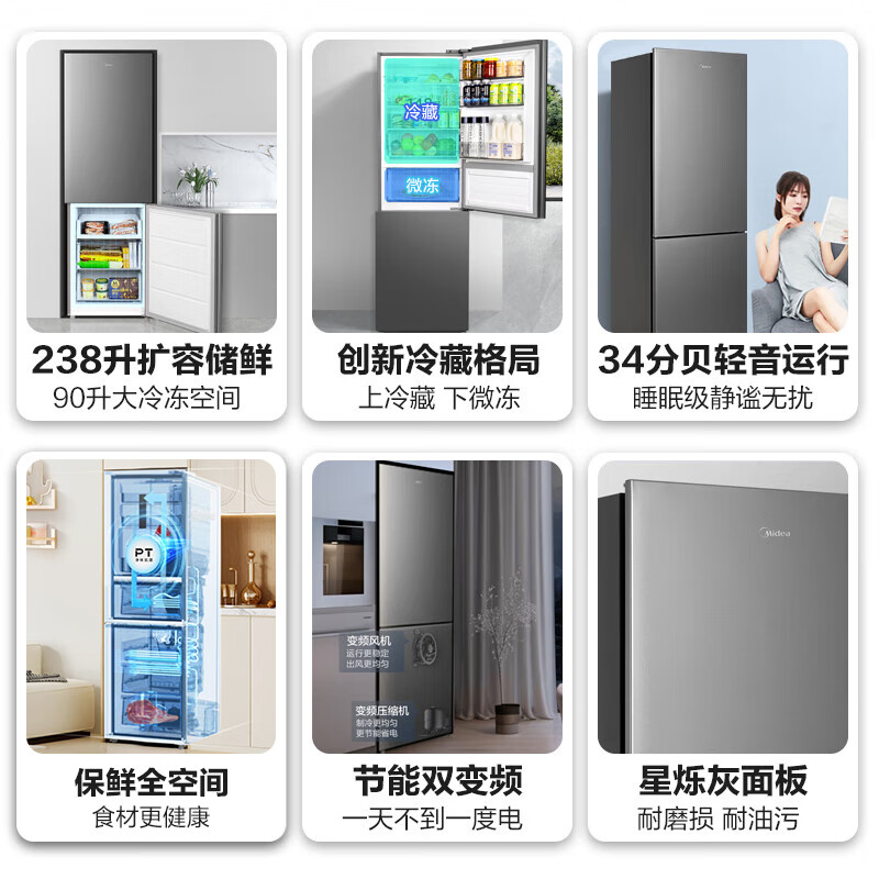 美的(Midea)238升两门二门双门节能低音双变频风冷无霜出租房用迷你小户型家用电冰箱以旧换新MR-249WPE