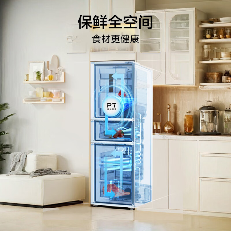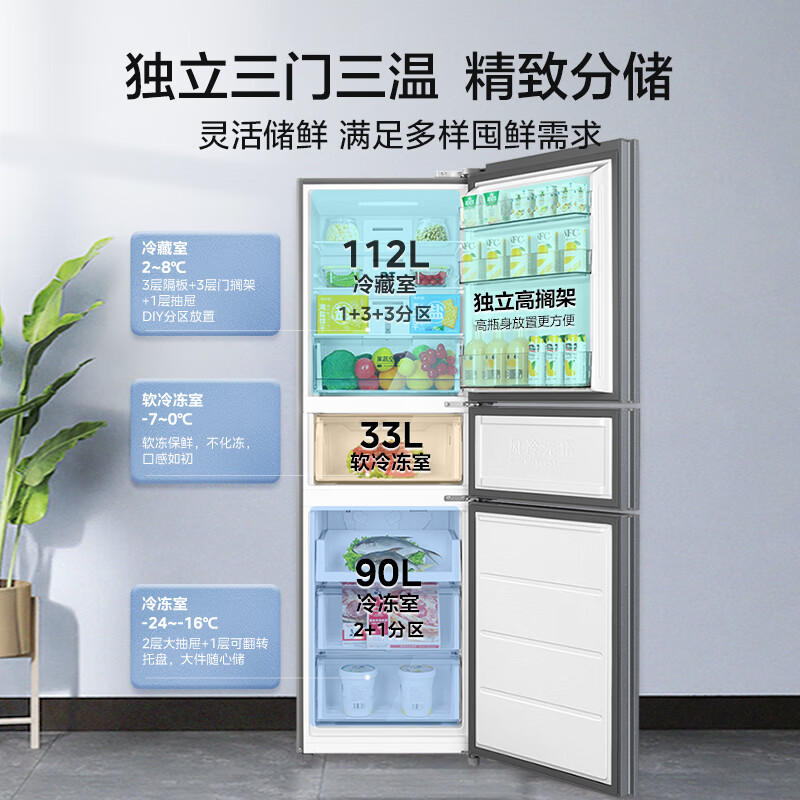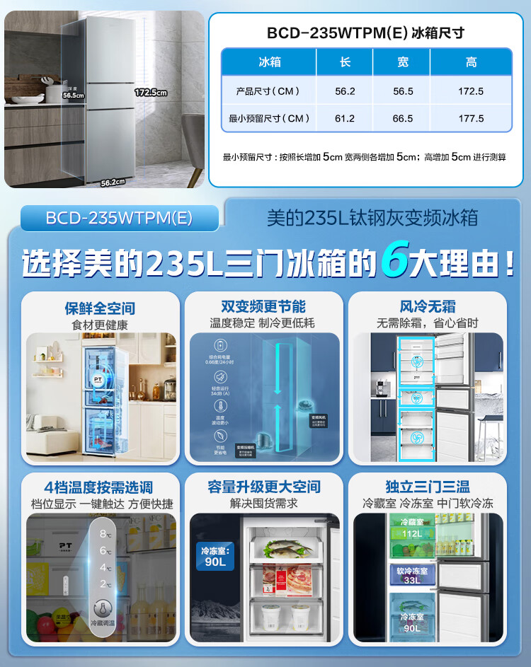 美的(Midea)三门家用小户型冰箱三开门风冷无霜变频节能省电净味保鲜租房不占地电冰箱BCD-235WTPM(E)