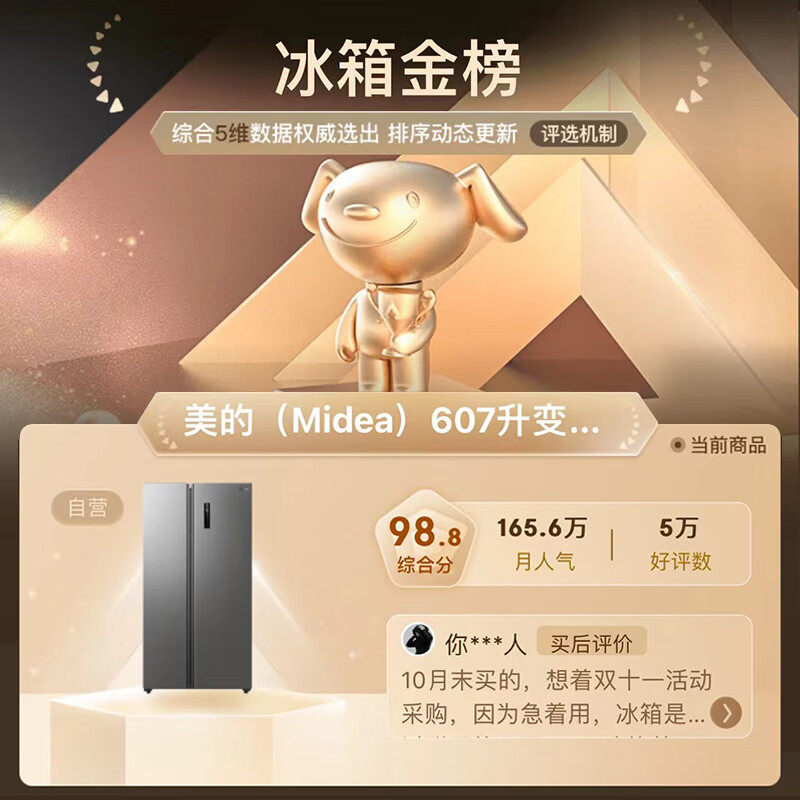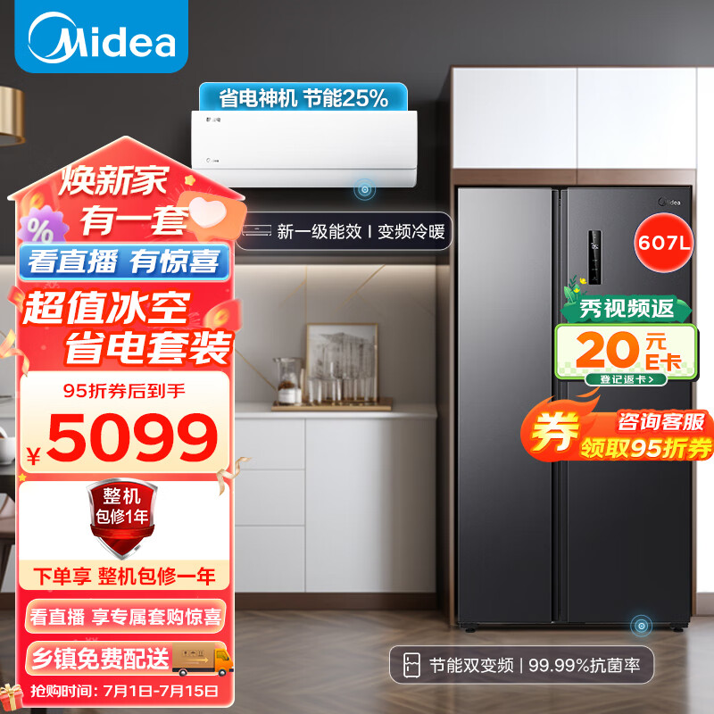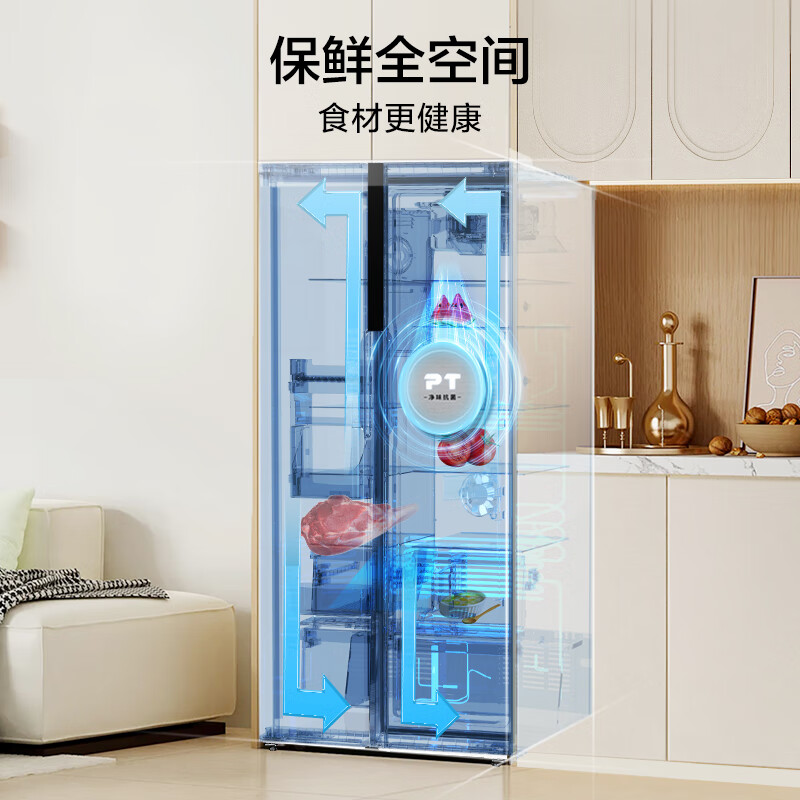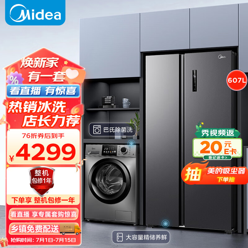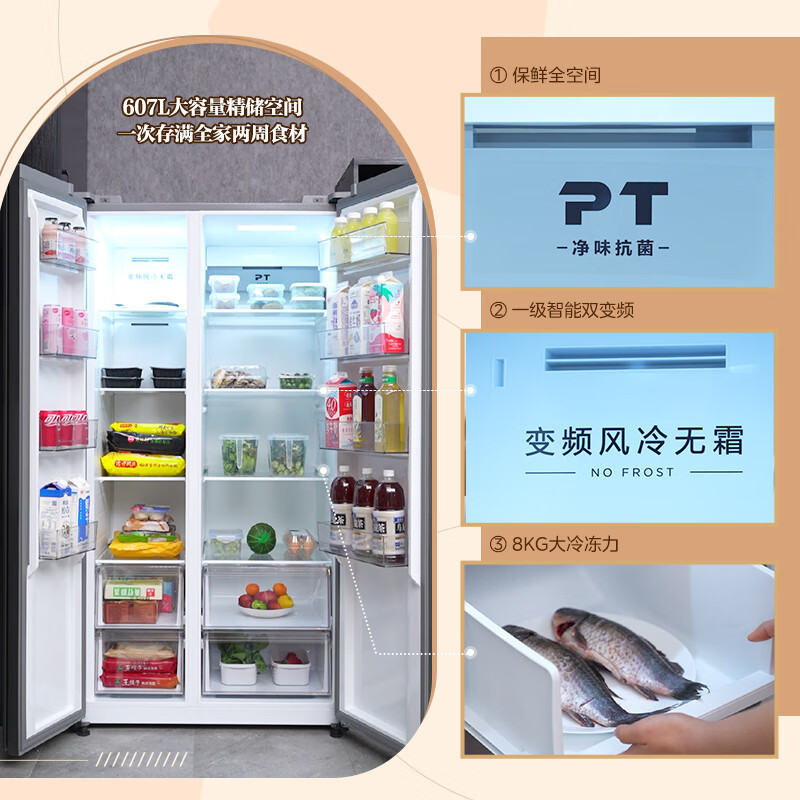 美的(Midea)607升变频一级能效对开门双开门家用智能电冰箱节能无霜净味超薄大容量BCD-607WKPZM(E)冷藏冷冻