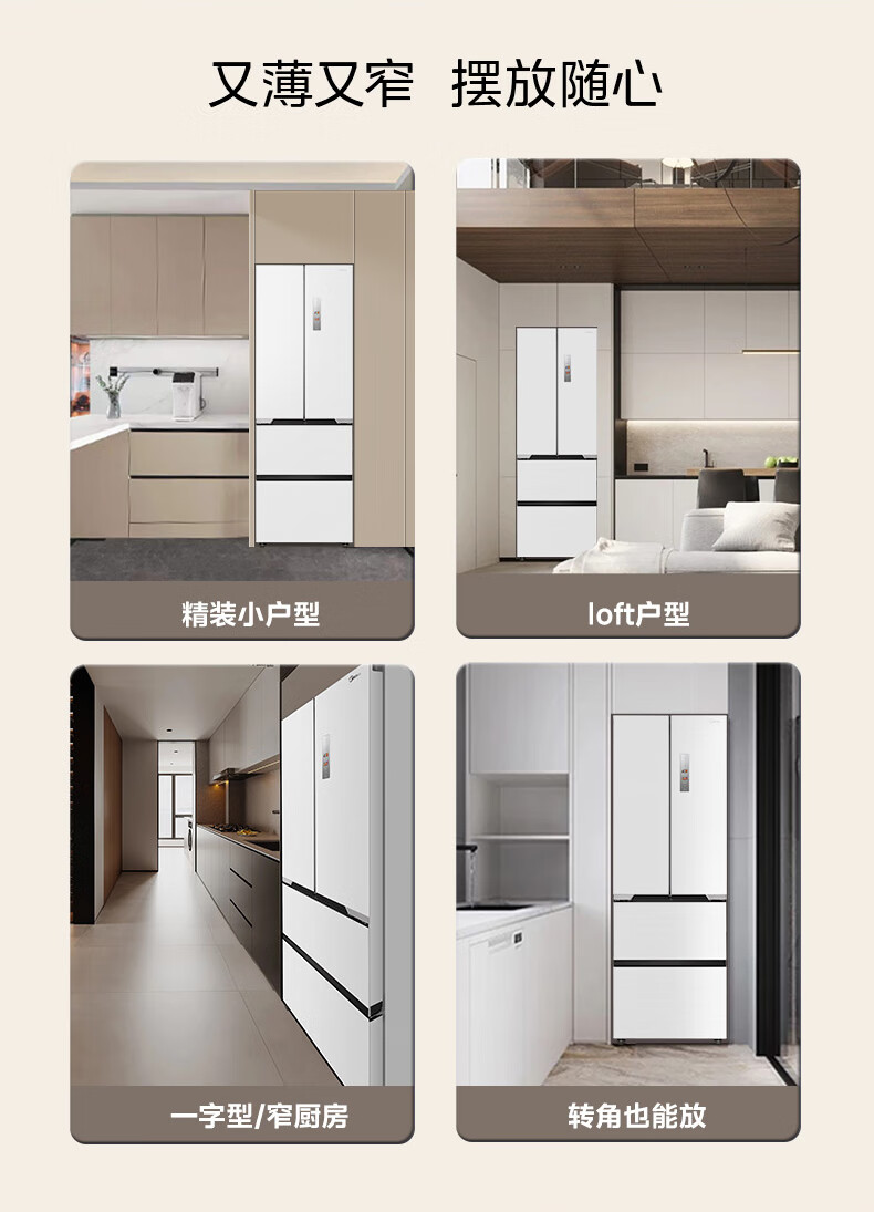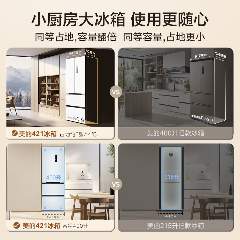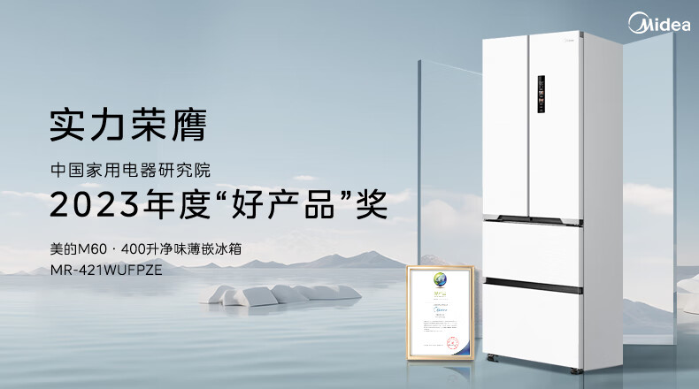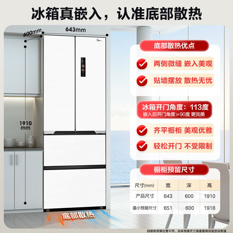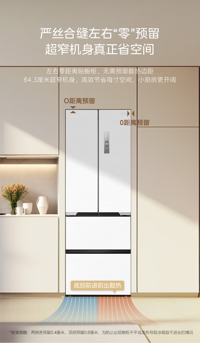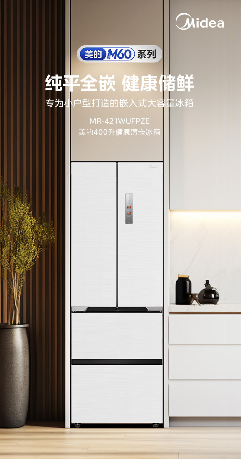 美的(Midea)M60大白豚421法式多门四开门超薄纯平全嵌一级变频除菌净味大容量家用电冰箱MR-421WUFPZE底部散热