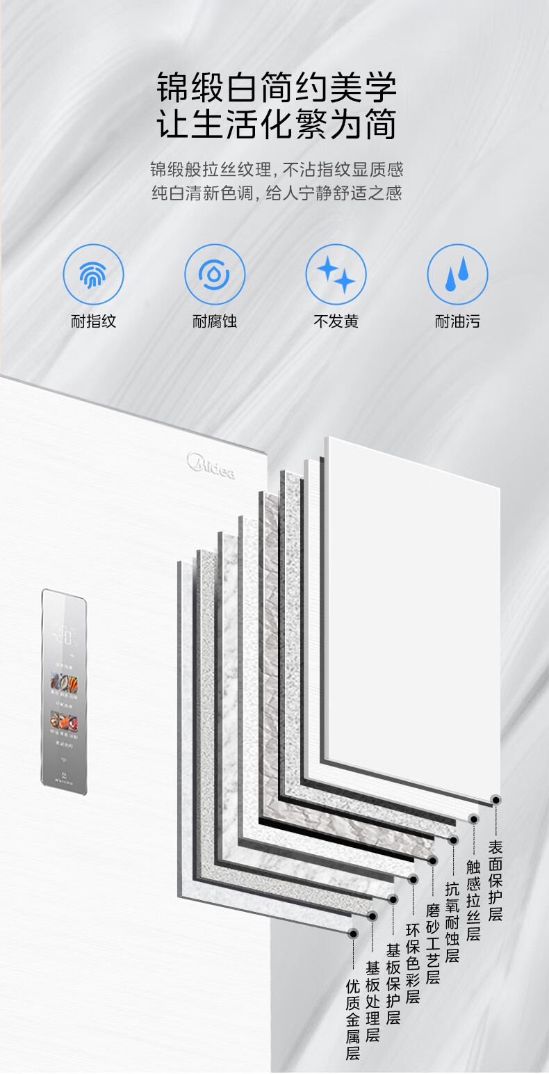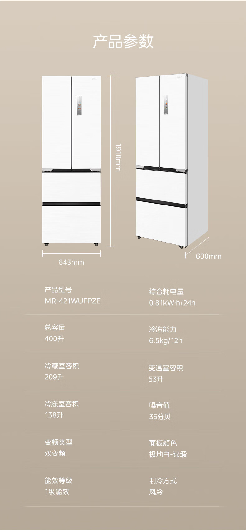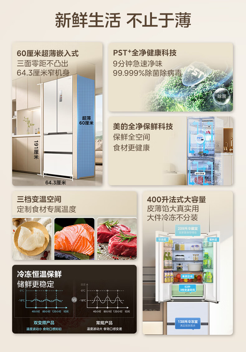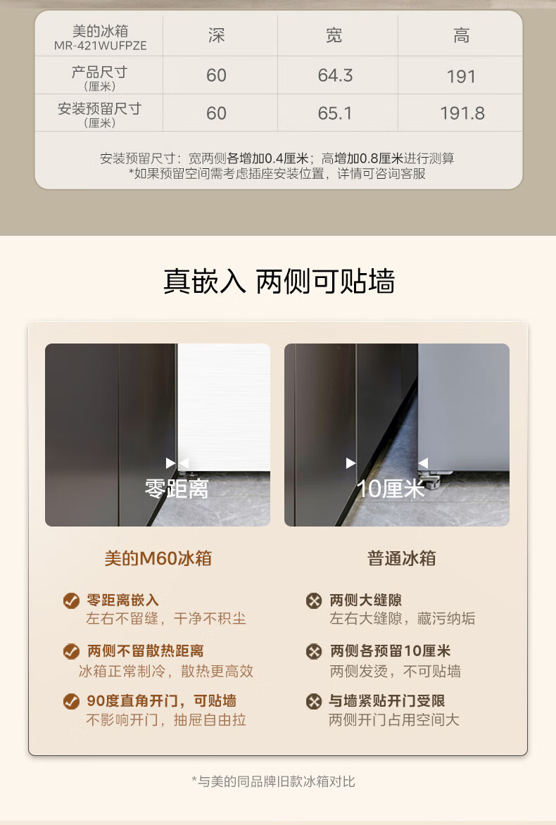 美的(Midea)M60大白豚421法式多门四开门超薄纯平全嵌一级变频除菌净味大容量家用电冰箱MR-421WUFPZE底部散热