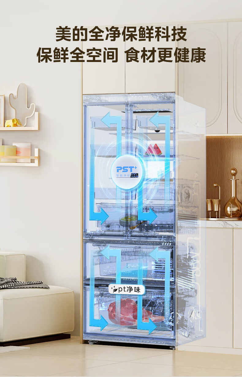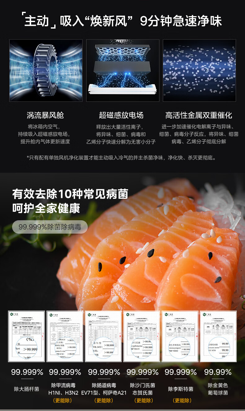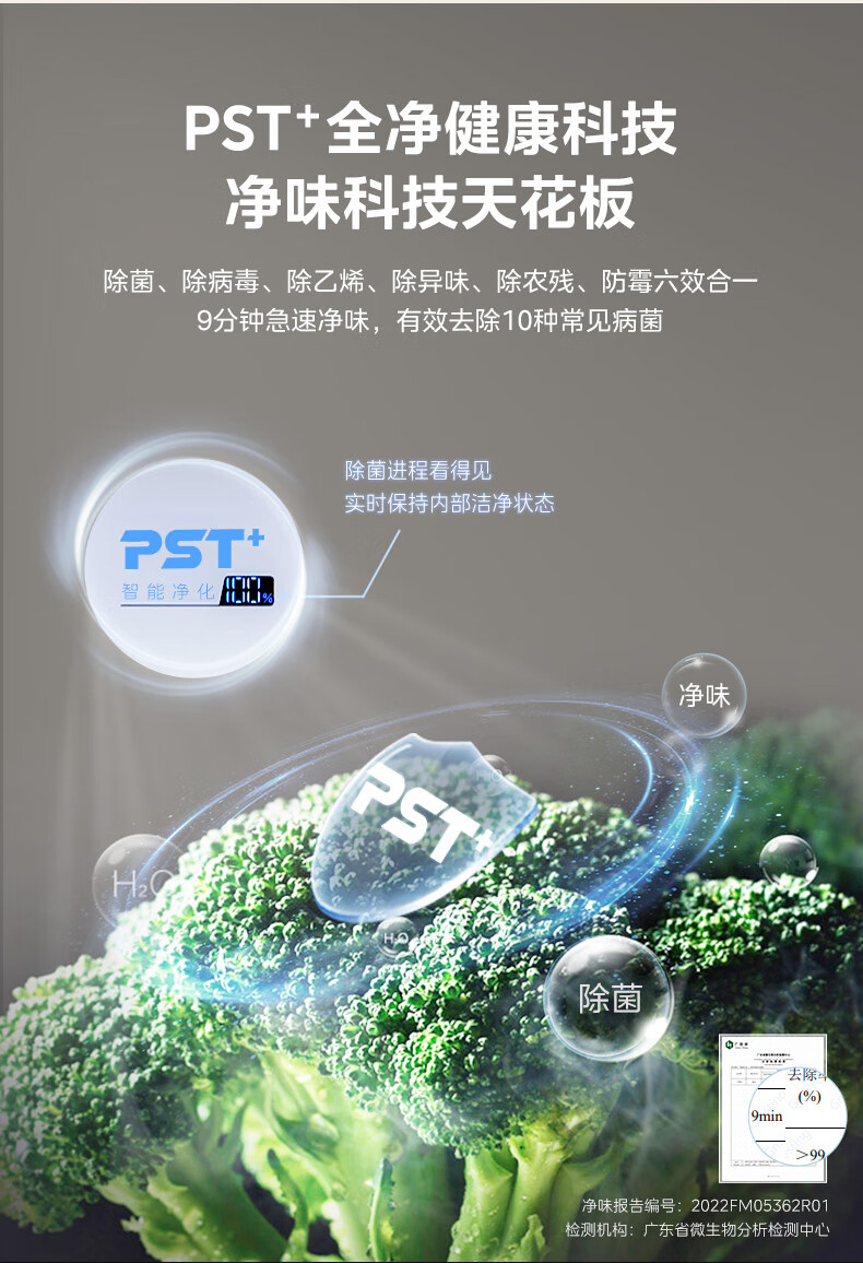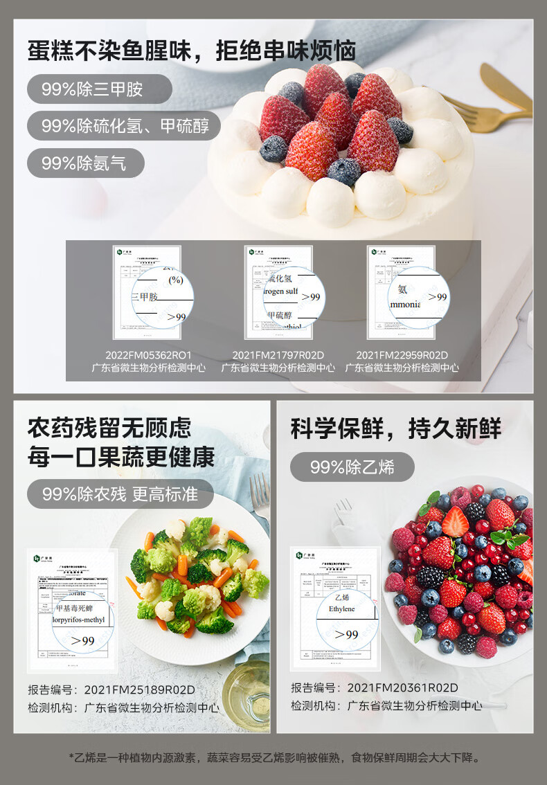 • 冷藏室除菌净味: 除菌;除乙烯;除病毒;除农残;净味