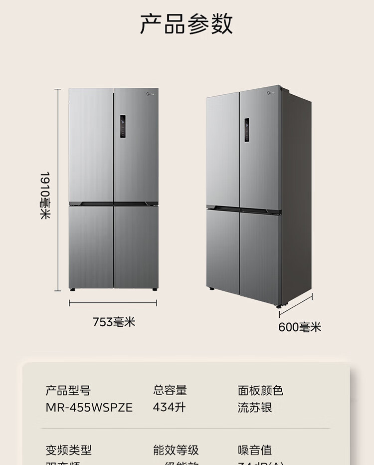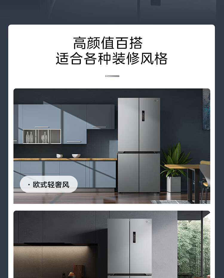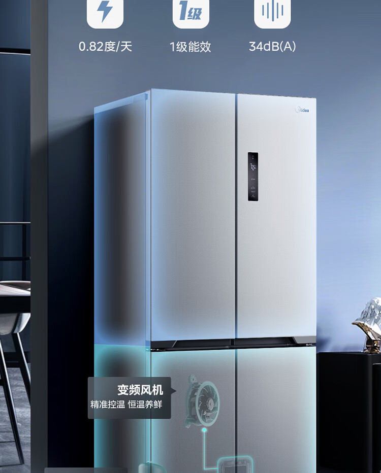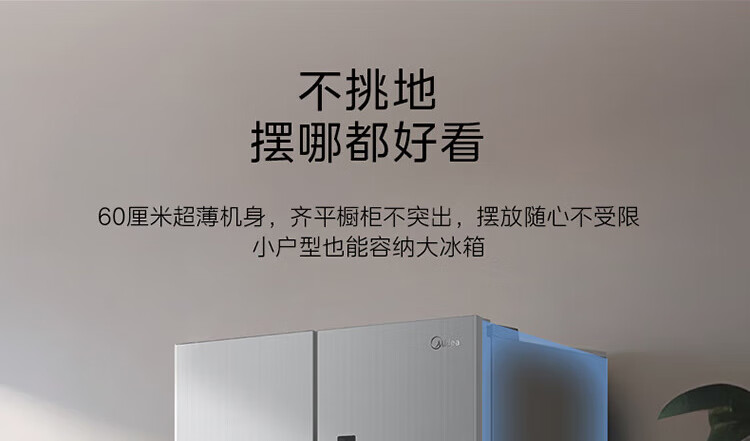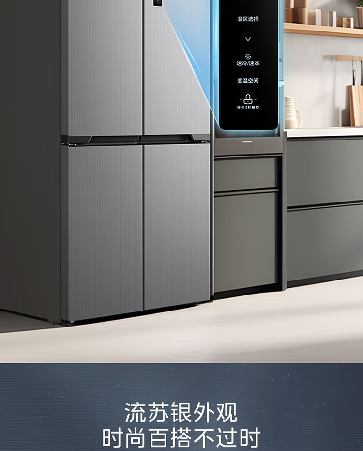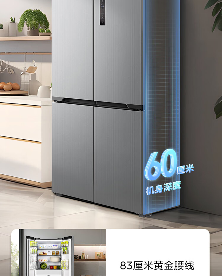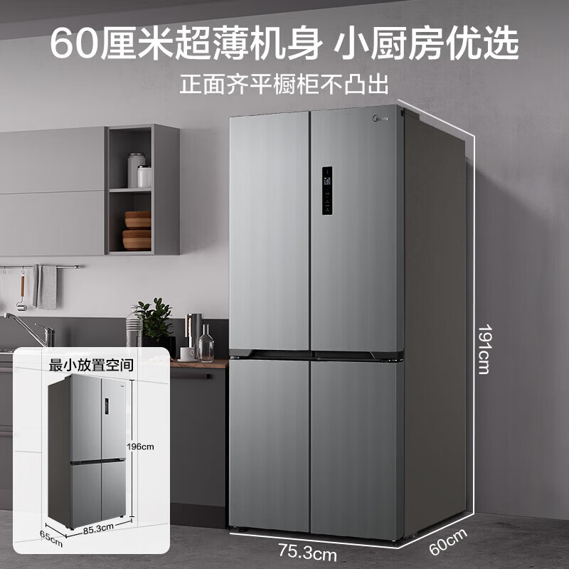 美的(Midea)M60系列60cm薄455流苏银十字双开门四开门一级变频风冷无霜智能家用大容量电冰箱MR-455WSPZE