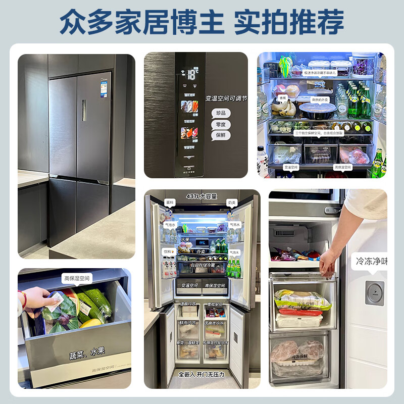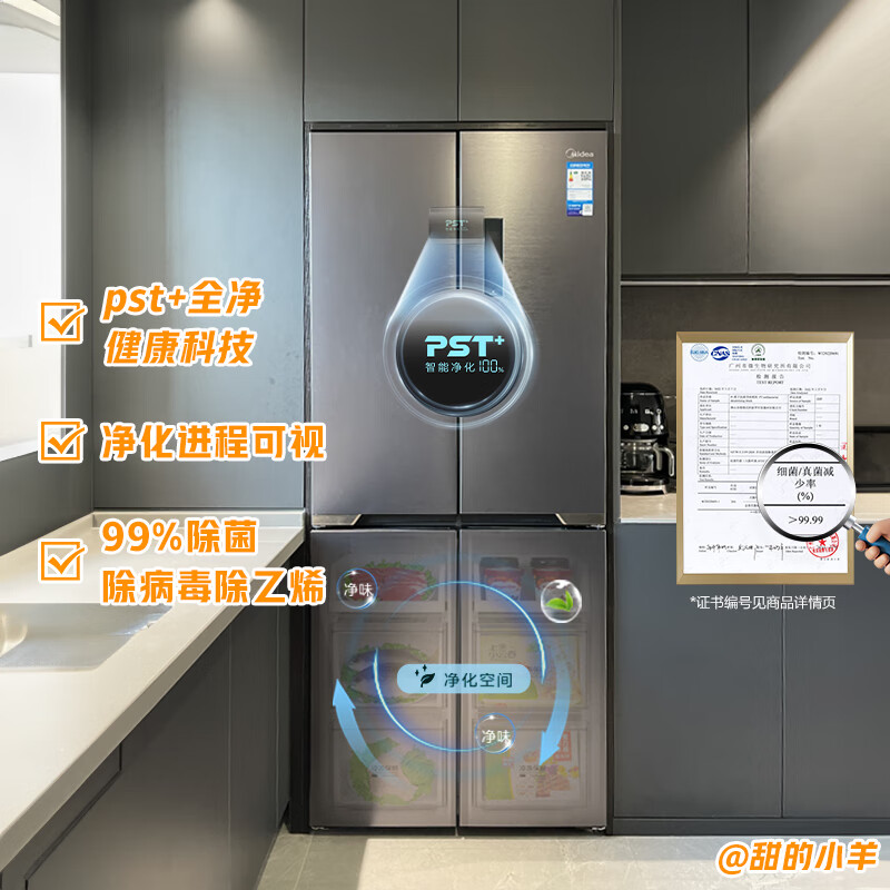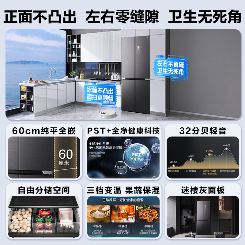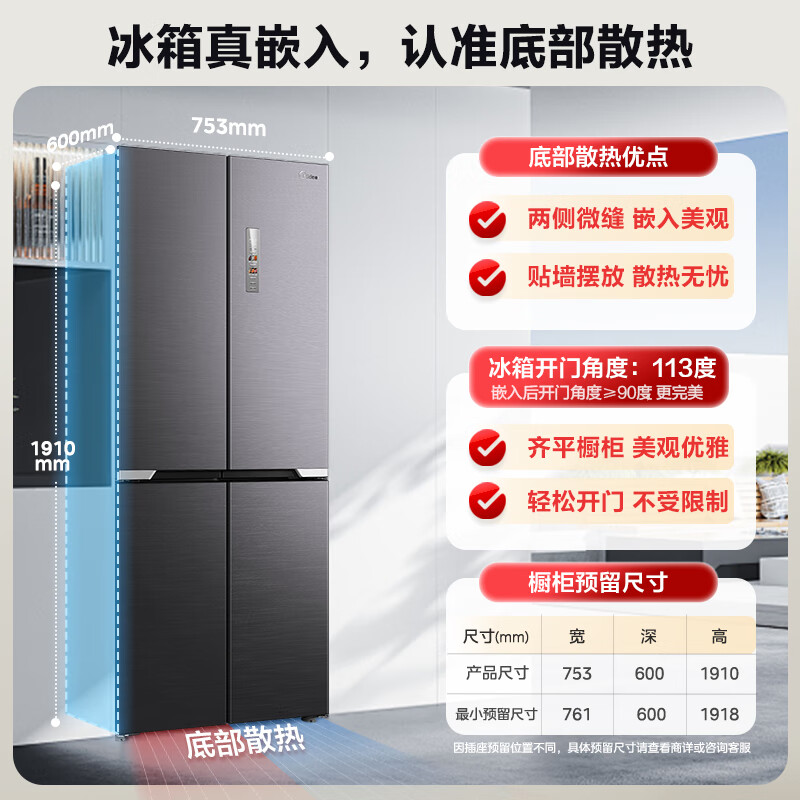 美的(Midea)M60系列458超薄纯平全嵌十字对开四开门净味除菌底部散热风冷无霜一级变频家用电冰箱MR-458WUSPZE