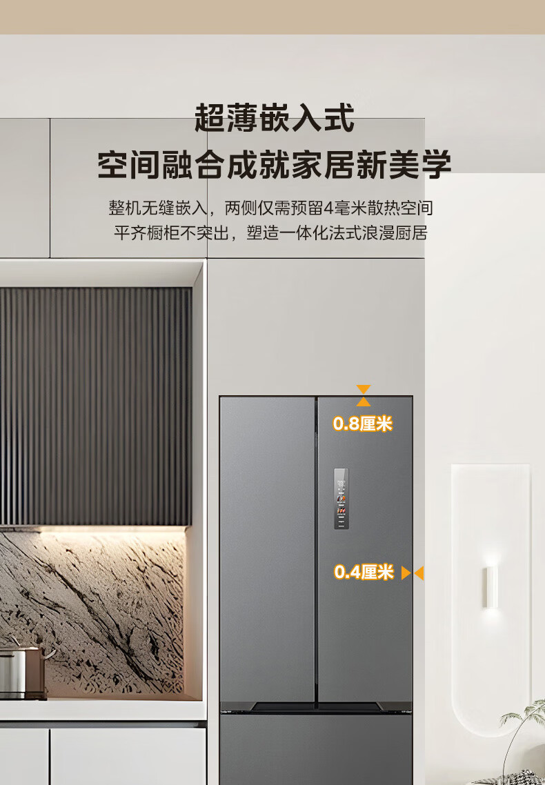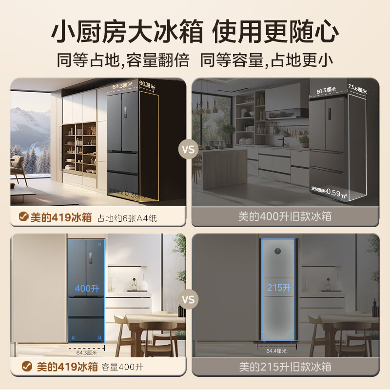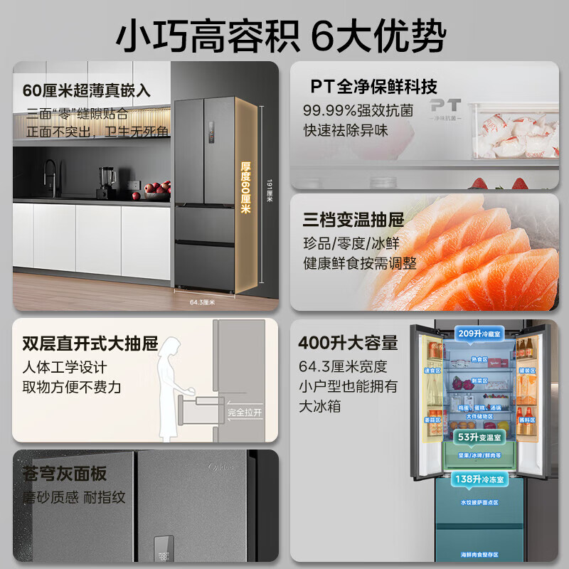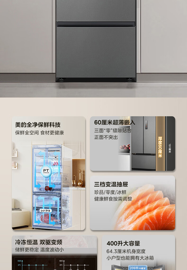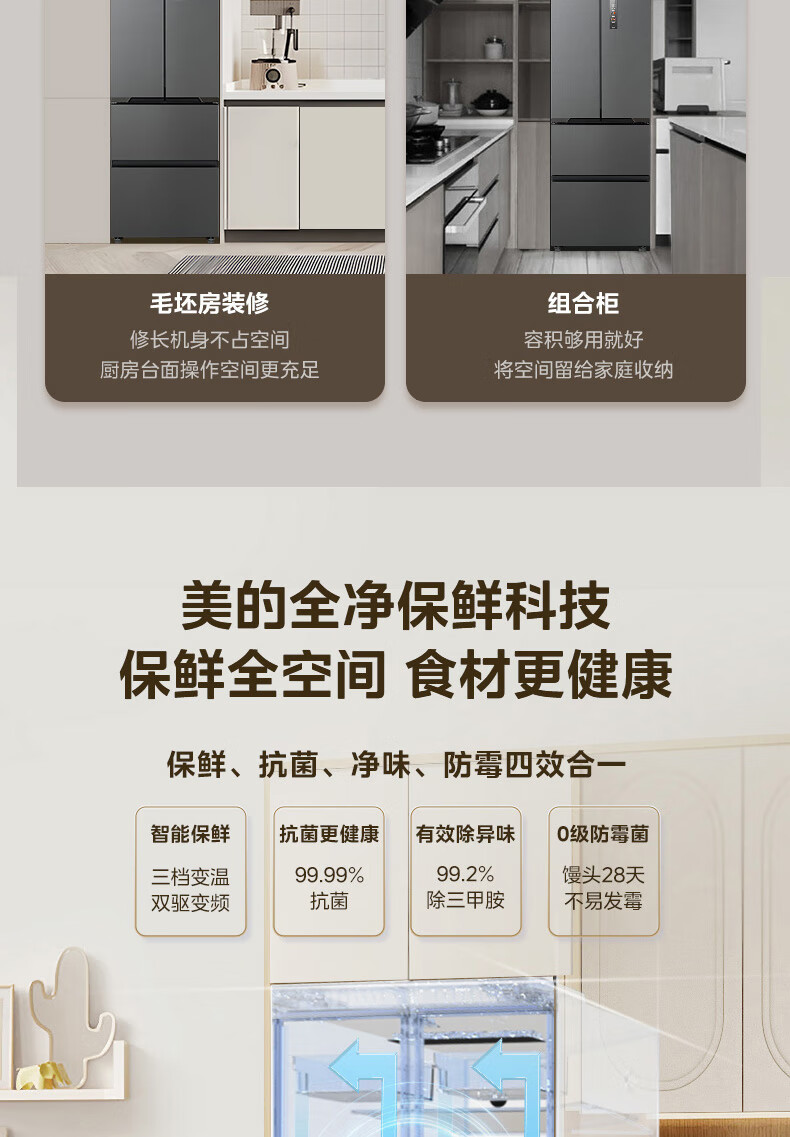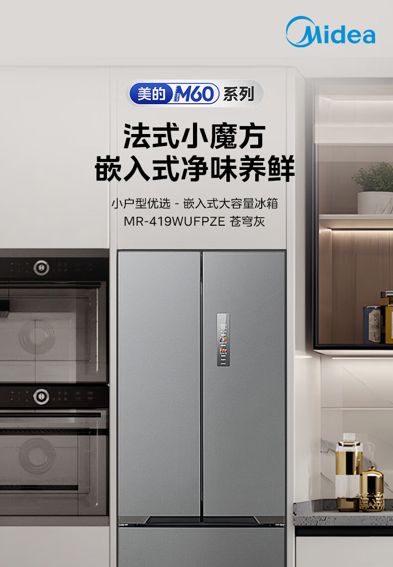 美的(Midea)M60系列419法式多门四开门电冰箱超薄纯平全嵌底部散热小户型大容量变频无霜家用智能MR-419WUFPZE